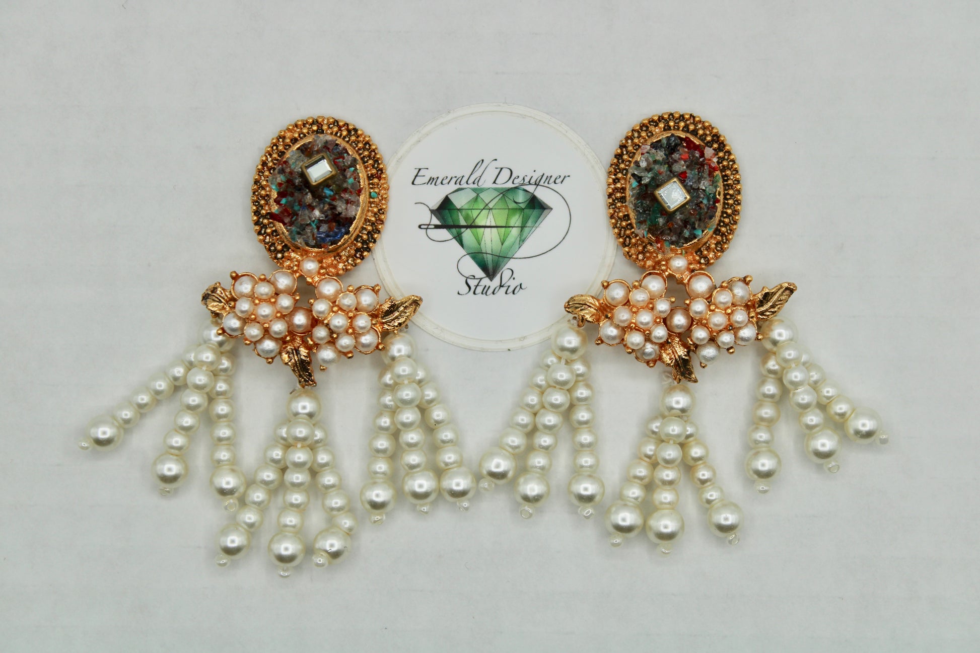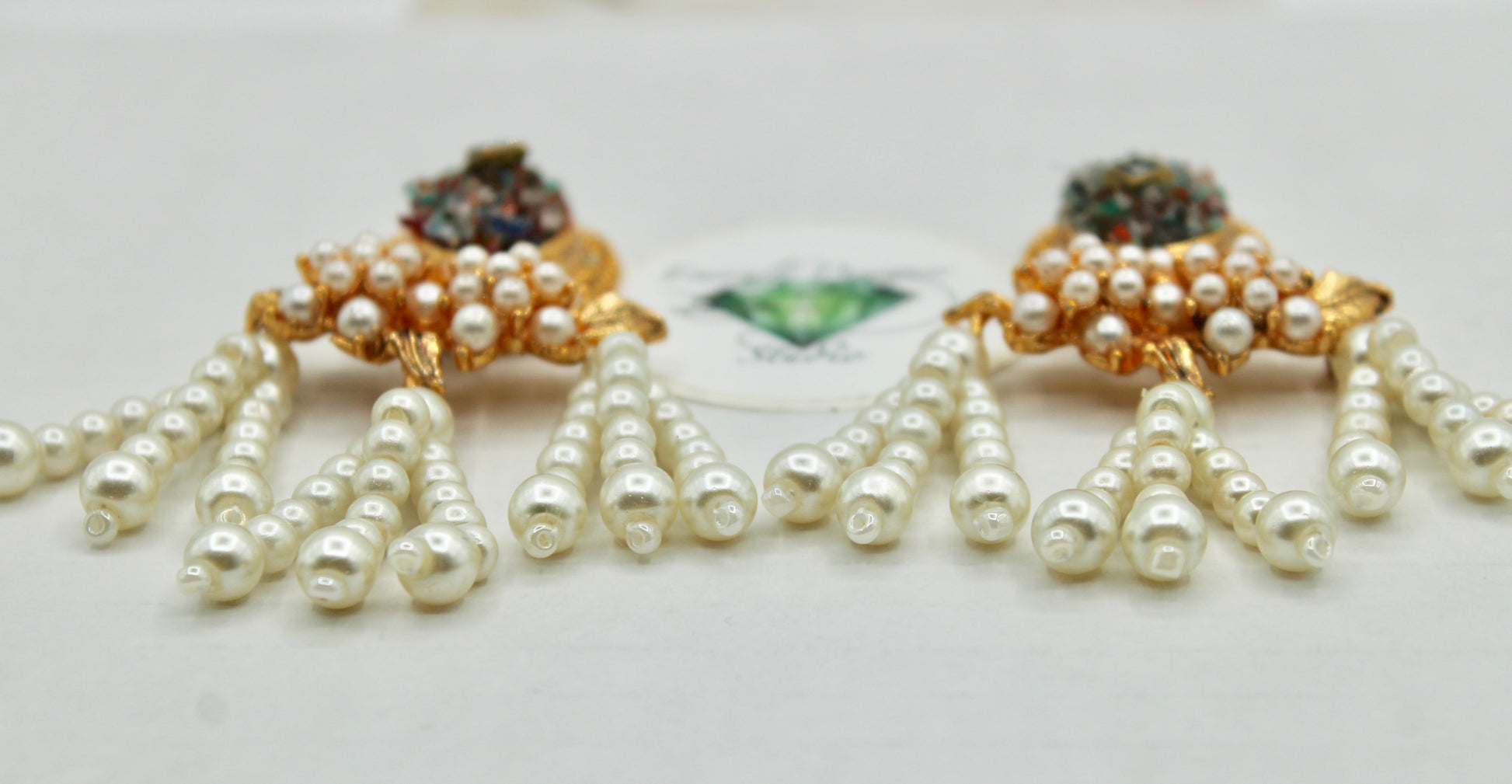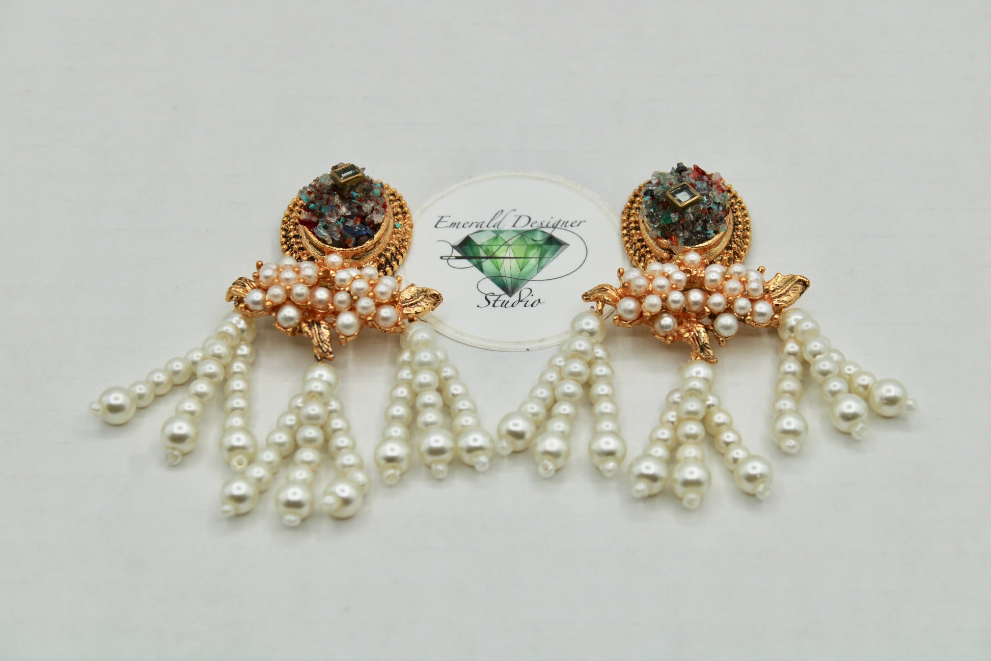 These unique earrings are made of iridescent crushed stone and faux pearl detailing throughout.