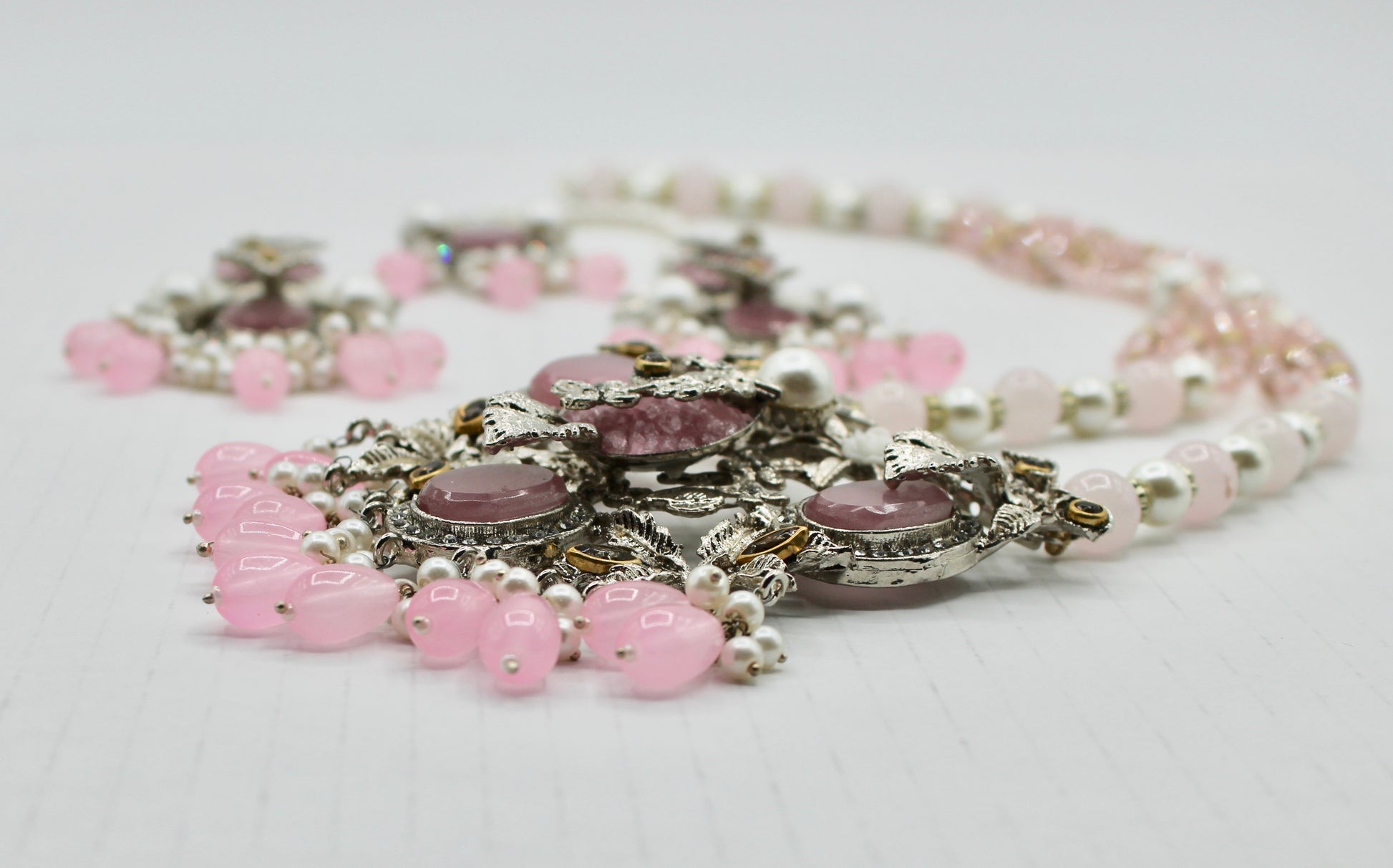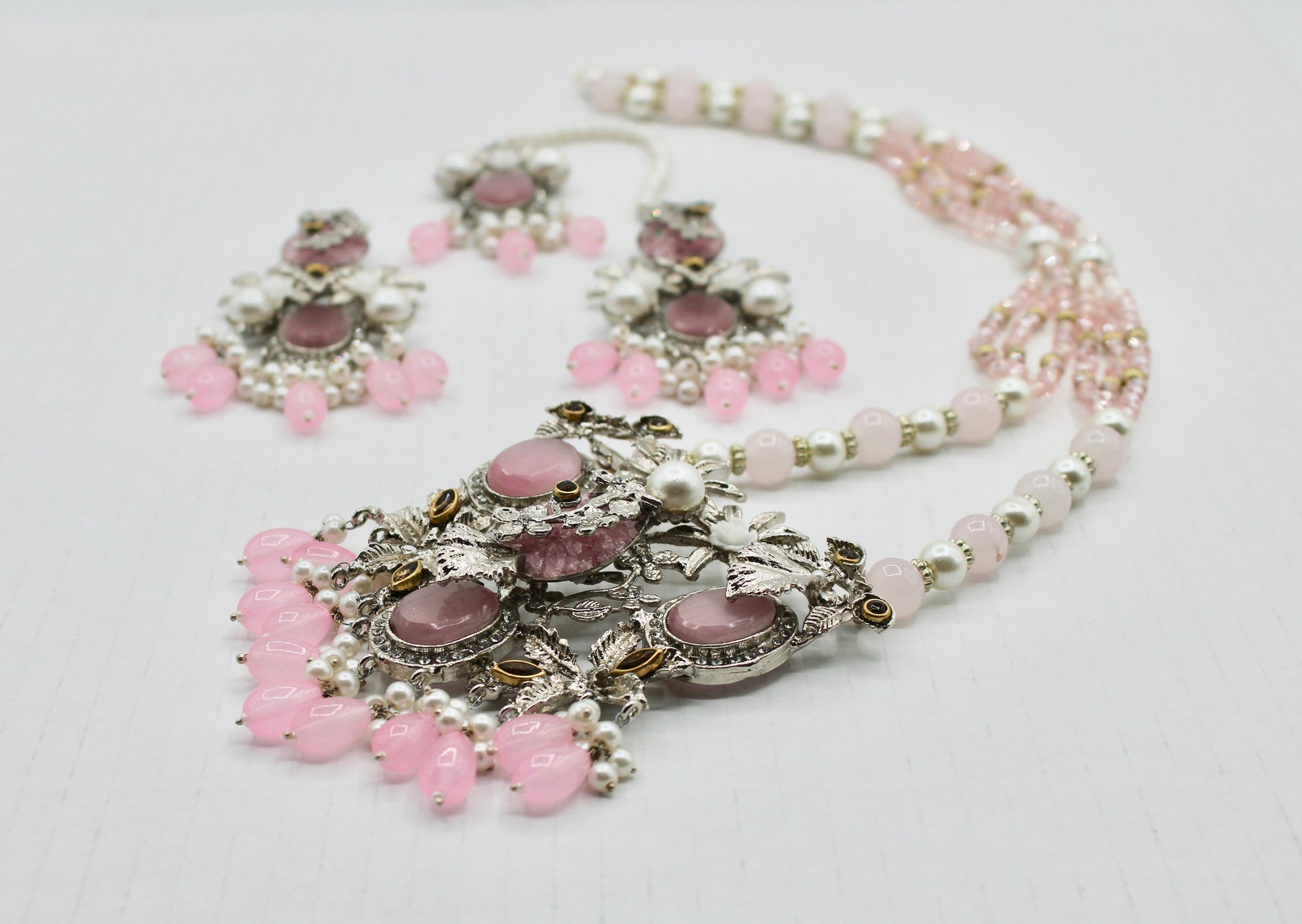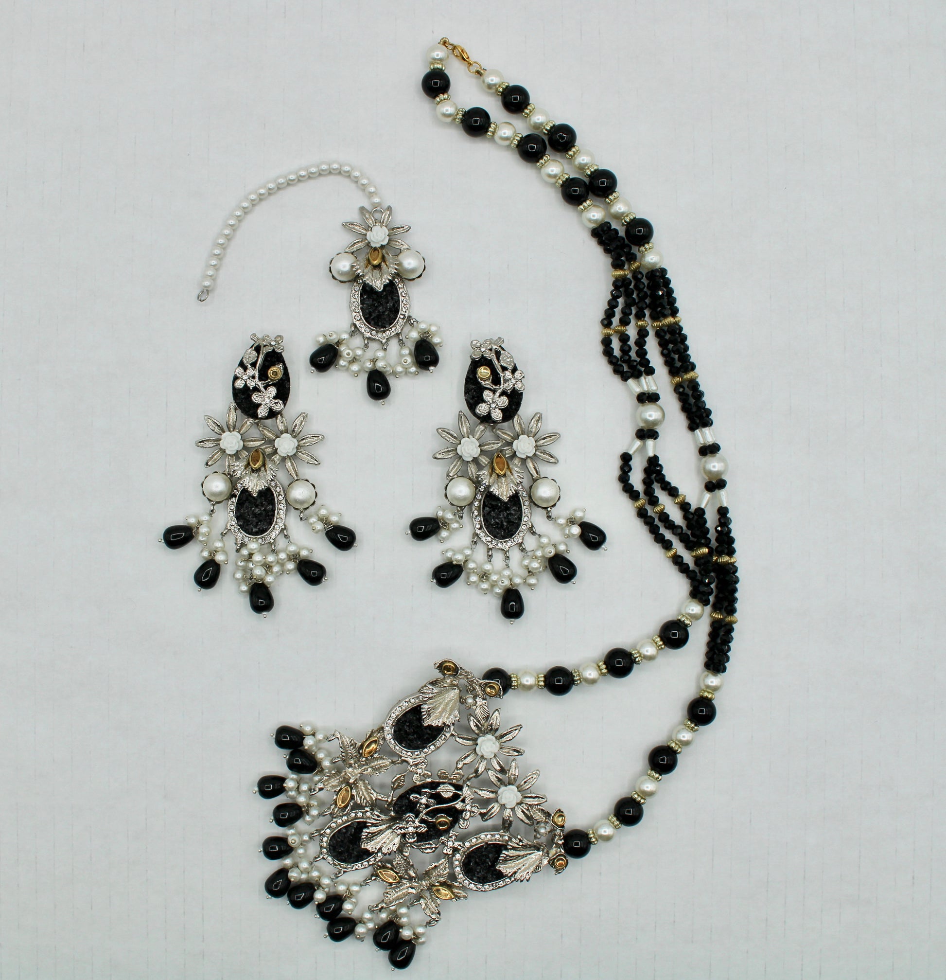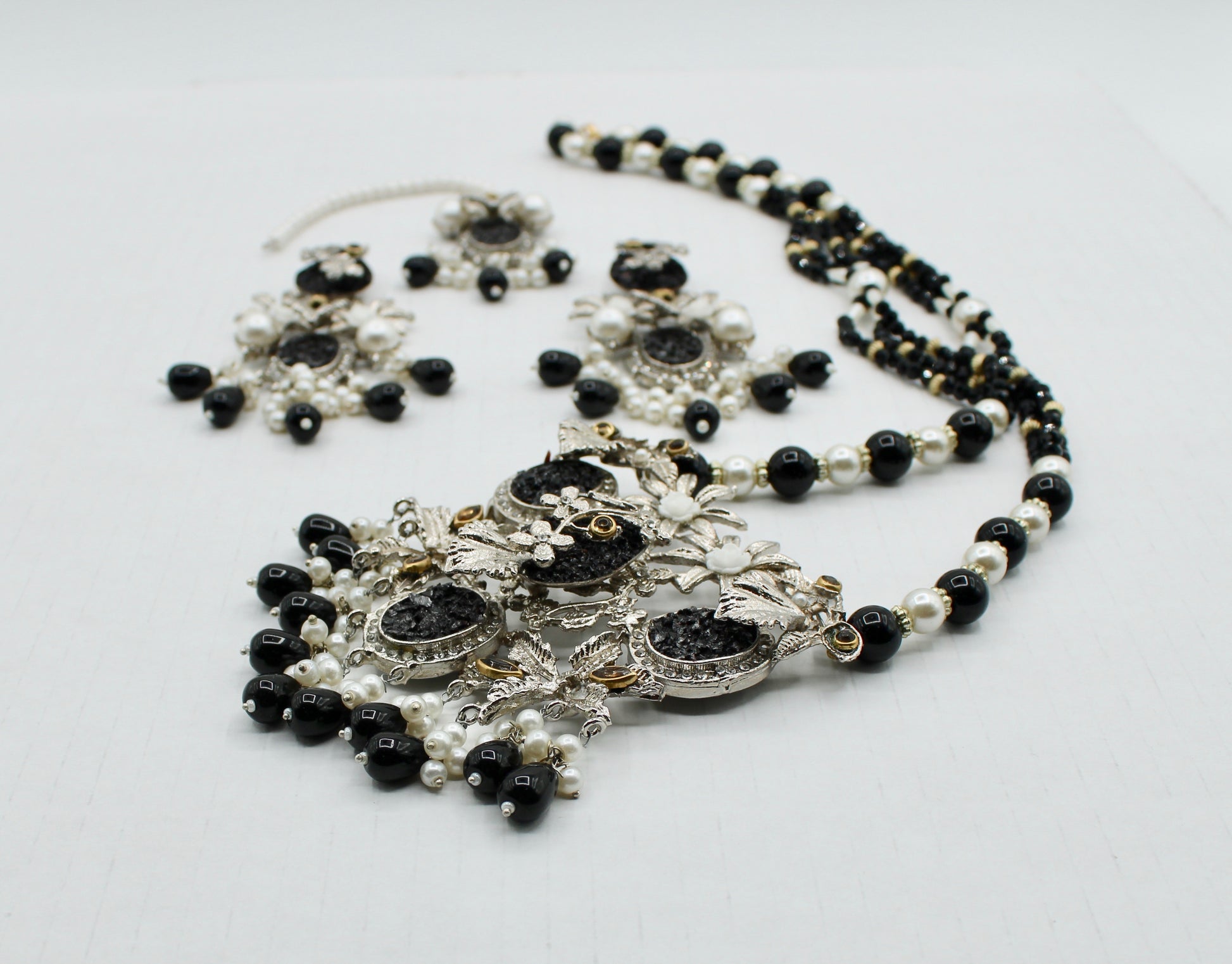 This delicate fusion crushed stone maala set is complete with kundan, faux pearls, beads, and floral detailing throughout. It includes matching earrings and a teeka. Available in two colours.