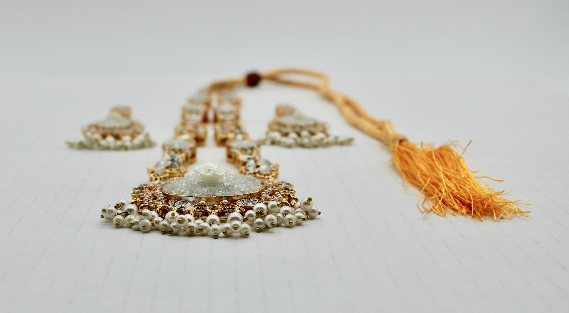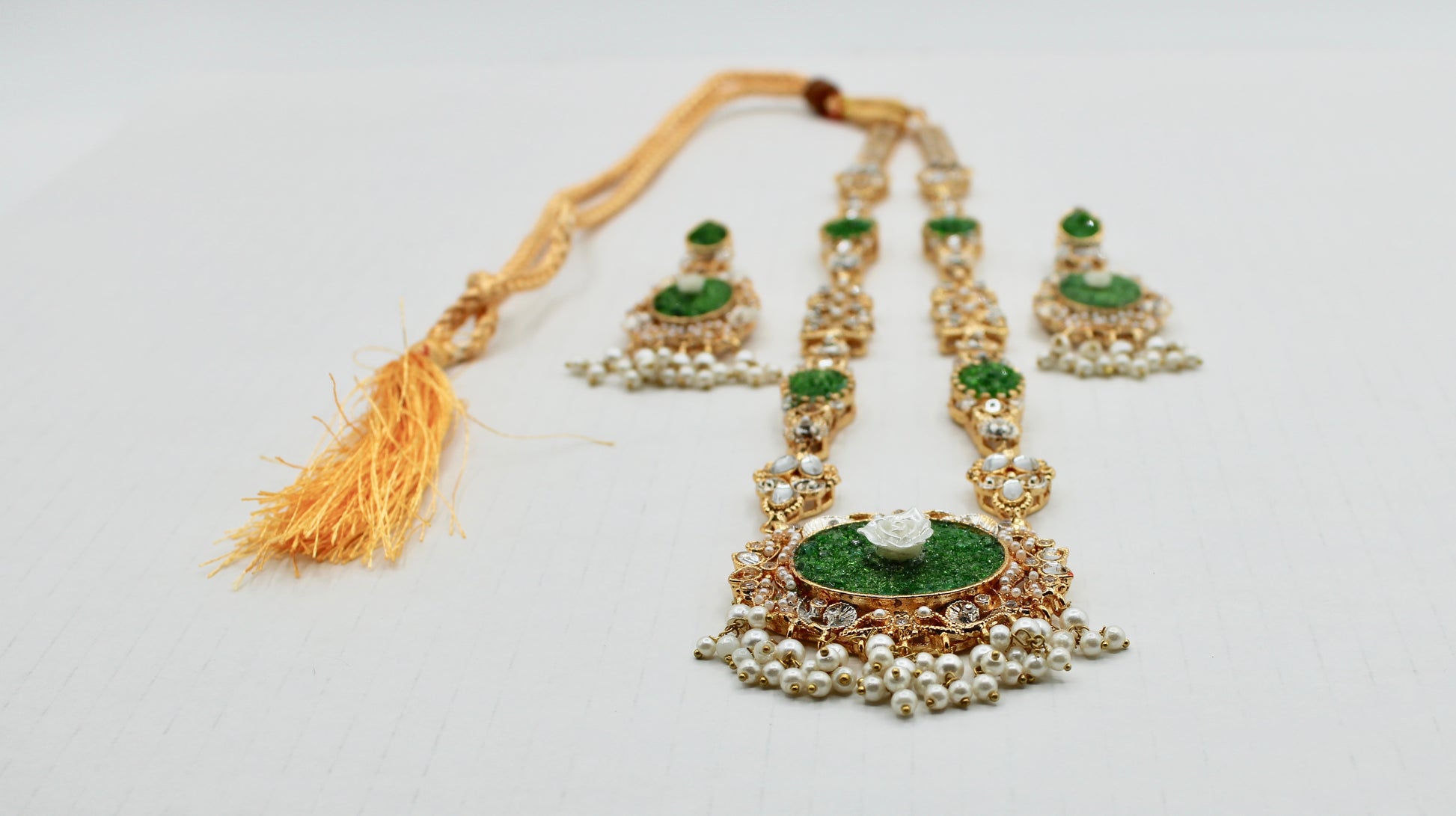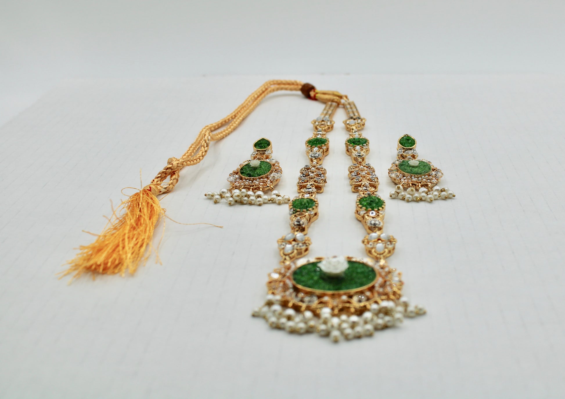 This dainty maala set is fusion kundan and crushed stone, complete with faux pearl detailing throughout. This set included matching earrings. The set is available in two colours.