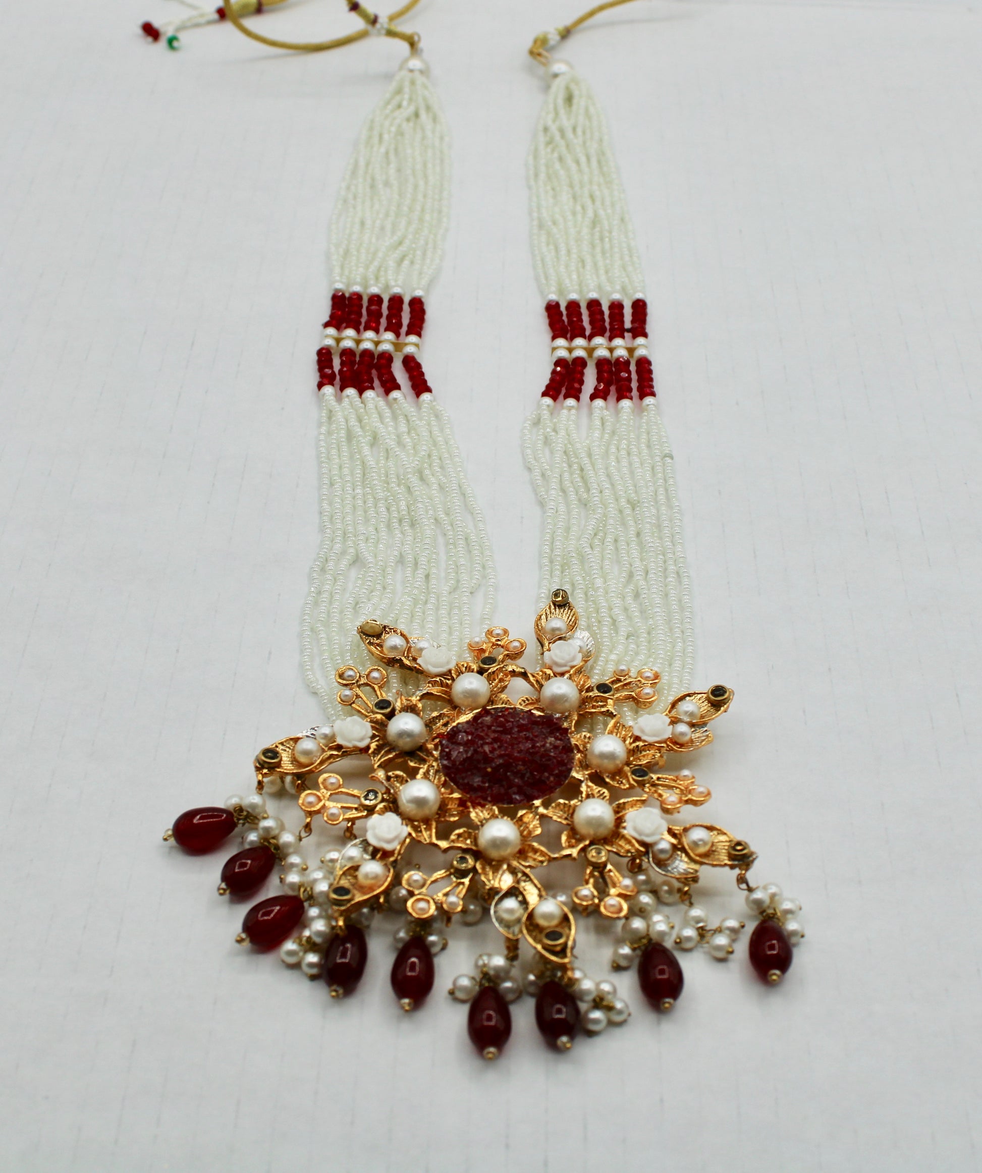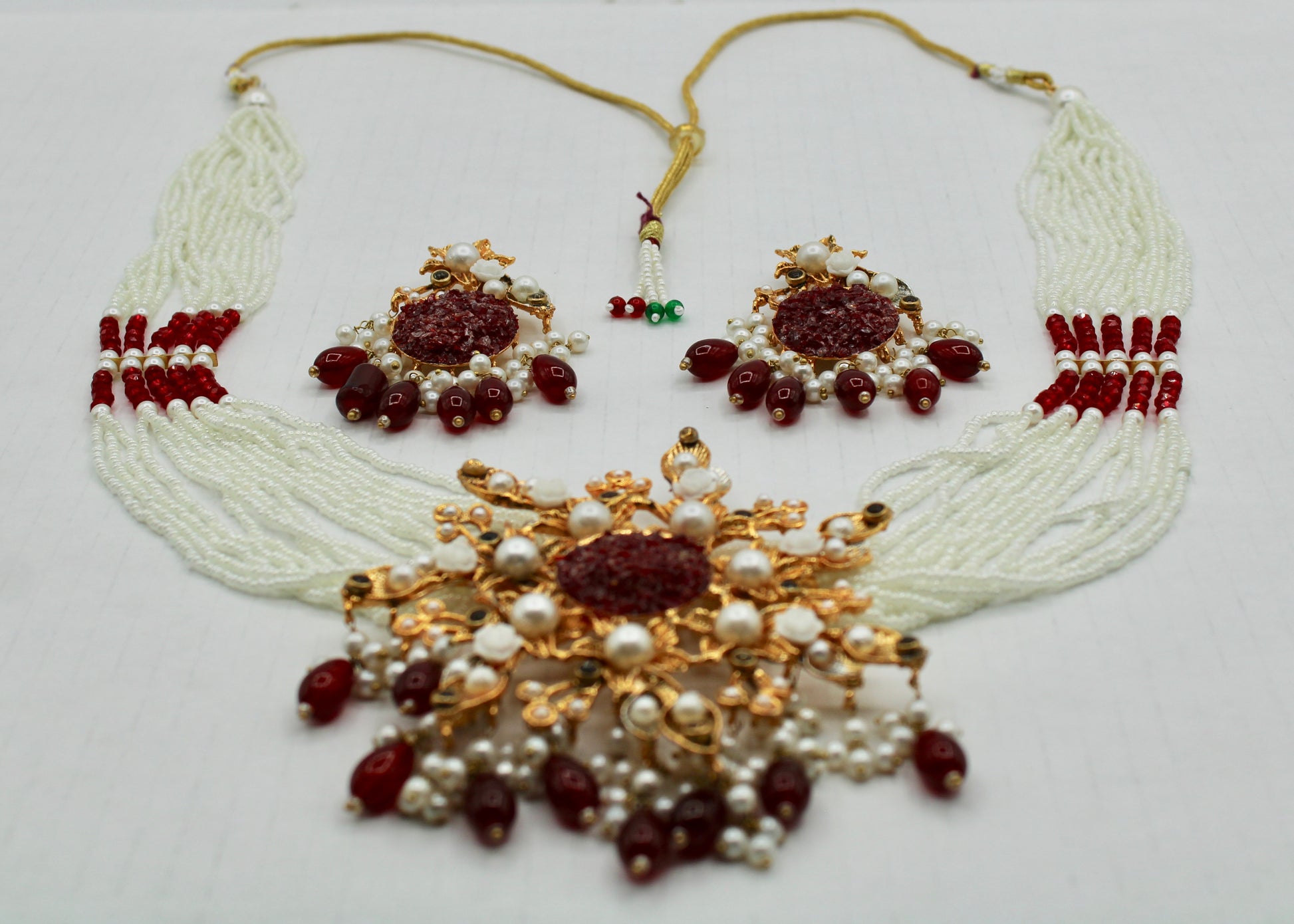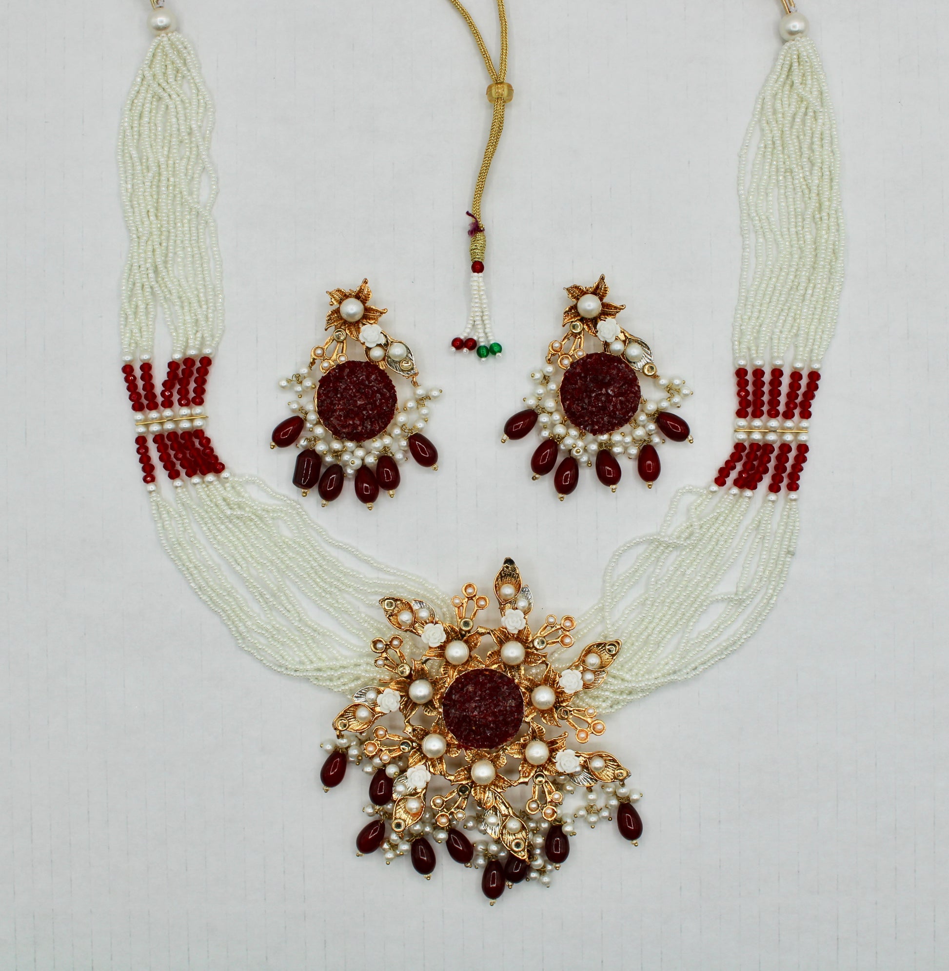 This stunning fusion crushed stone maala set is complete with faux pearl and bead detailing throughout. This set includes matching earrings.