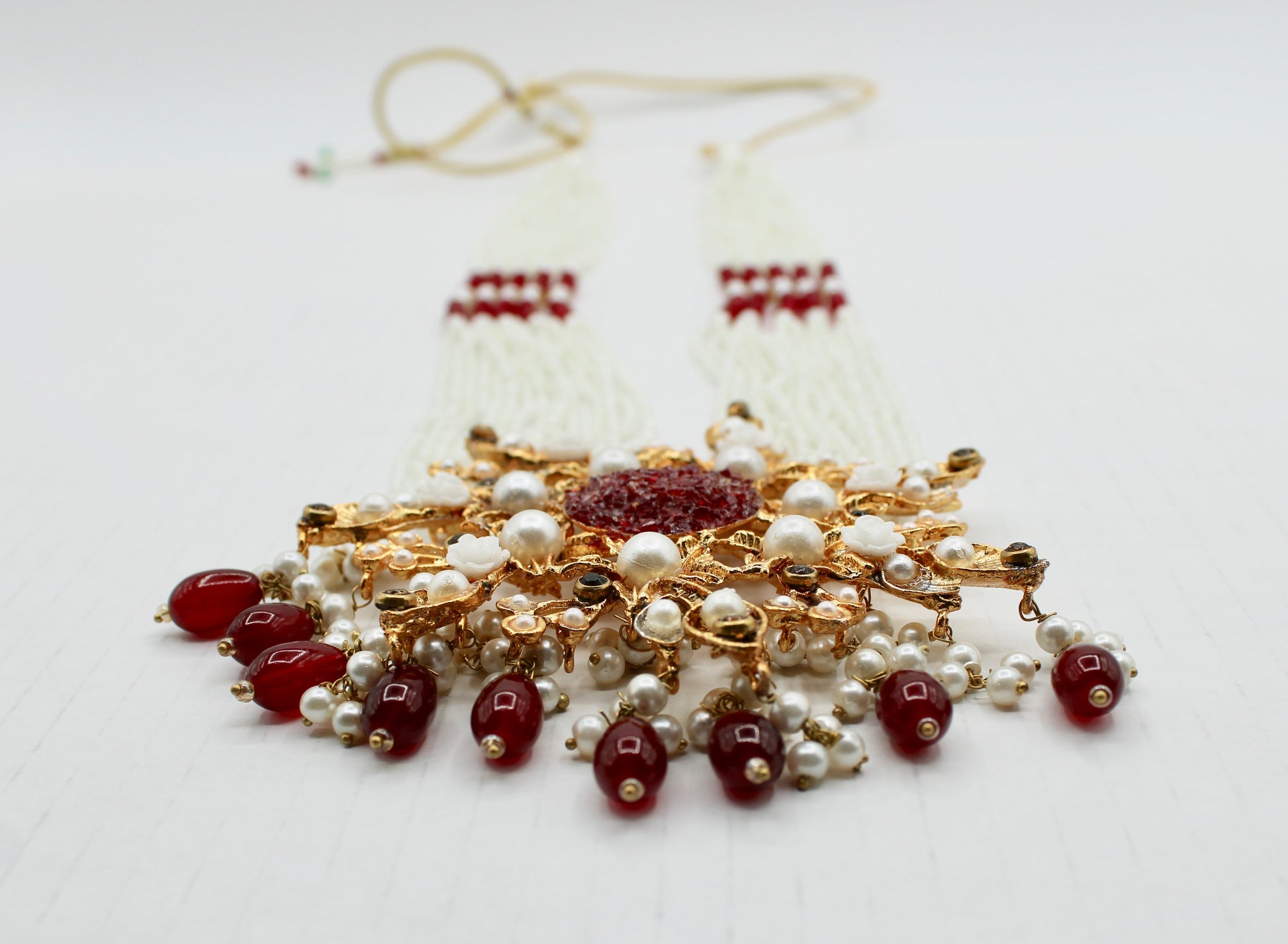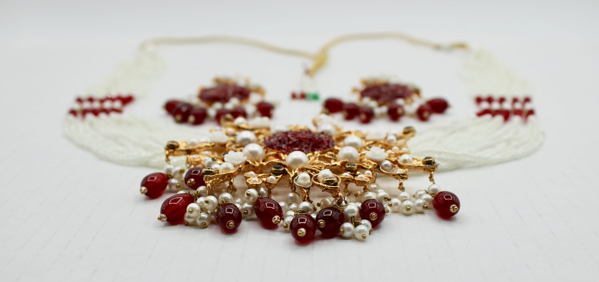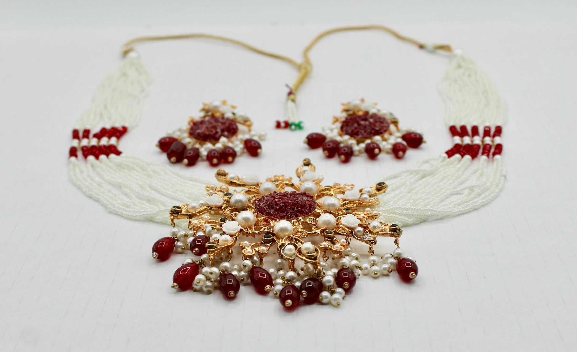 This stunning fusion crushed stone maala set is complete with faux pearl and bead detailing throughout. This set includes matching earrings.