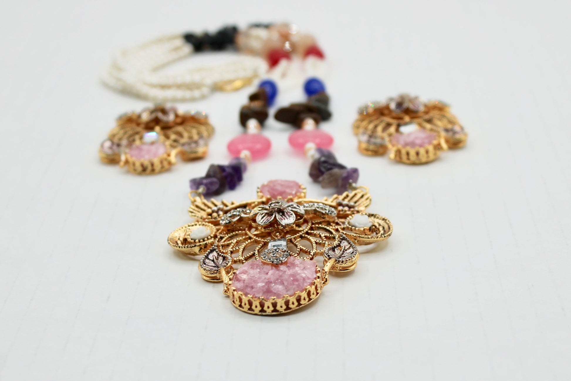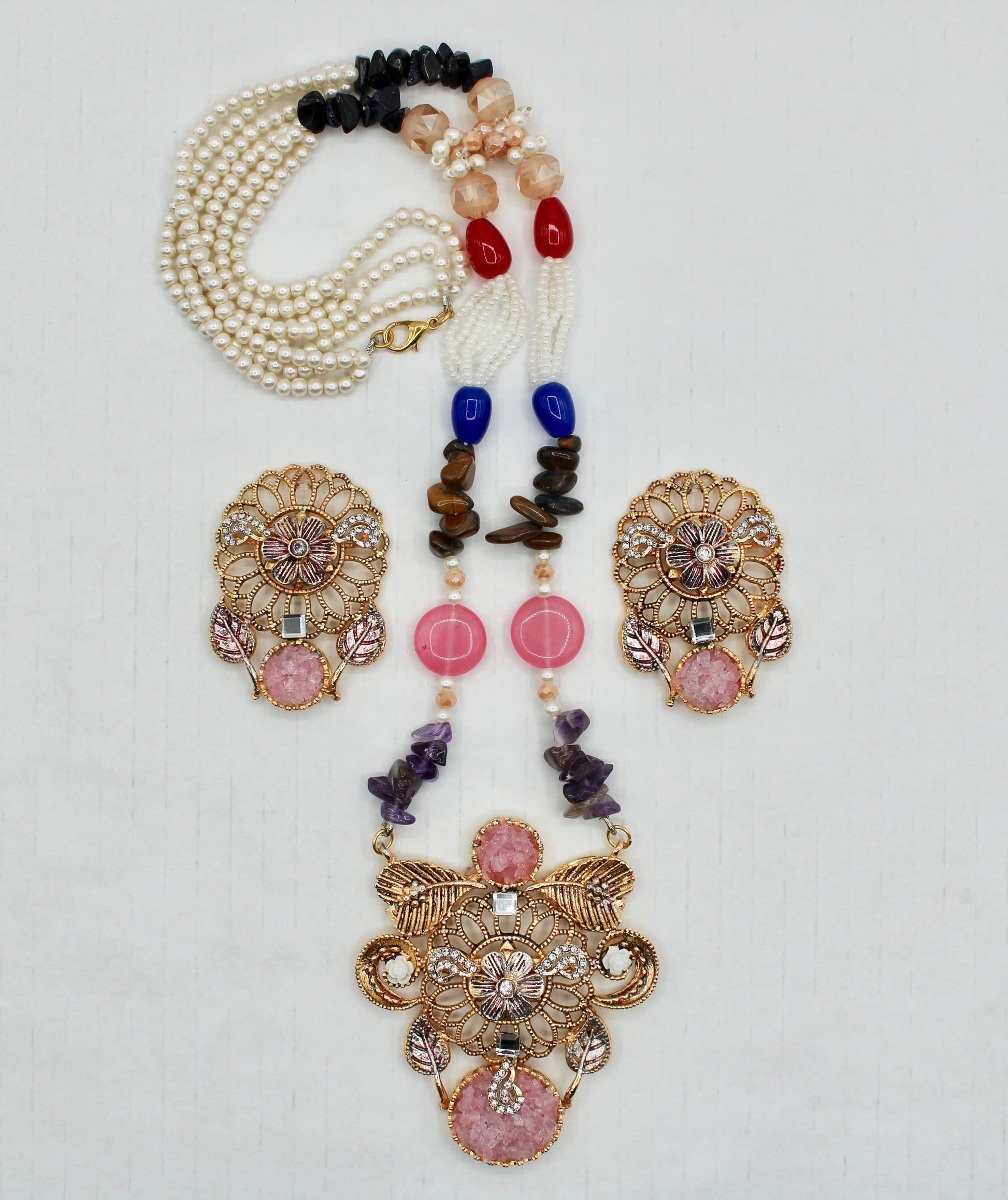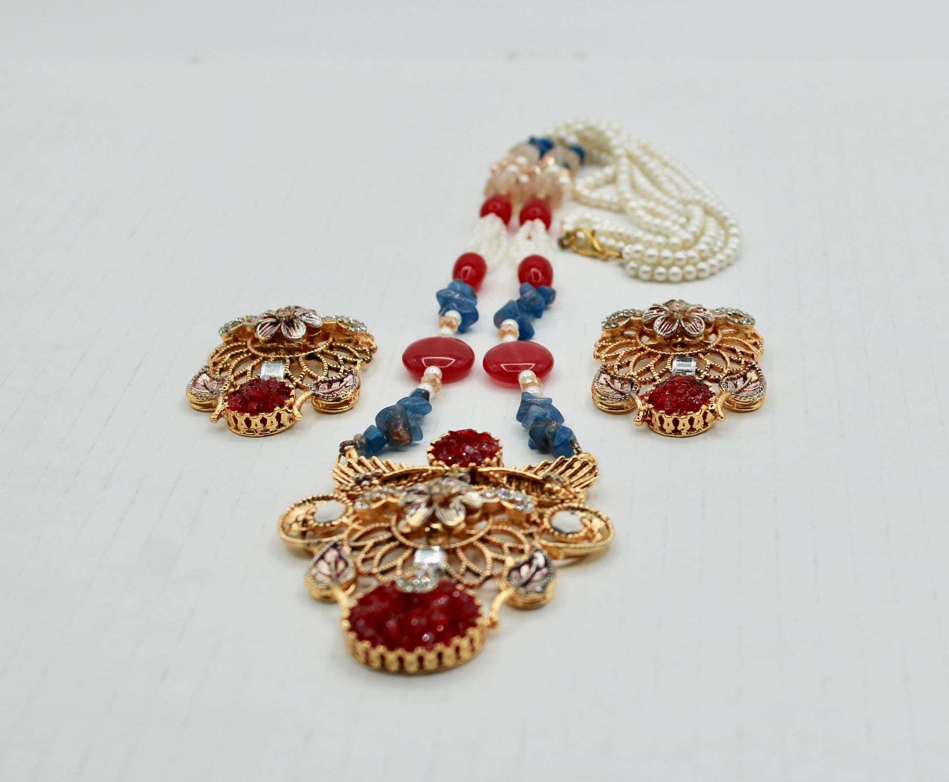 These unique fusion kundan and crushed stone maala sets are complete with faux pearl and bead detailing throughout. Each set includes matching earrings, and can be worn with both Eastern and Western outfits. Available in two colours.