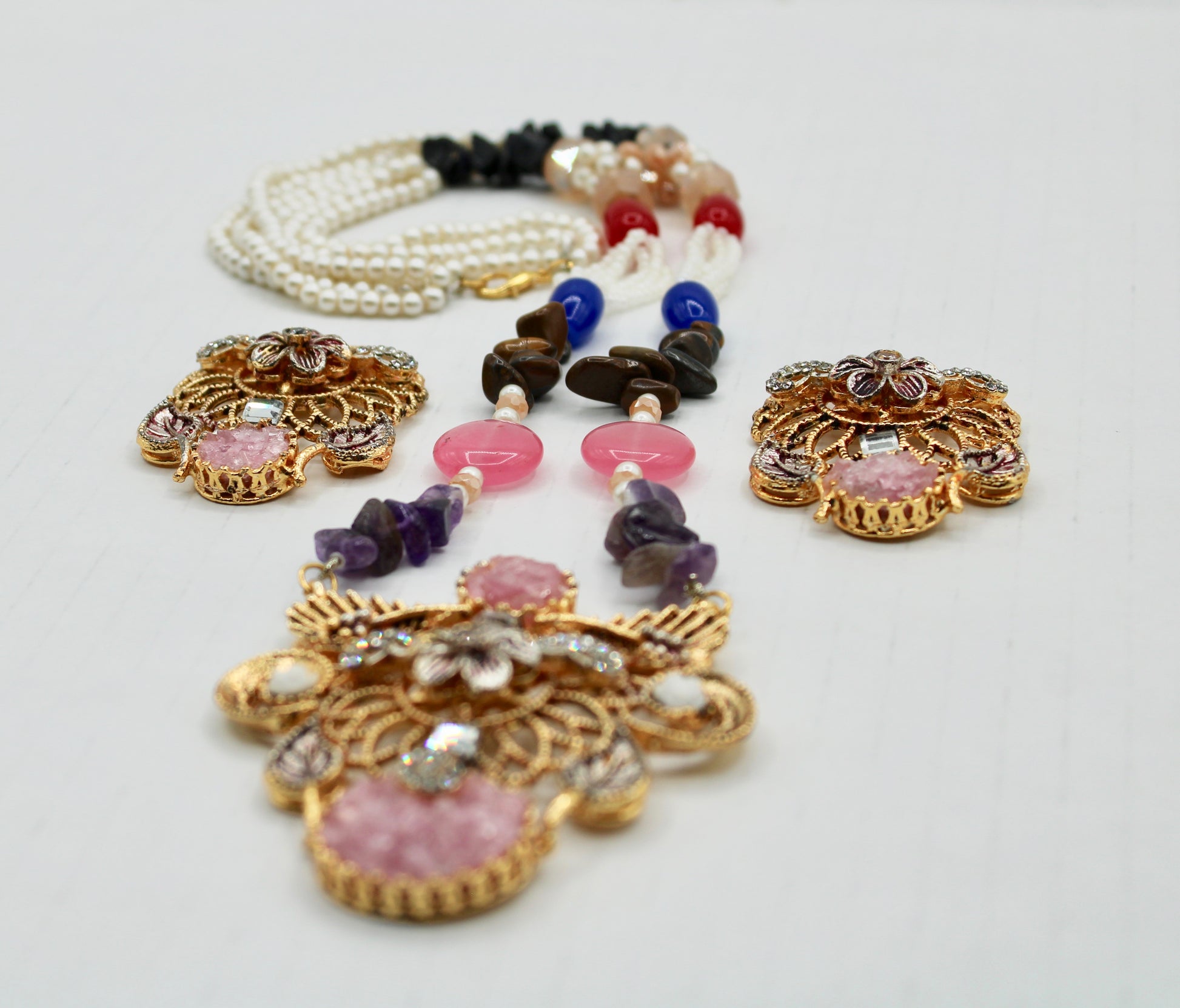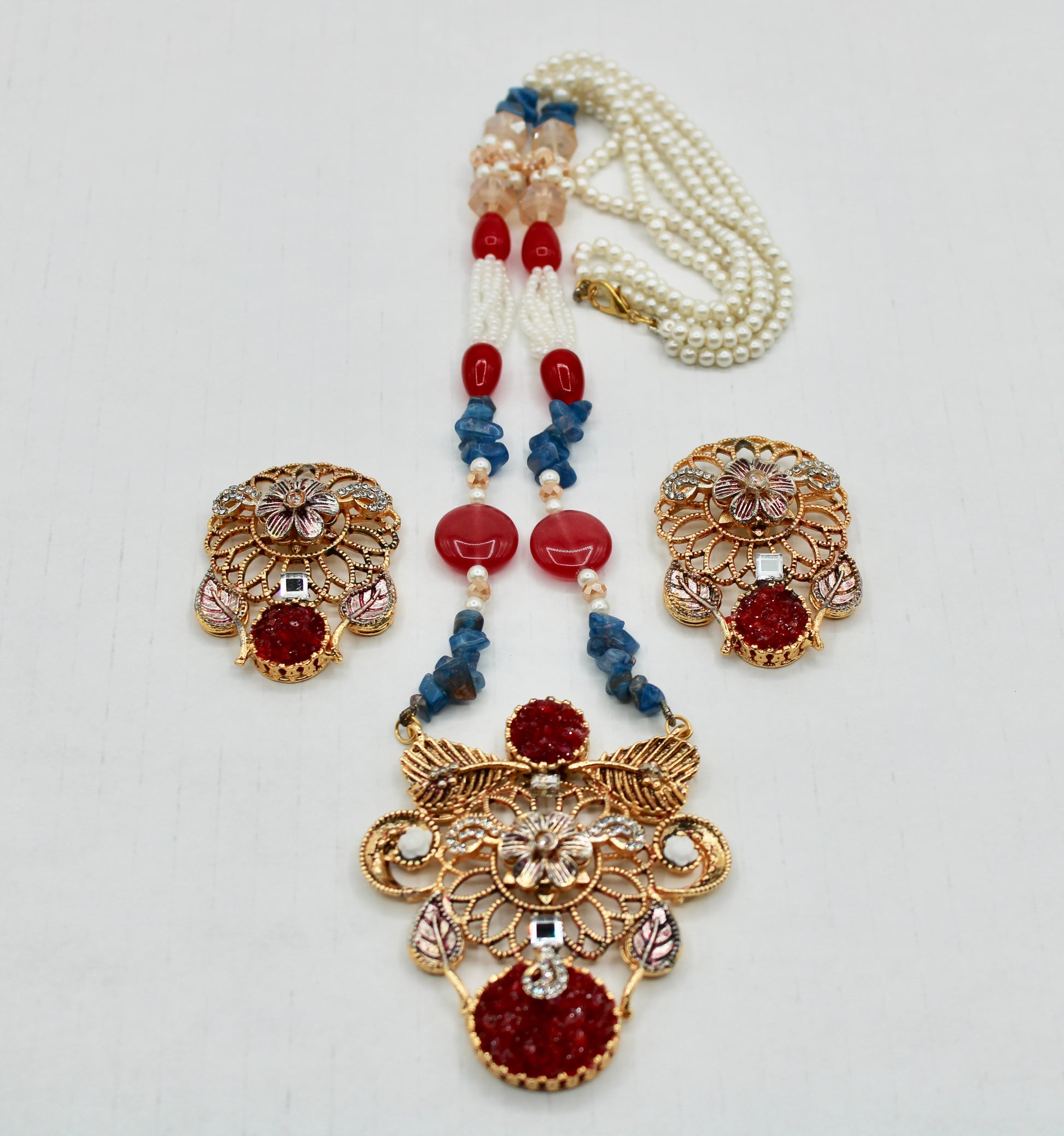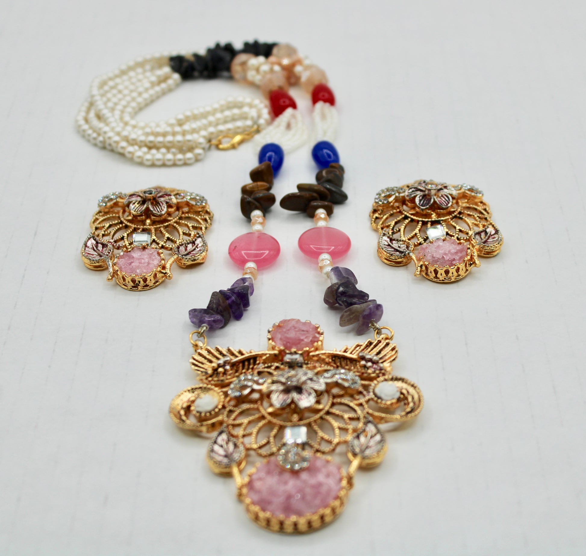 These unique fusion kundan and crushed stone maala sets are complete with faux pearl and bead detailing throughout. Each set includes matching earrings, and can be worn with both Eastern and Western outfits. Available in two colours.
