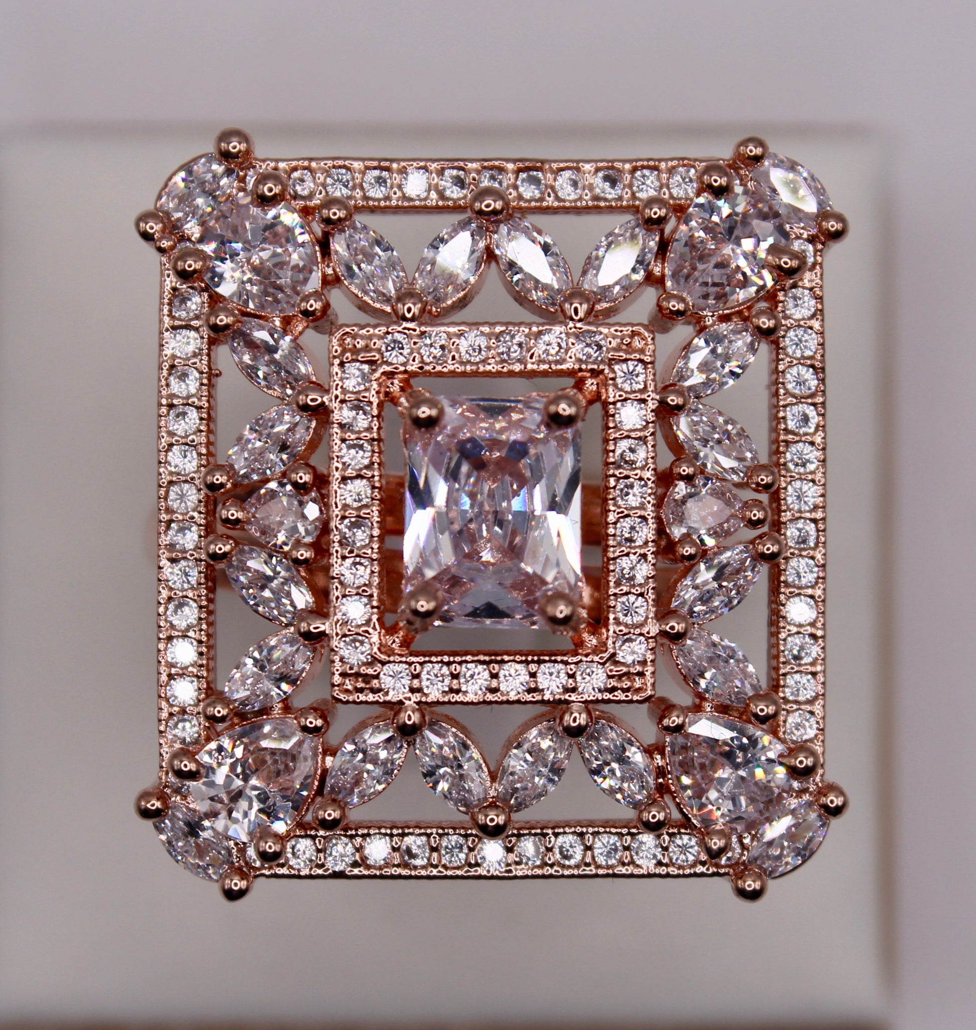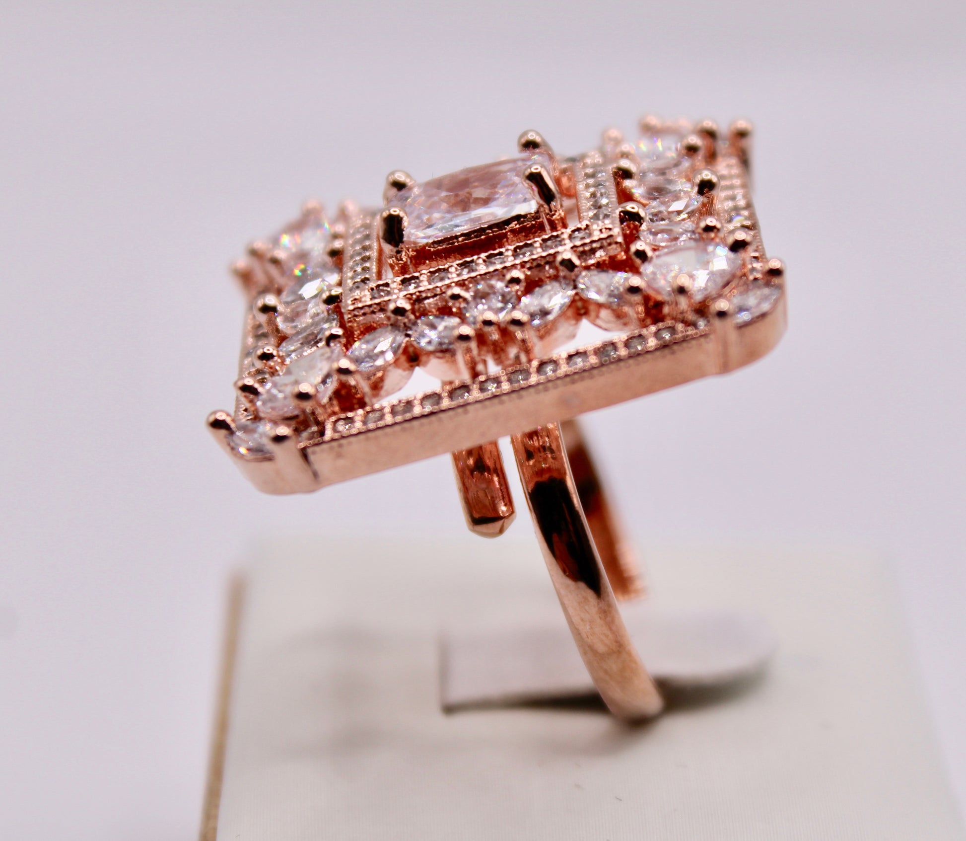 This dazzling rose gold ring is complete with cubic zirconia, it is the perfect addition to any outfit.