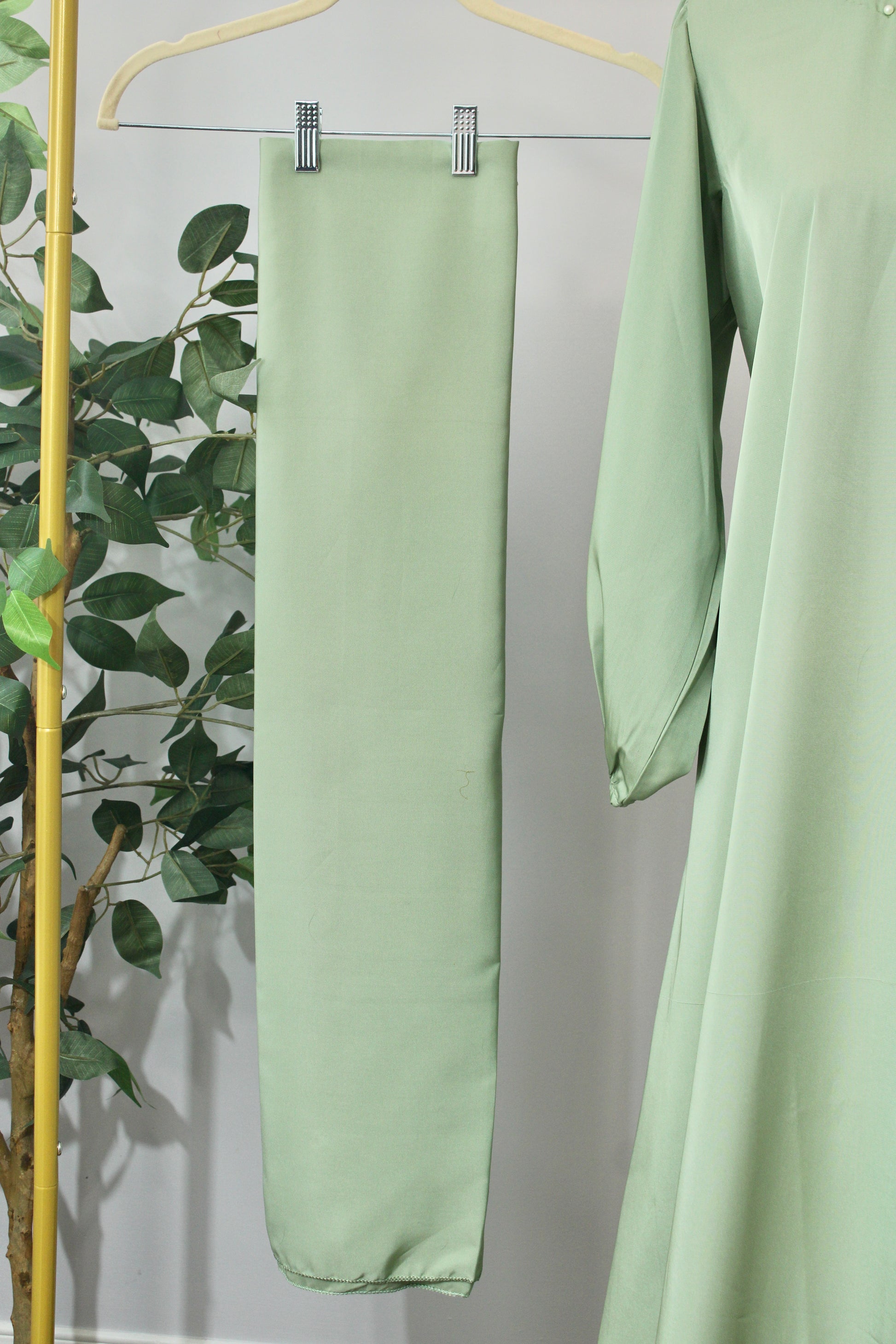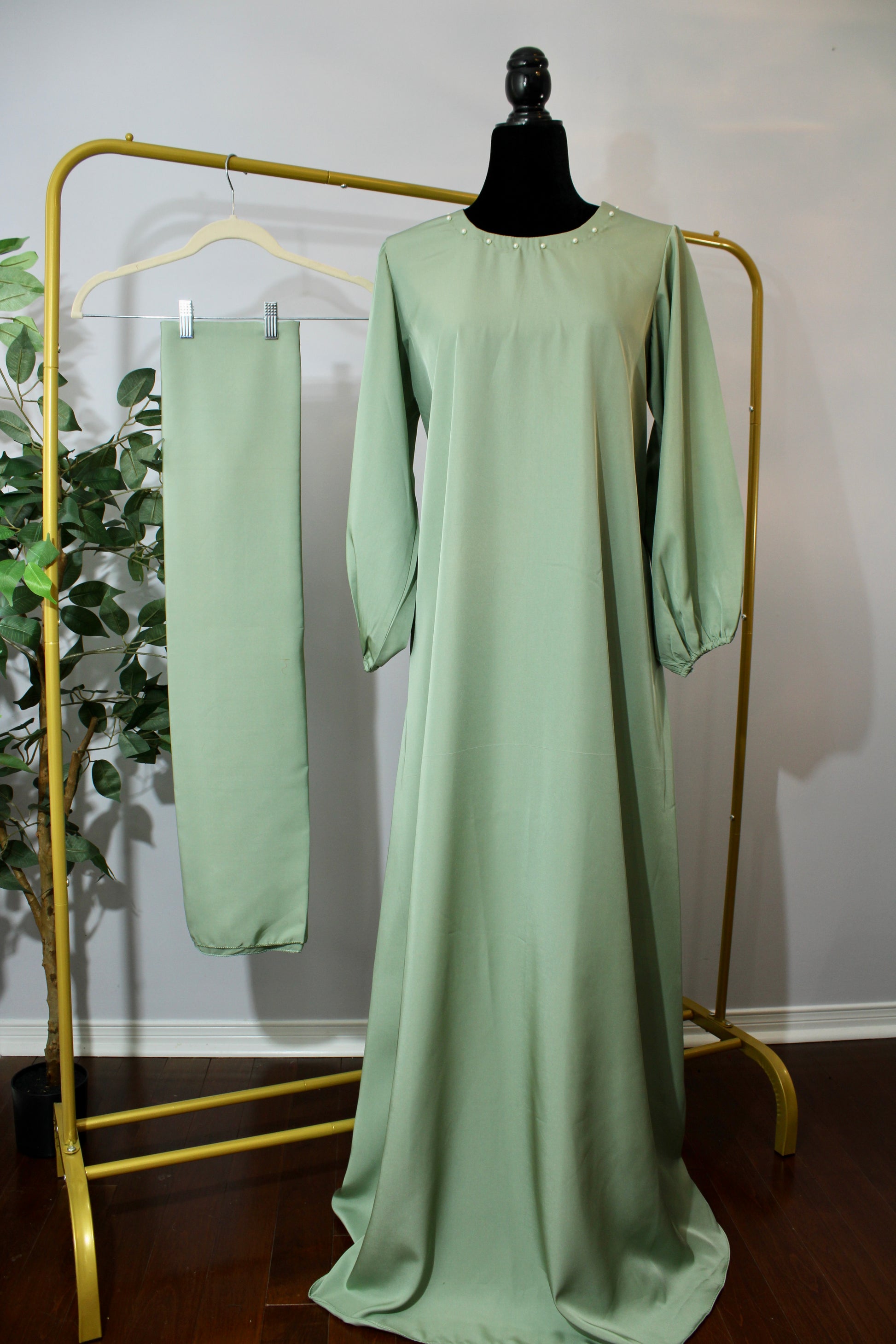 This sophisticated pastel abaya is complete with pearl embellishments along the neckline and puffed sleeves. (Hijab not included).
