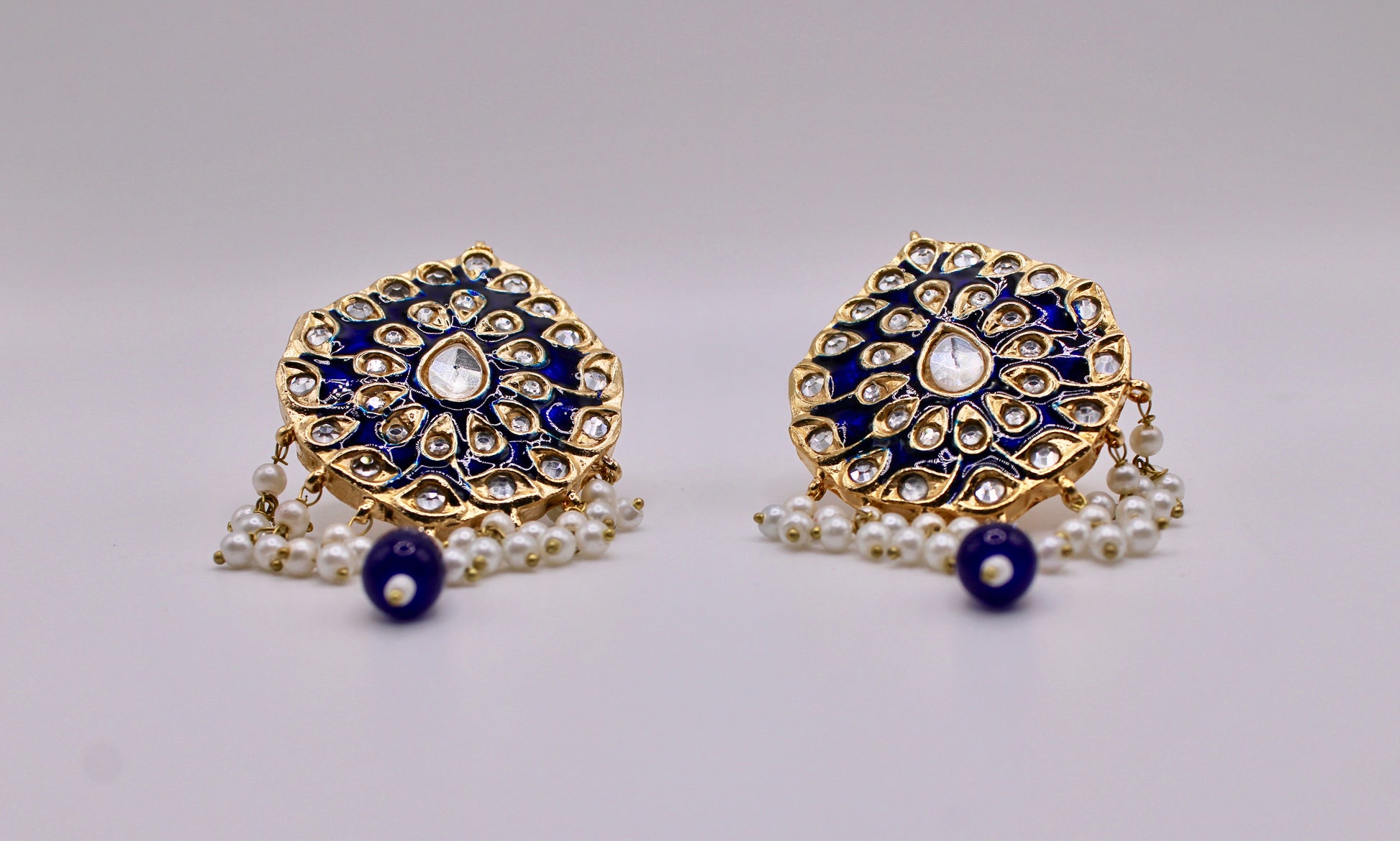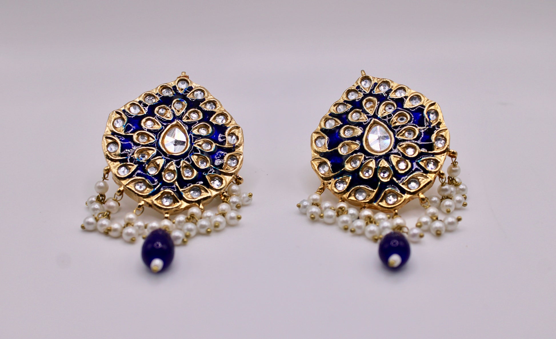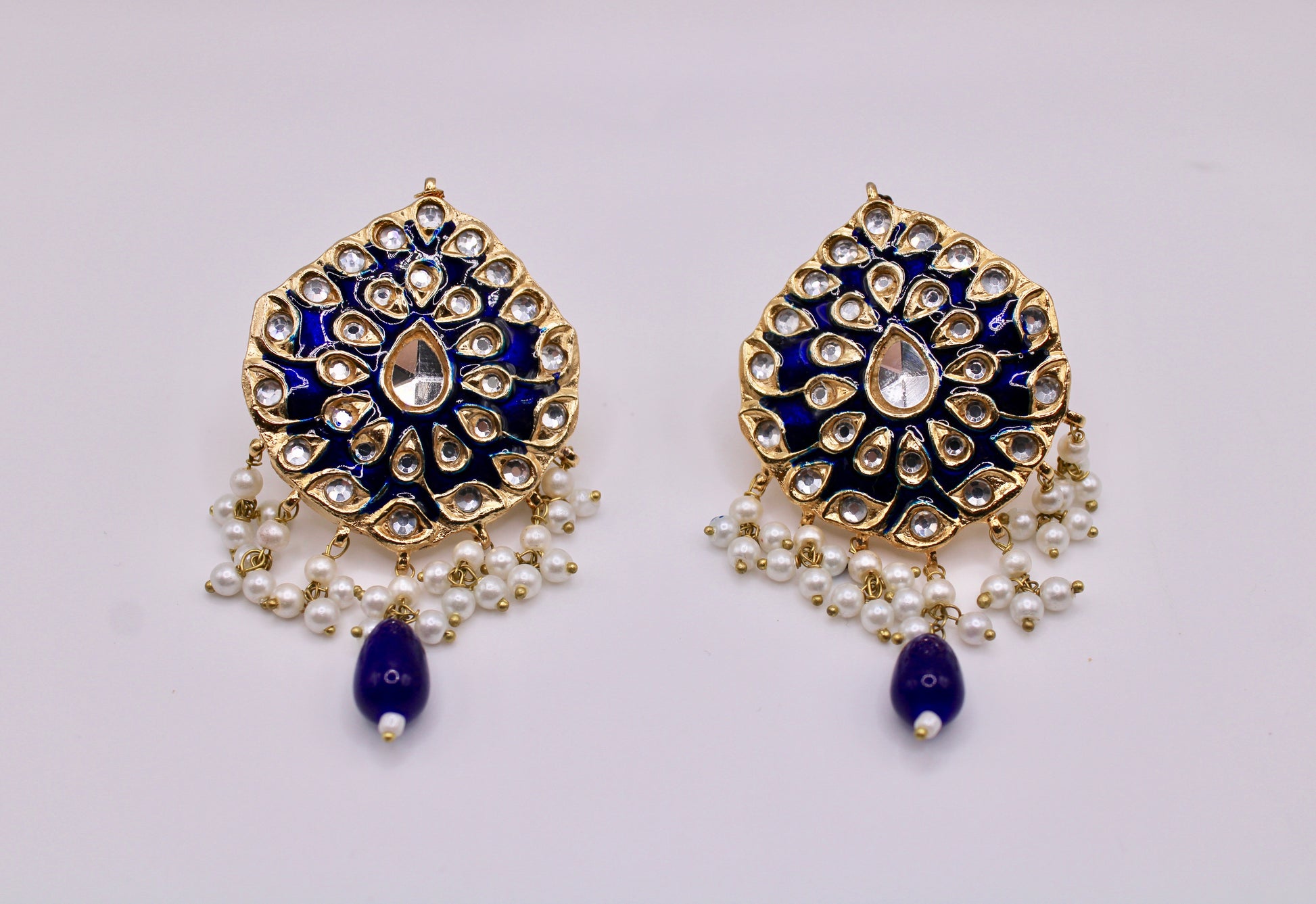 These stunning hand-made thappa kundan earrings are complete with meena kari and faux pearl detailing, and beads.