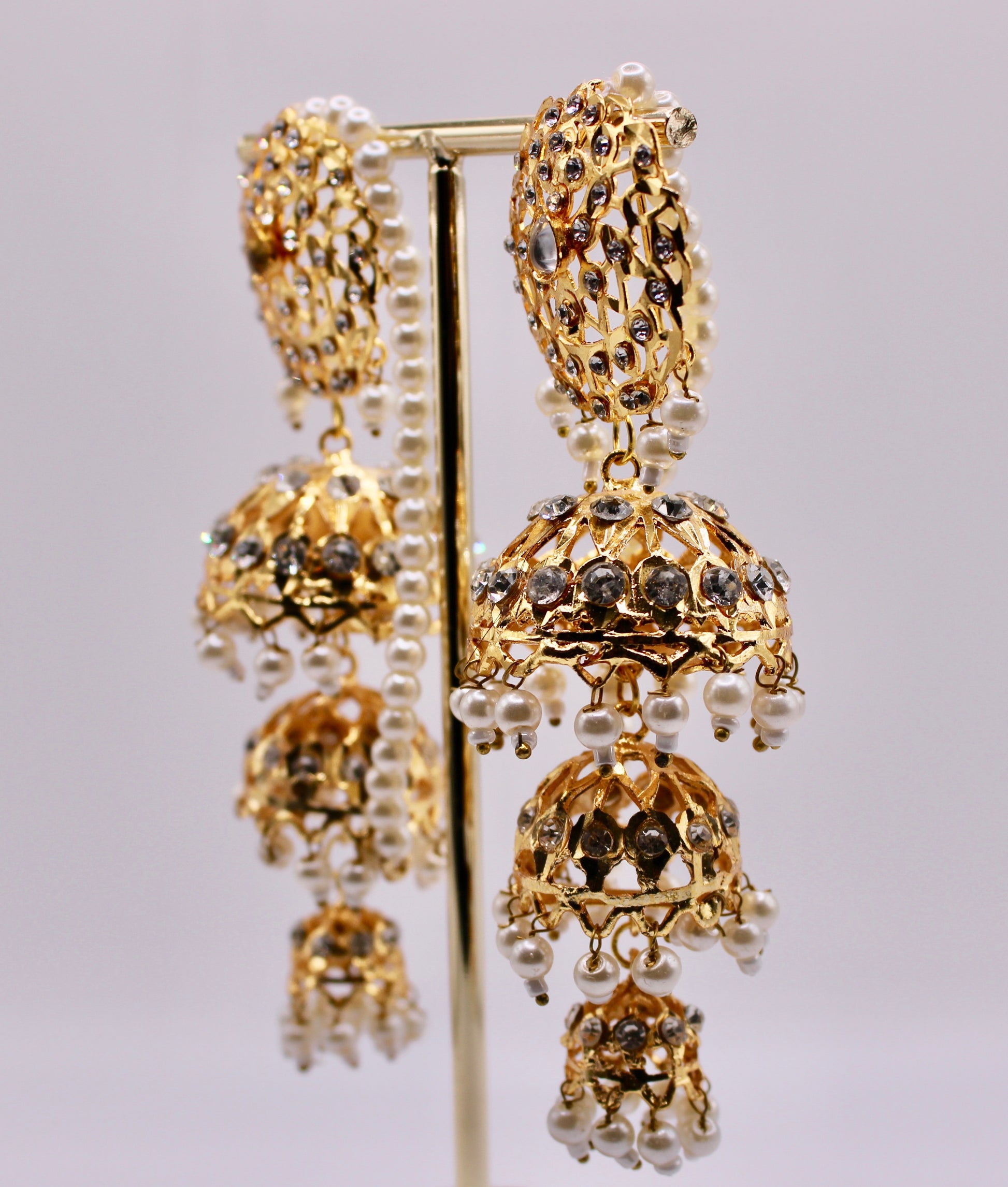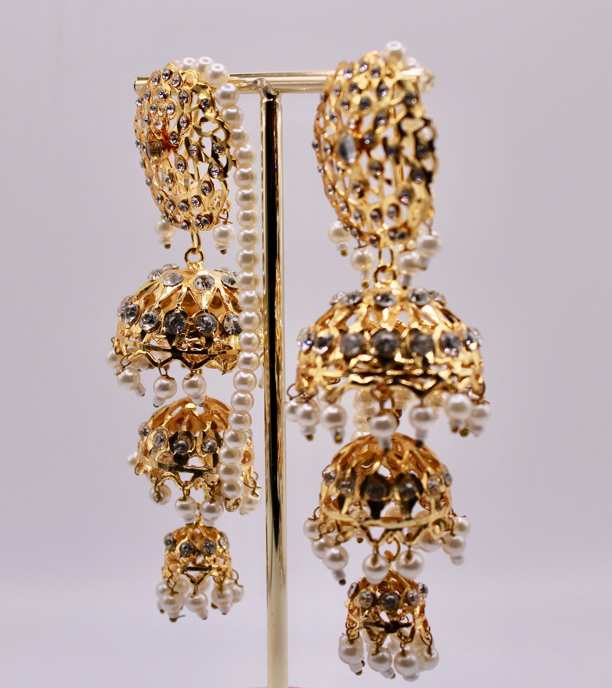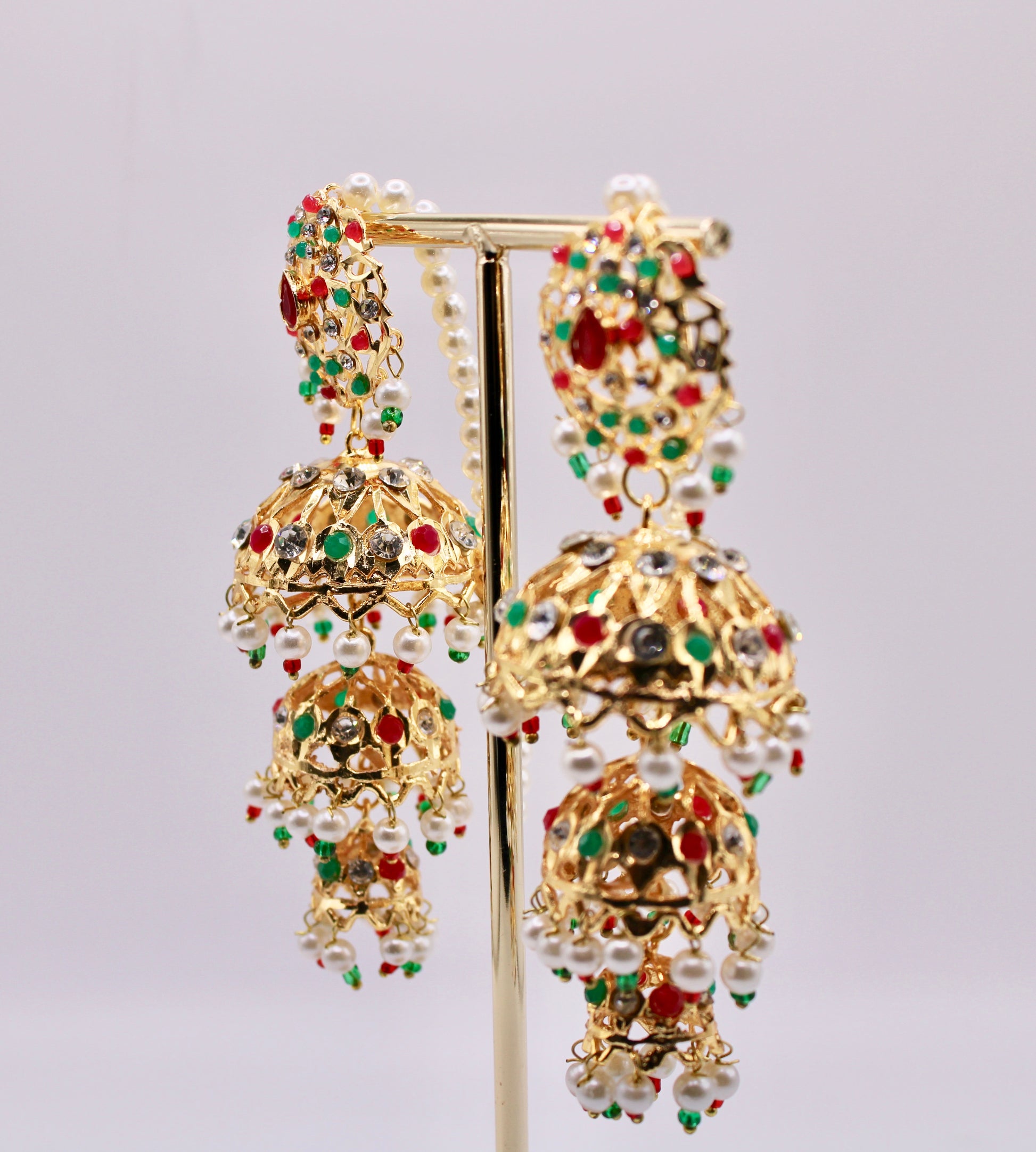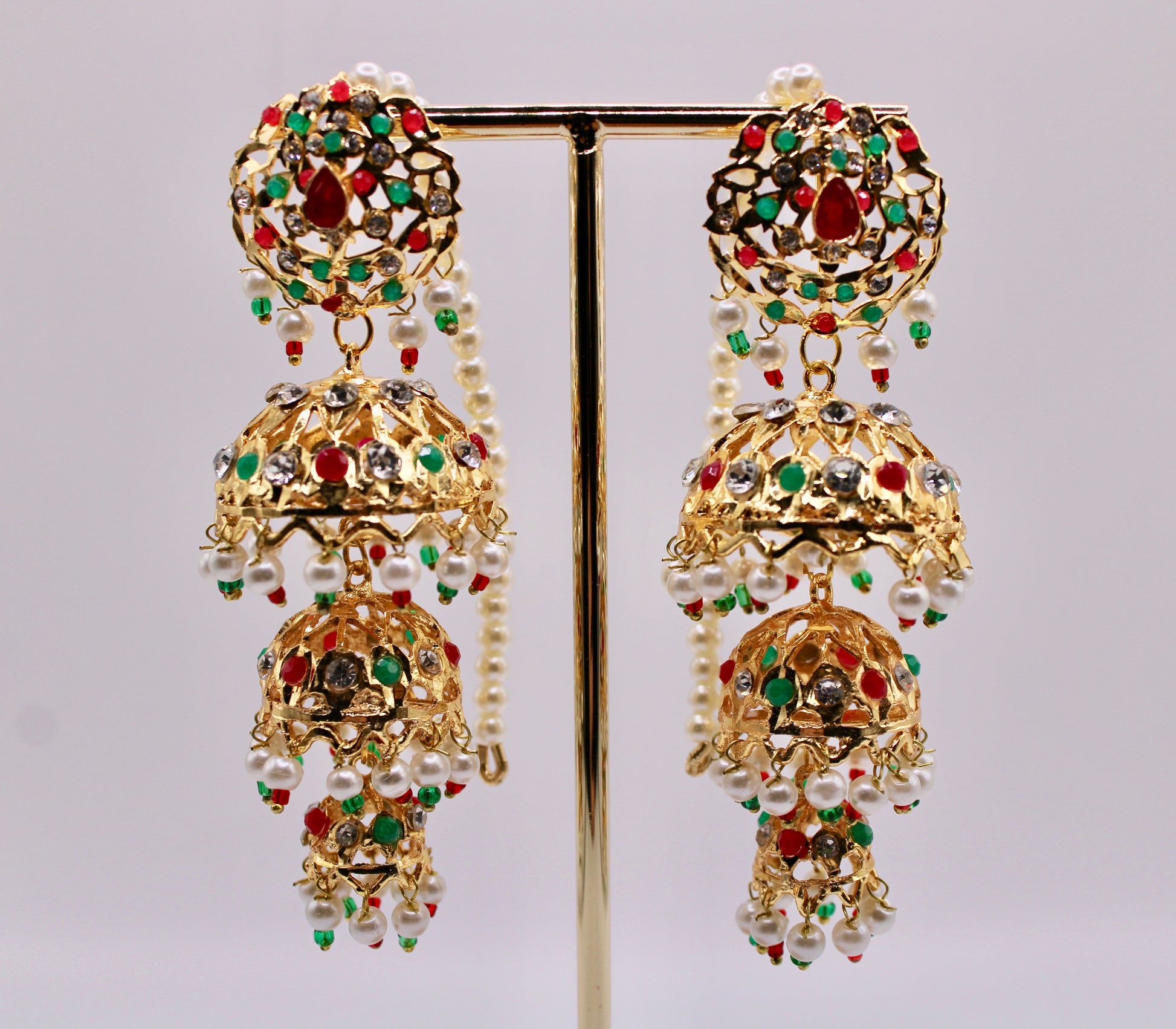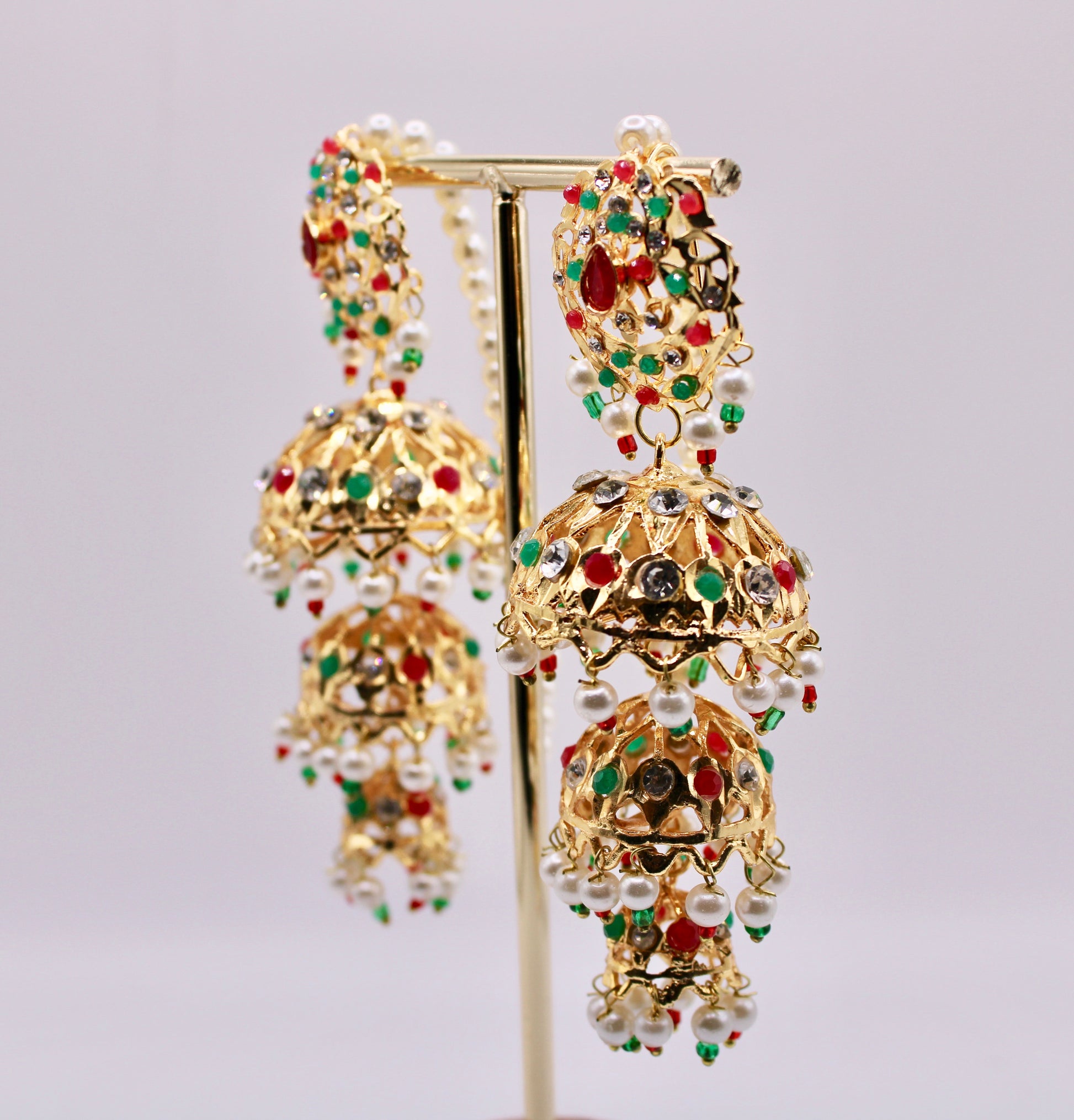 These traditional Hyderabadi jhumkis are complete with cubic zirconia and faux nauratan stones. The earrings also include faux pearl saharas attached.