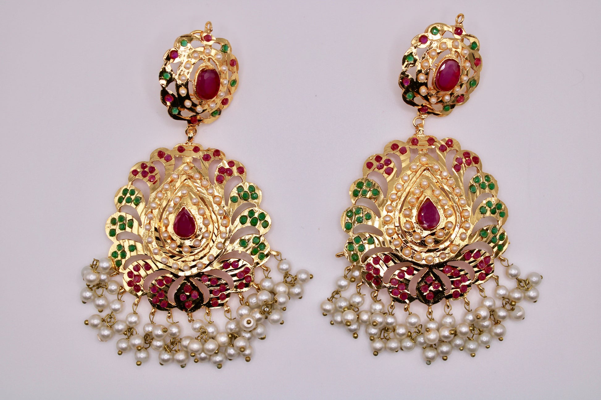 These traditional Hyderabadi earrings are gold-plated and complete with semi-precious ruby, emeralds and faux pearls.