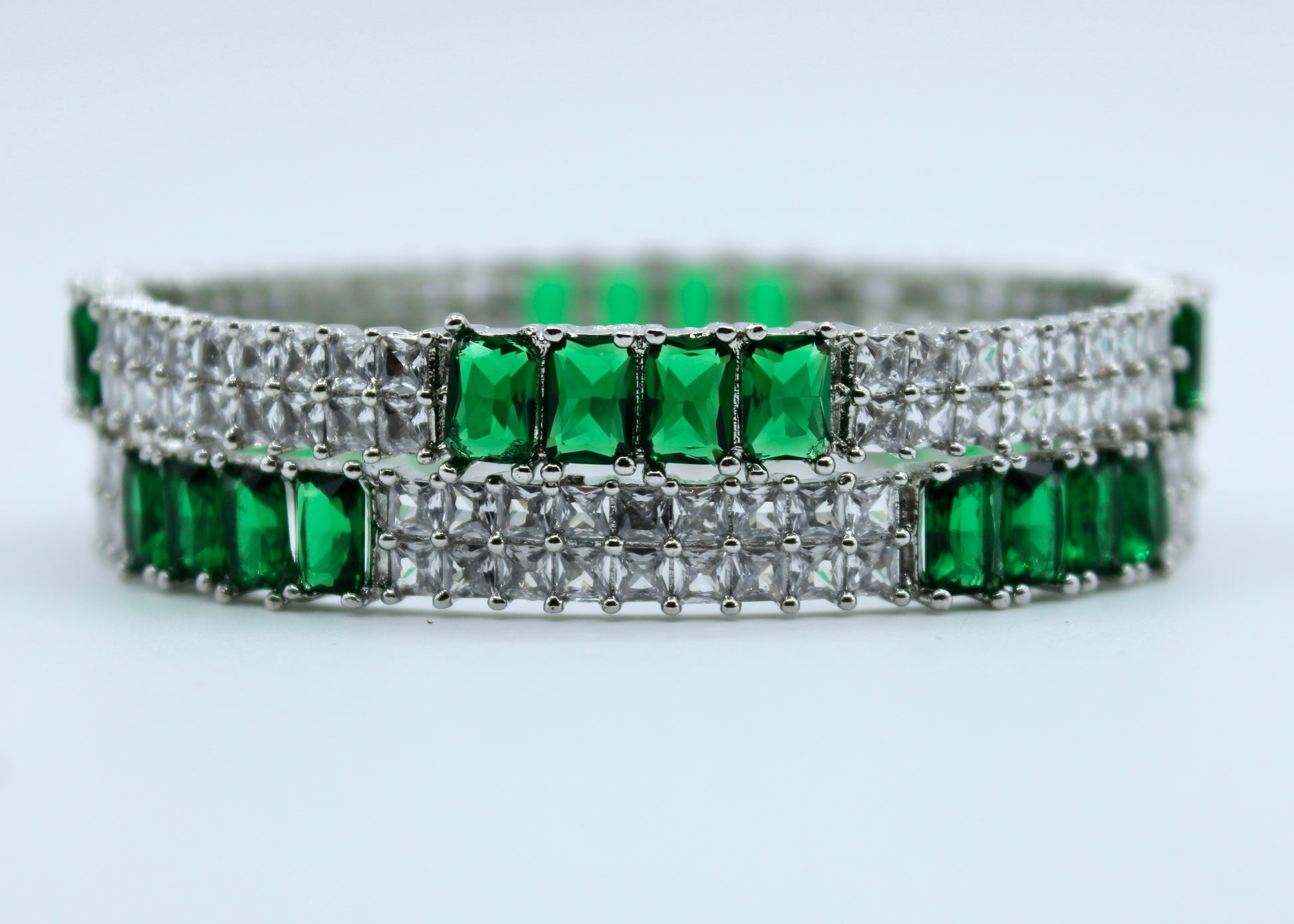 This stunning cubic zirconia bangle set is complete with striking emerald green stones. This design is the epitome of beauty and class, it can be paired with both Eastern and Western looks and is suitable for all ages. This design is sold in pairs.