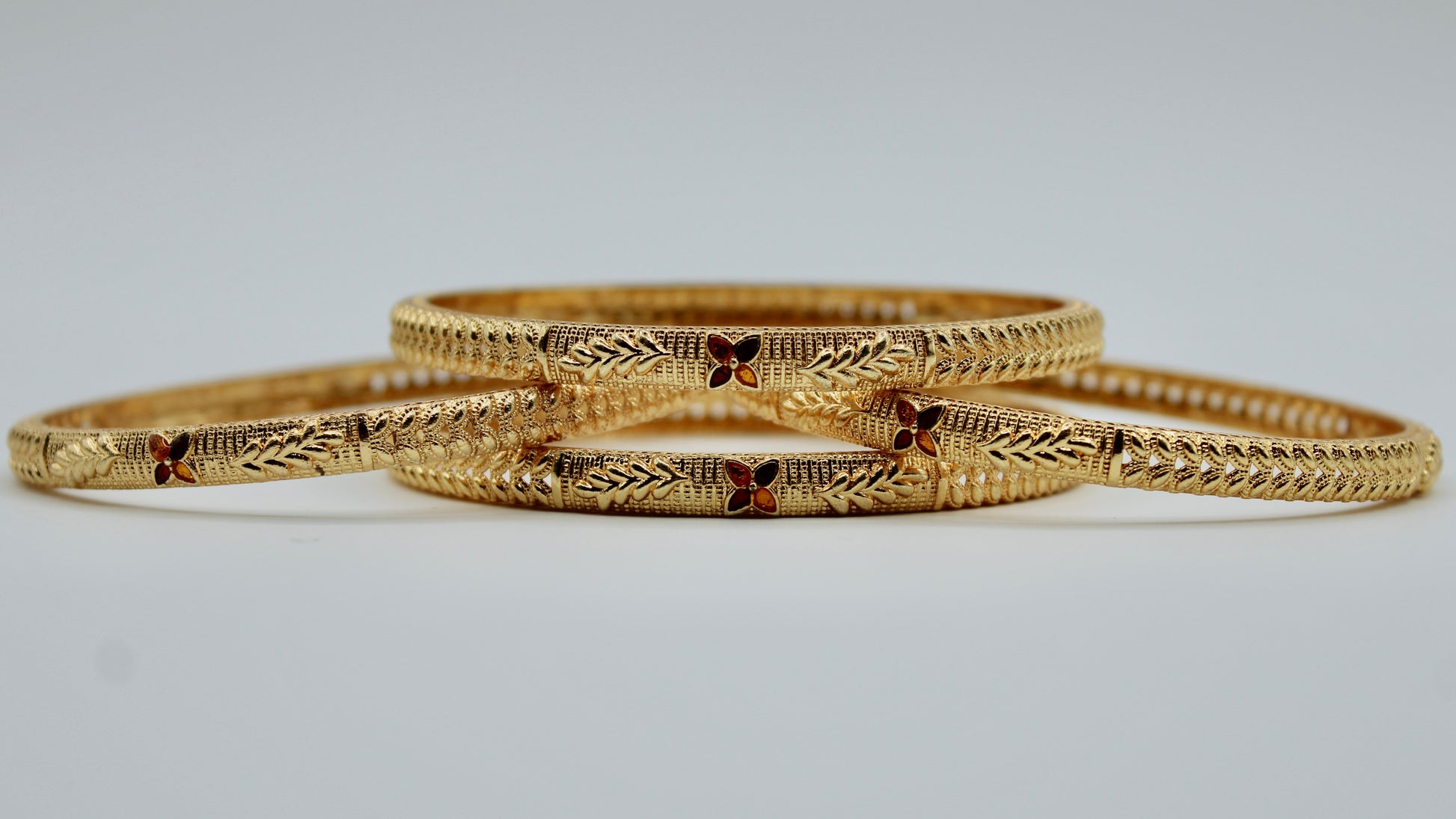 This beautiful bangle set is complete with intricate cubic zirconia studding in floral patterns and is made to imitate gold. It can easily be paired with both Eastern and Western looks and is suitable for all ages. This design is sold in sets of four.