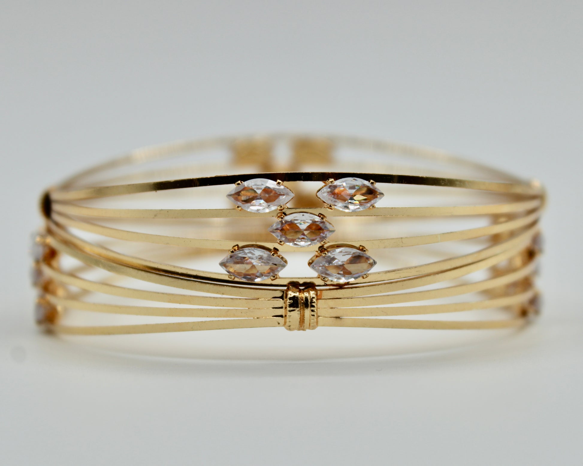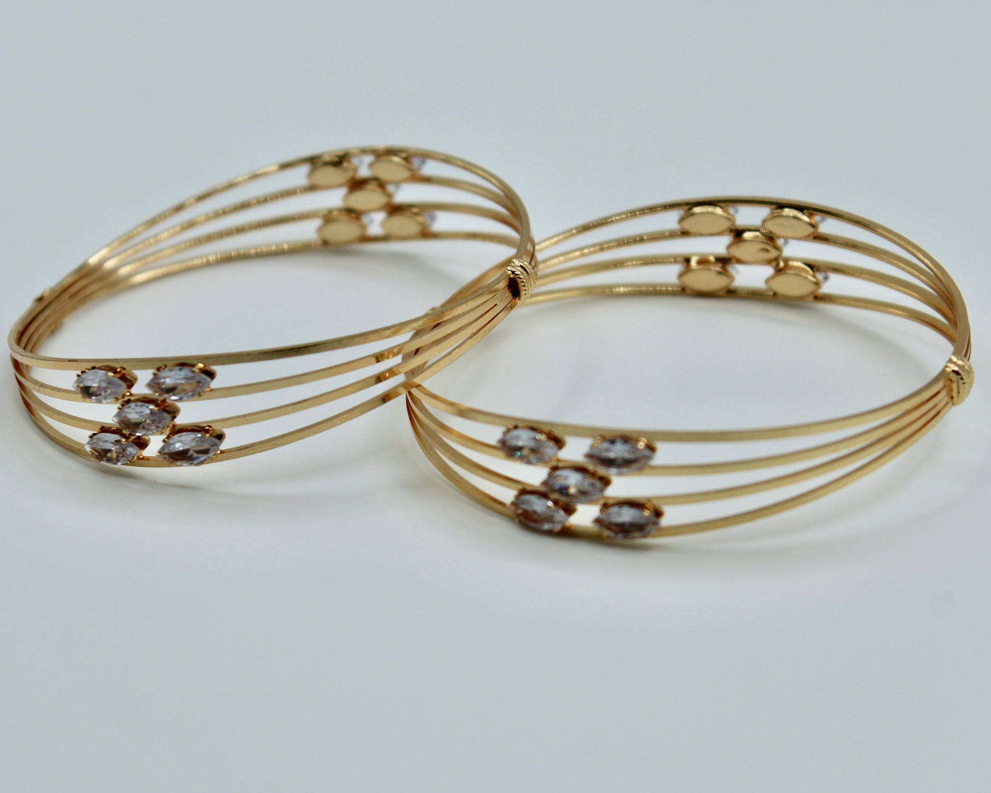 This unique kada set is complete with cubic zirconia details on a layered look. It can easily be paired with both Eastern and Western looks and is suitable for all ages. This design is sold in pairs.