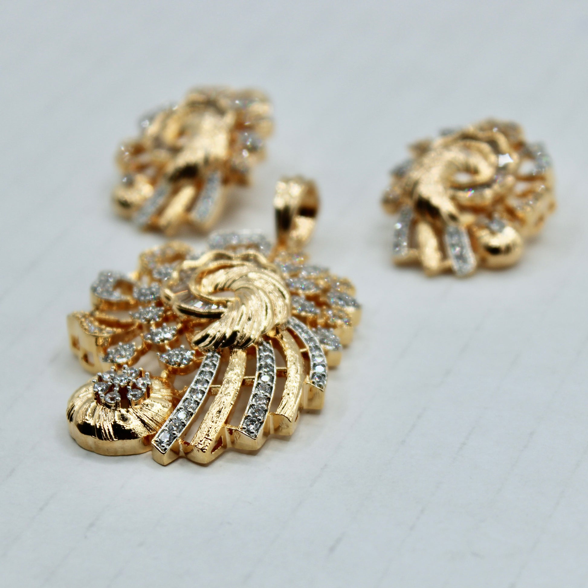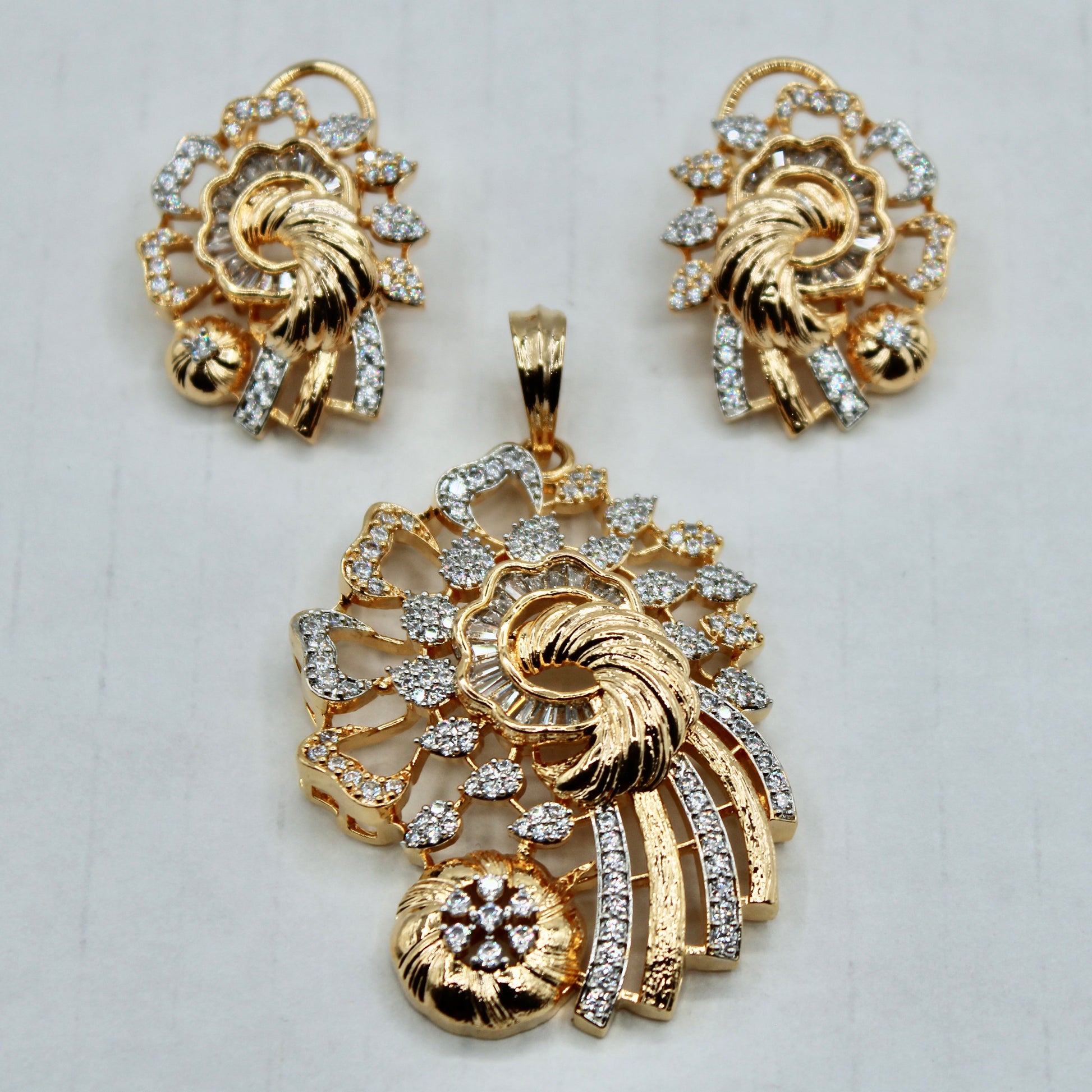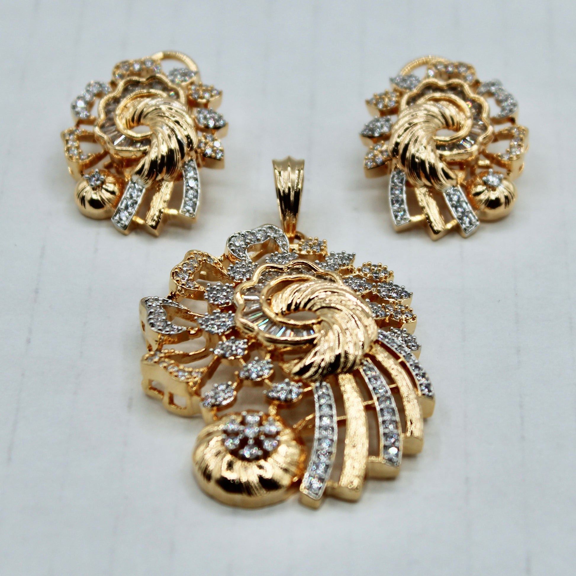 This beautiful golden pendant set is complete with various cuts of cubic zirconia throughout. It is complete with matching studs and a chain.