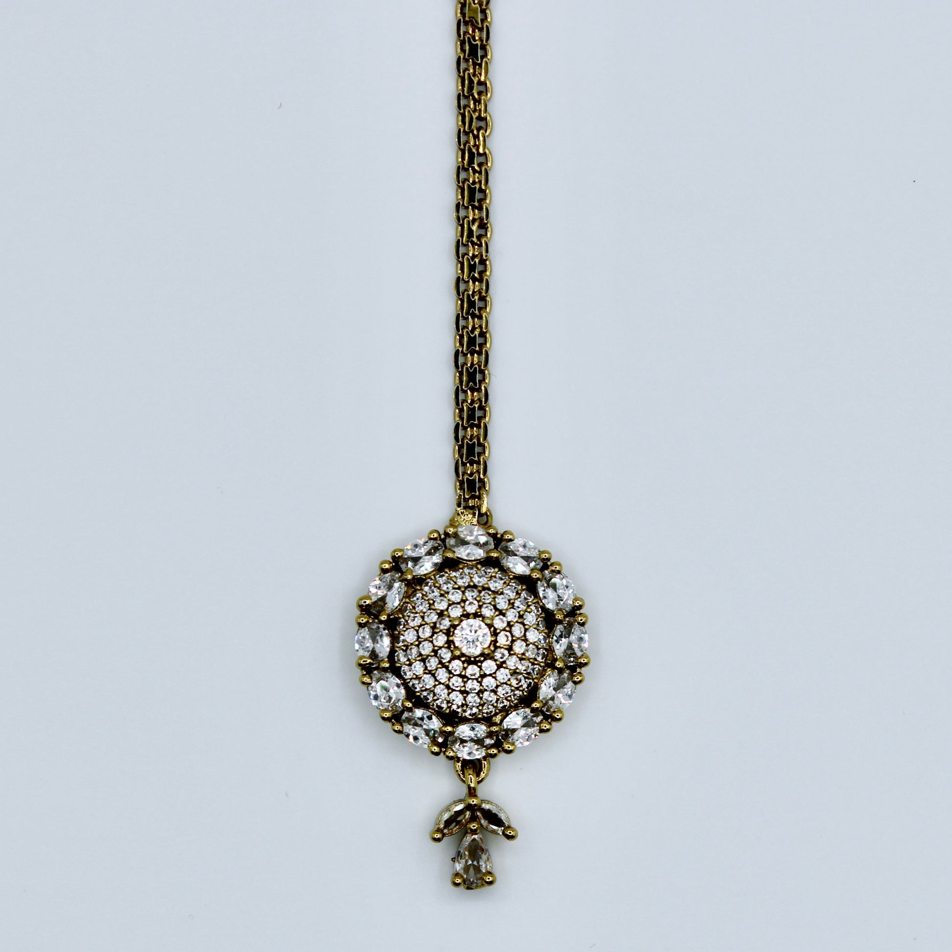 This dainty teeka is studded with high-quality cubic zirconia throughout. It is suitable for all ages and occasions, and can easily be paired with other pieces of jewelry.