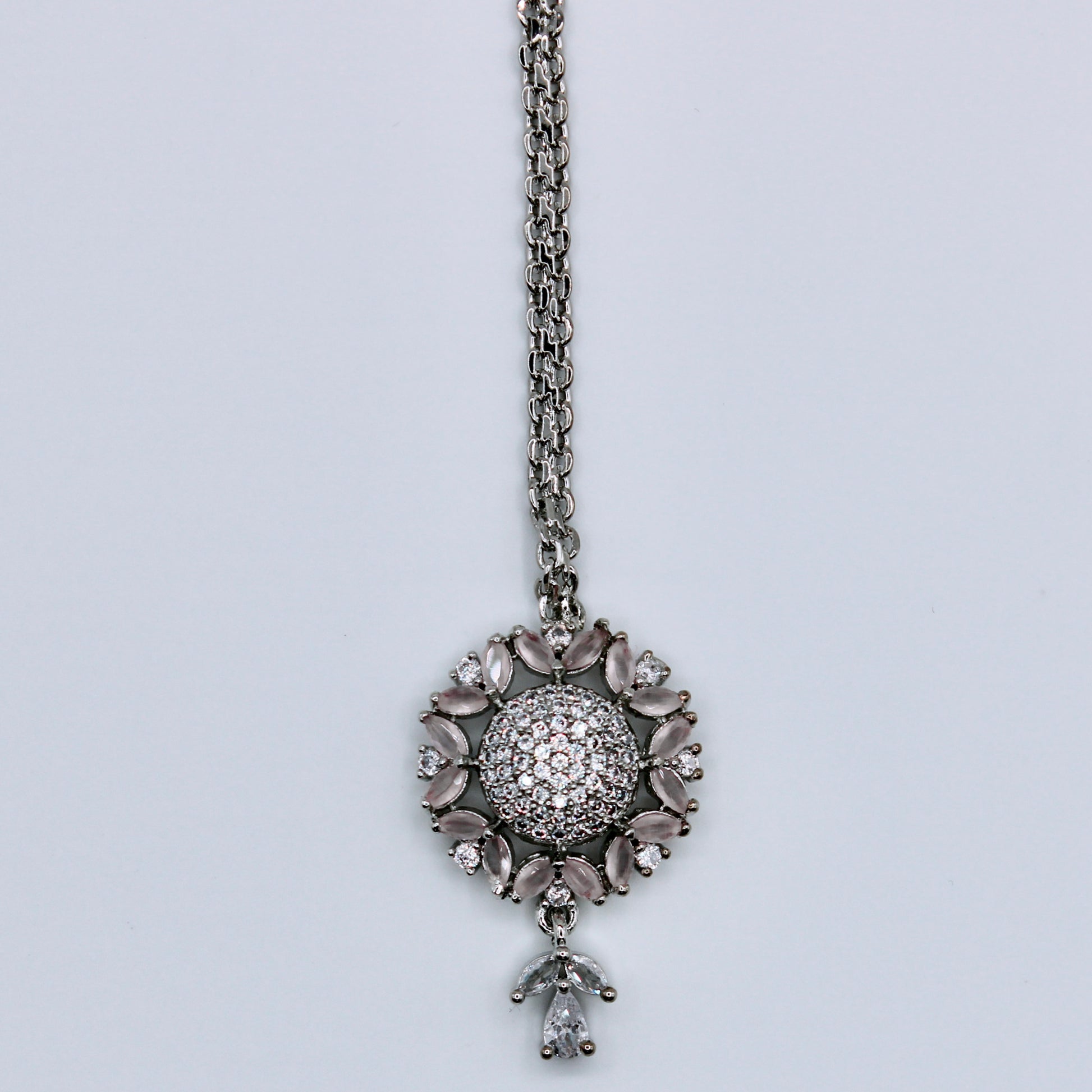 This dainty teeka is studded with high-quality cubic zirconia throughout. It is suitable for all ages and occasions, and can easily be paired with other pieces of jewelry.