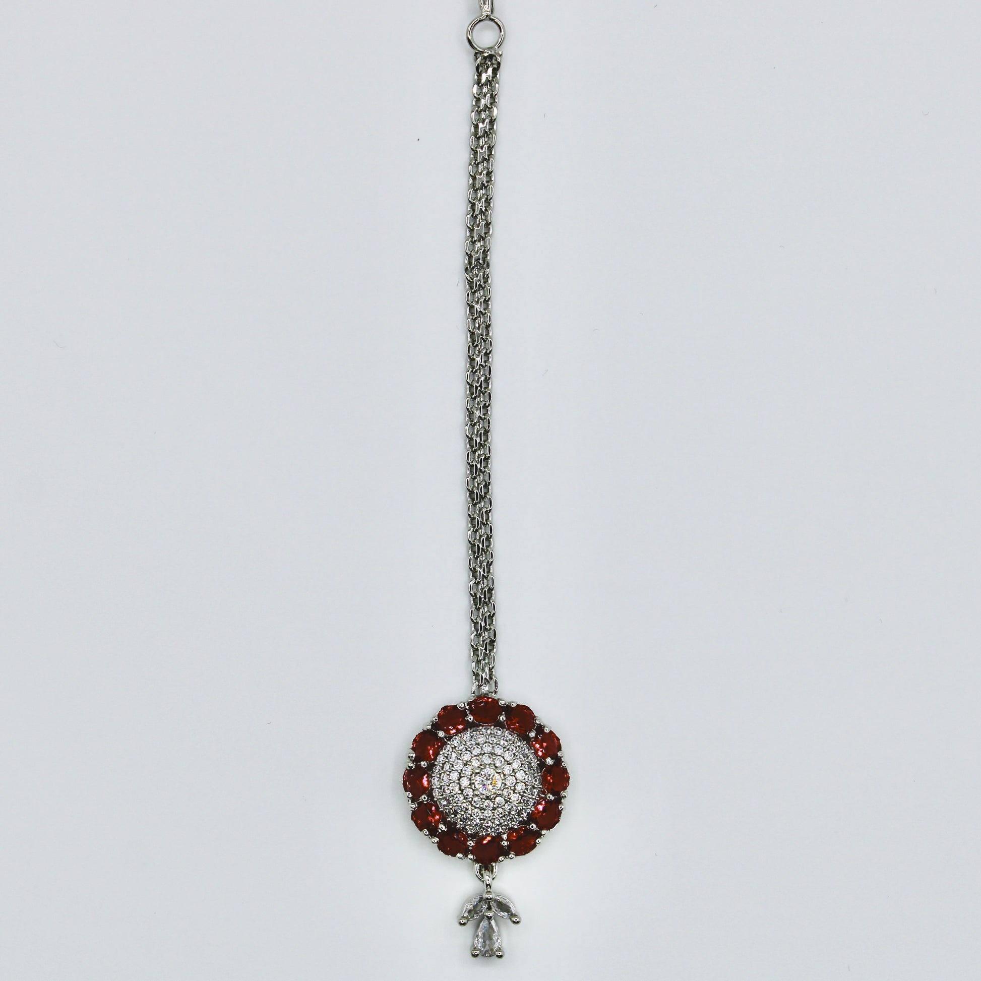 This dainty teeka is studded with high-quality cubic zirconia throughout. It is suitable for all ages and occasions, and can easily be paired with other pieces of jewelry.
