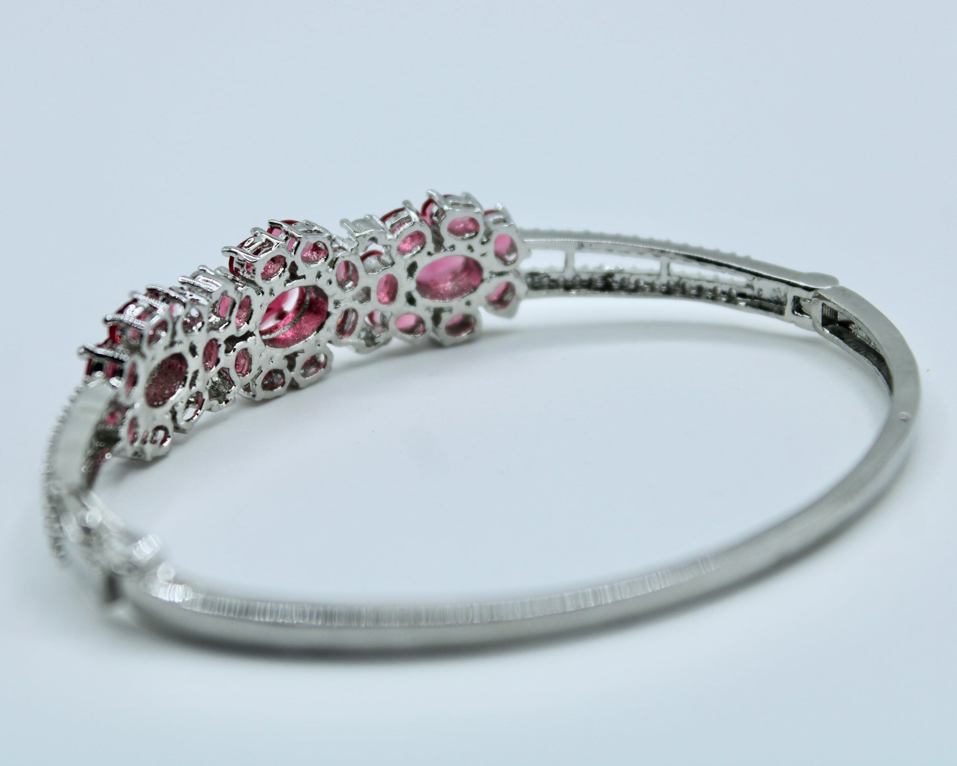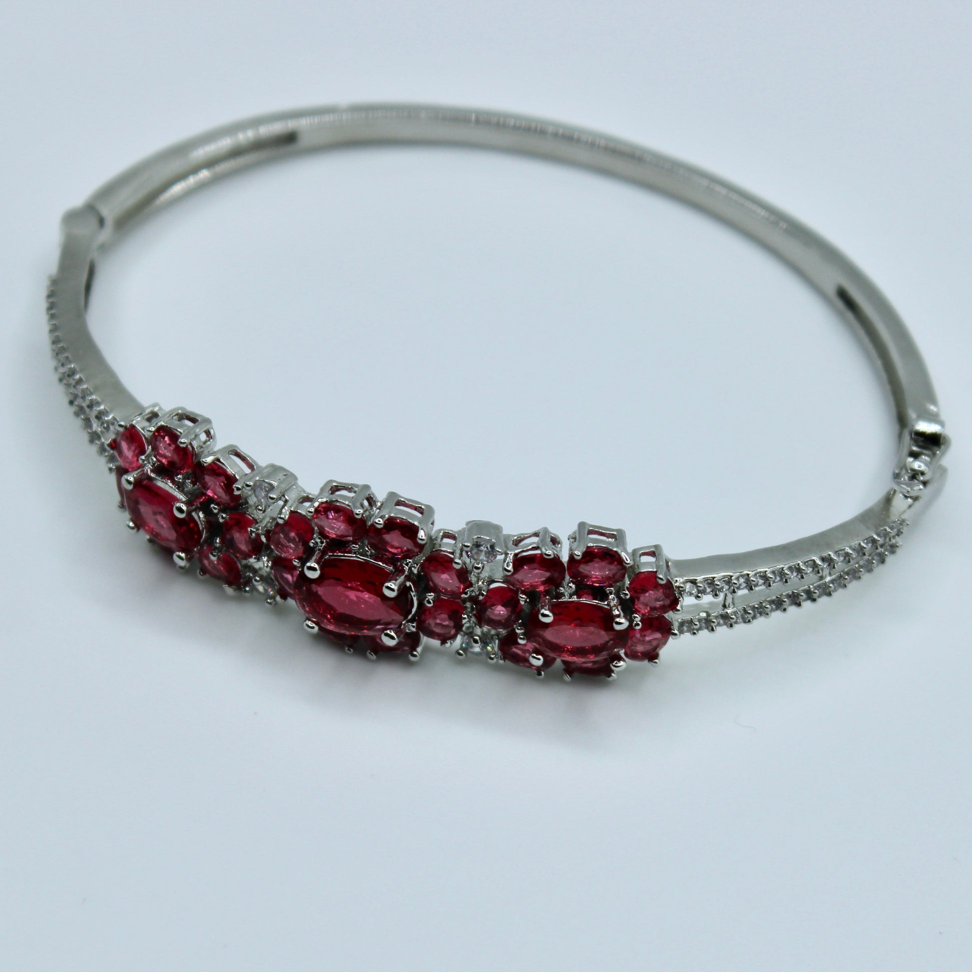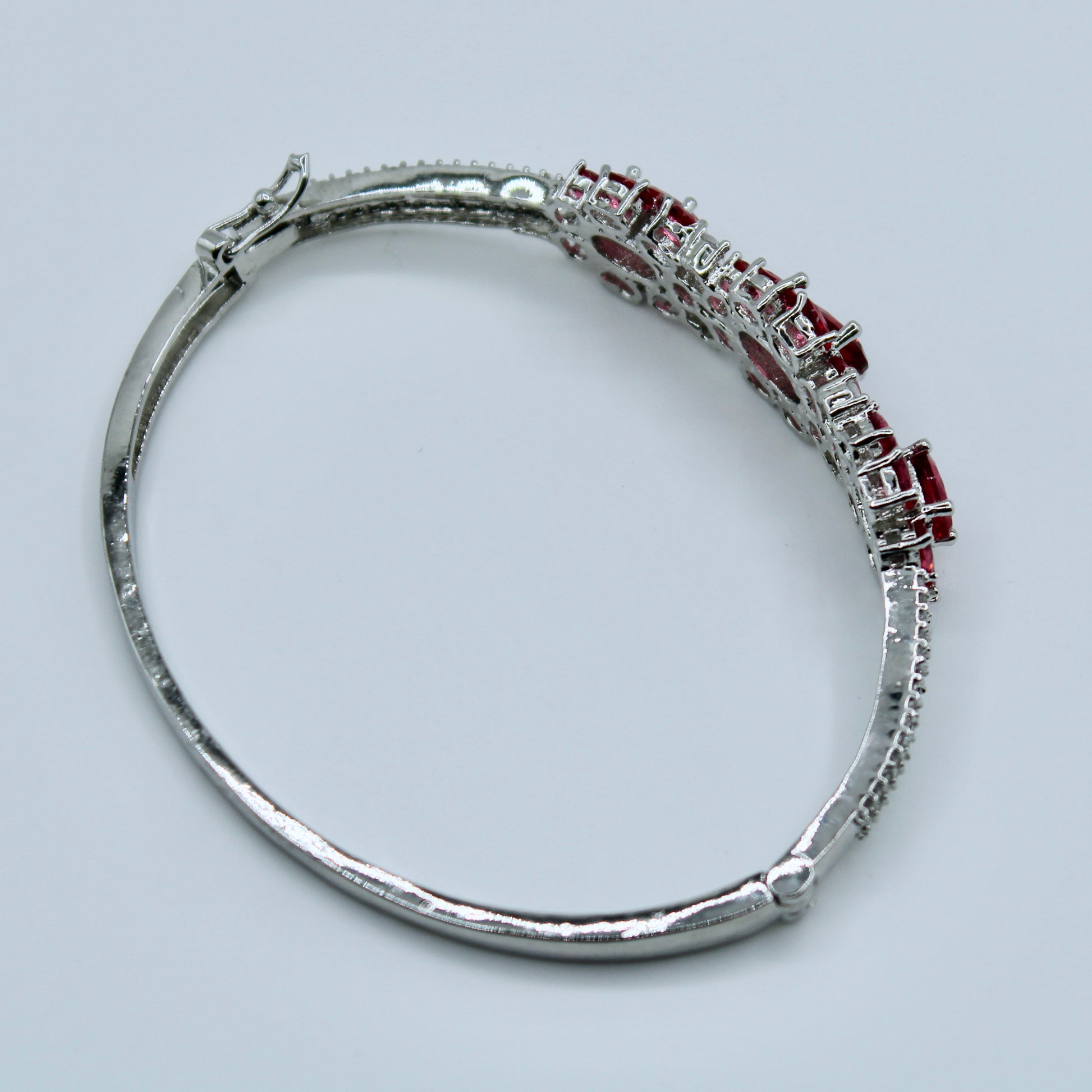 This dazzling floral cubic zirconia bracelet features ruby accents throughout. It is complete with a clasp and is openable. This design can be easily styled up or down and can be paired with both Eastern and Western looks.