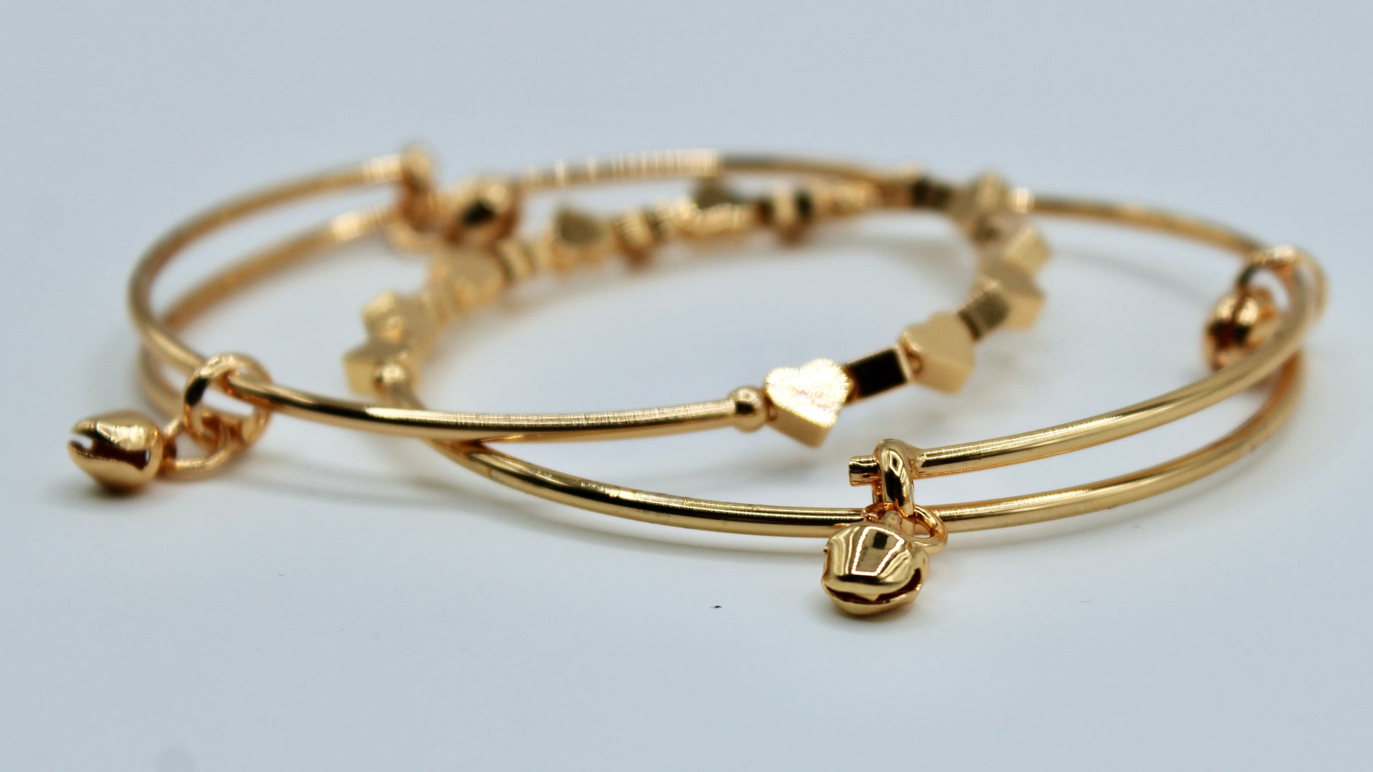 These dainty bangles are complete with golden heart appliqués and bells. They are suitable for all occasions and ages, and can easily be worn with both Eastern and Western outfits. This design is sold in pairs.