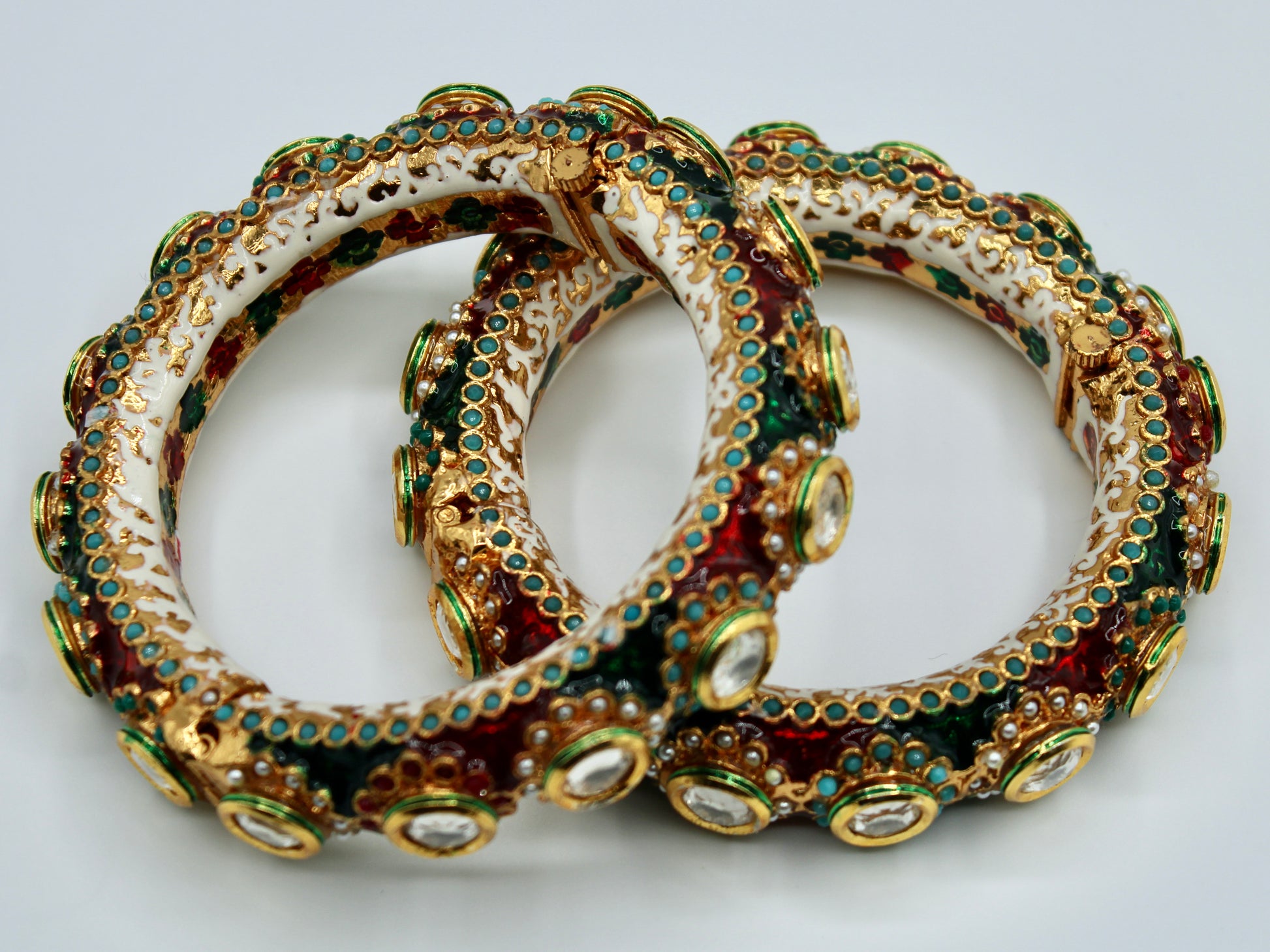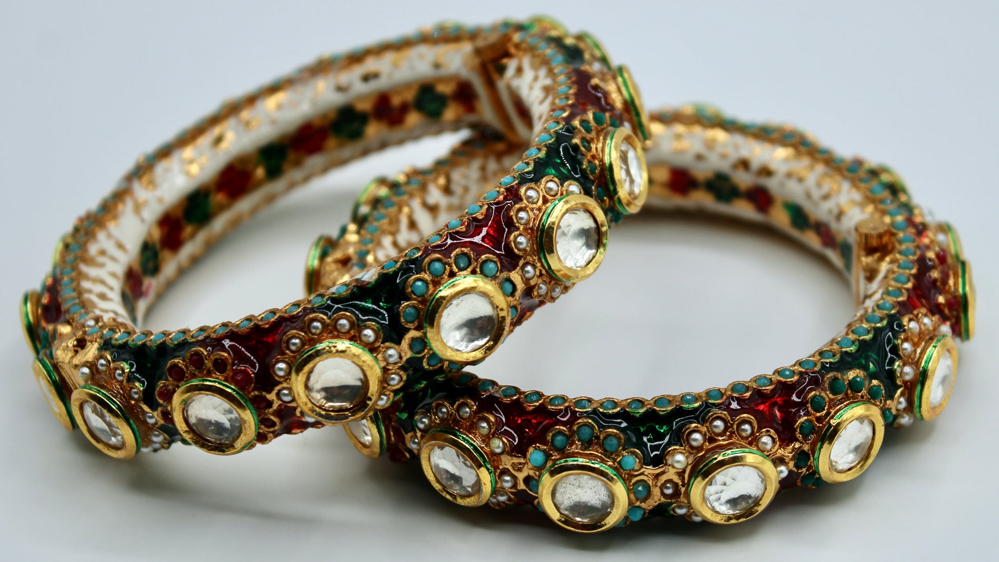 This unique hand-made meena kari kada features jadao kundan detailing throughout and nauratan stones along the kadas perimeter. It is complete with floral meena kari detailing along the inside and a screw-in clasps. This design is sold in singles.