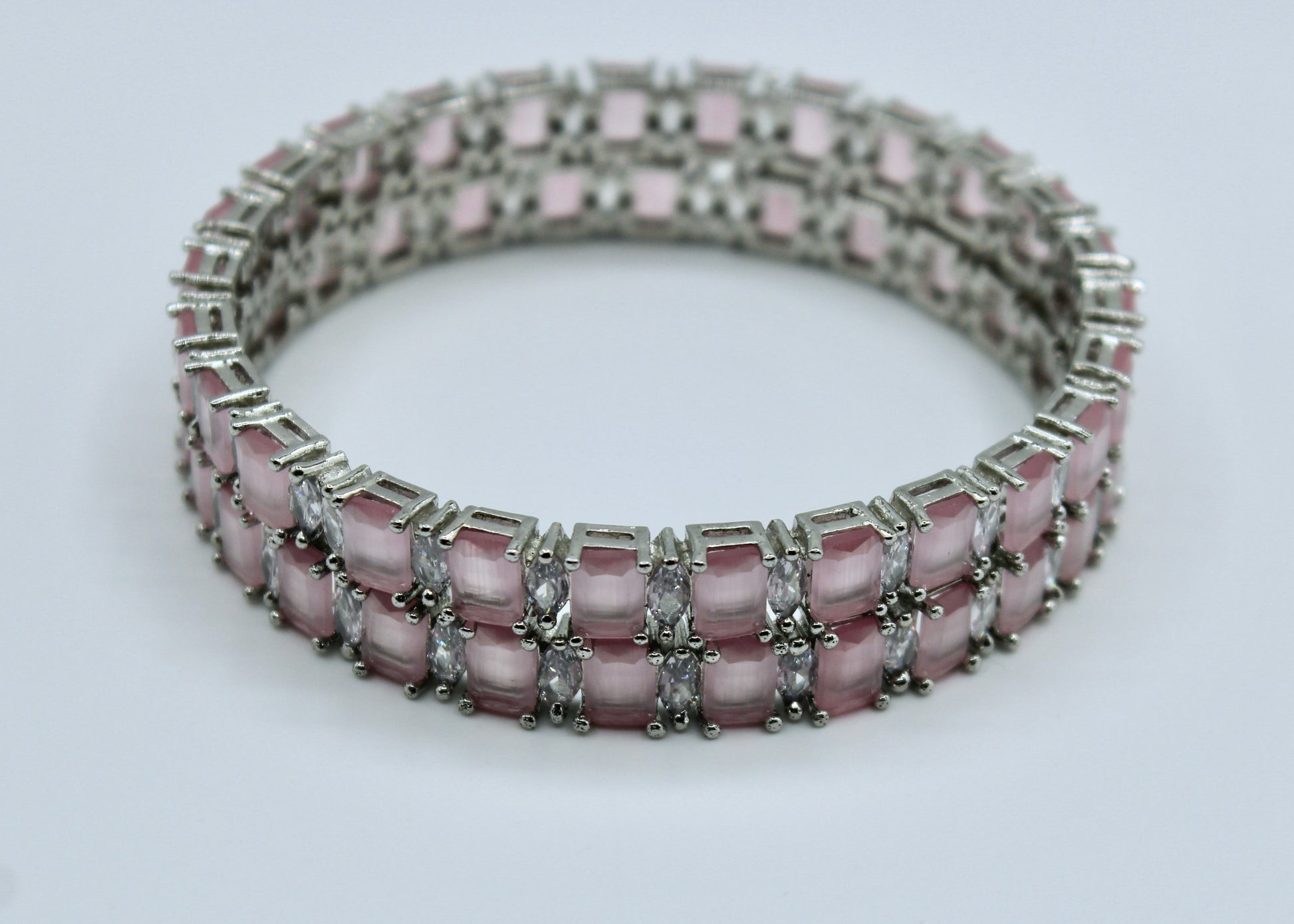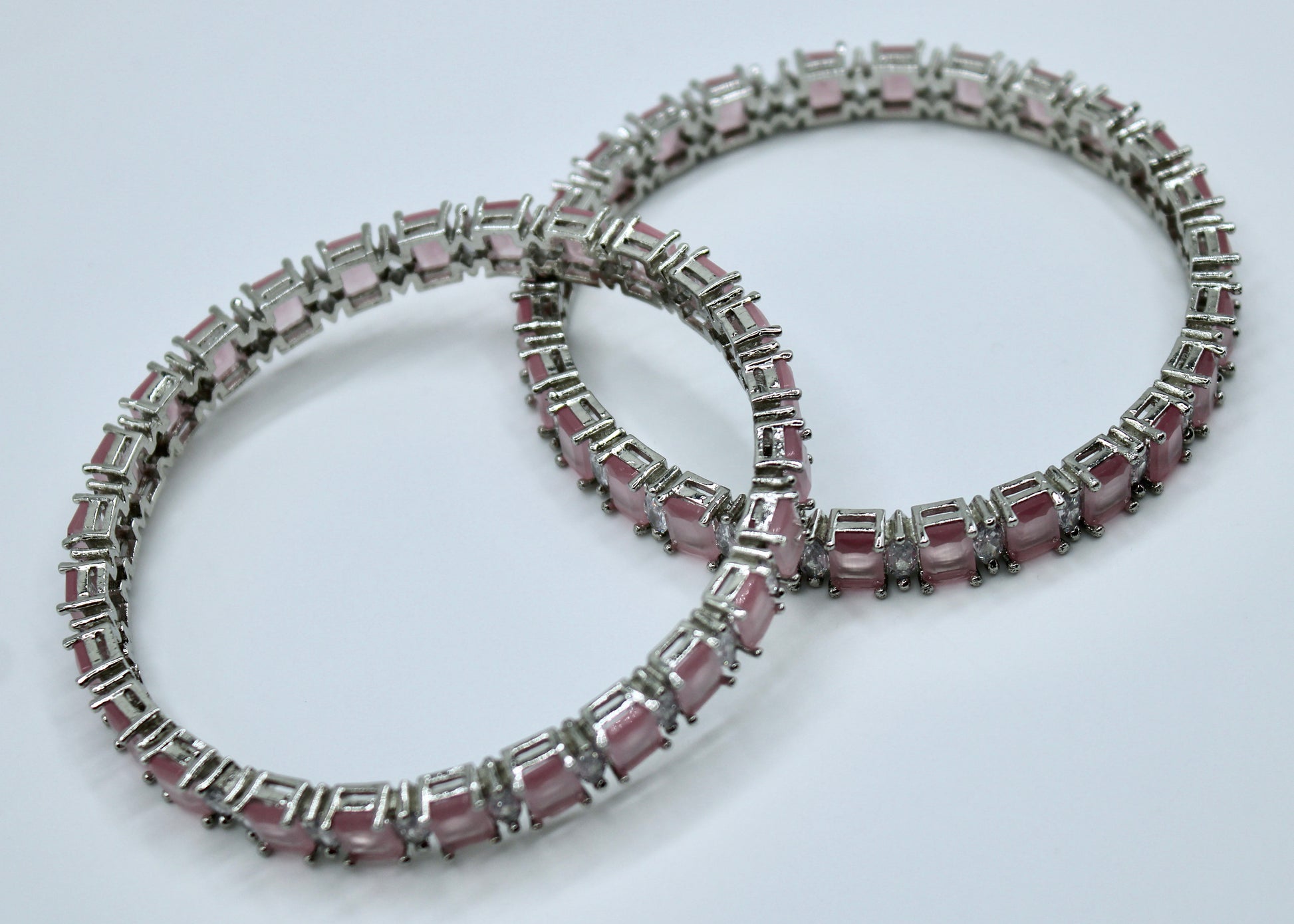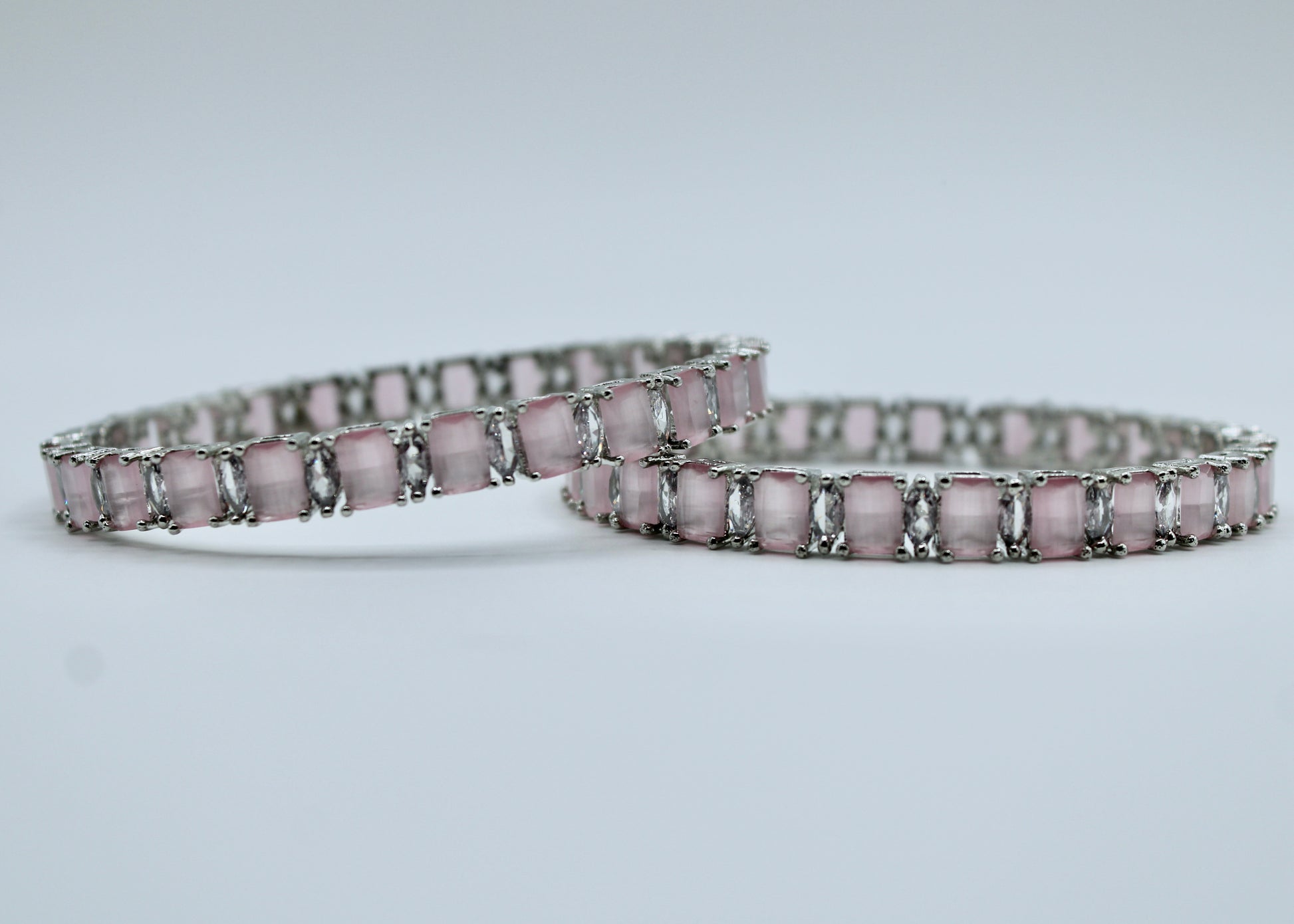 This delicate bangle set is studded with pastel pink cubic zirconia throughout, it is suitable for all ages and occasions and can be paired with both Eastern and Western looks. This design is sold in pairs.