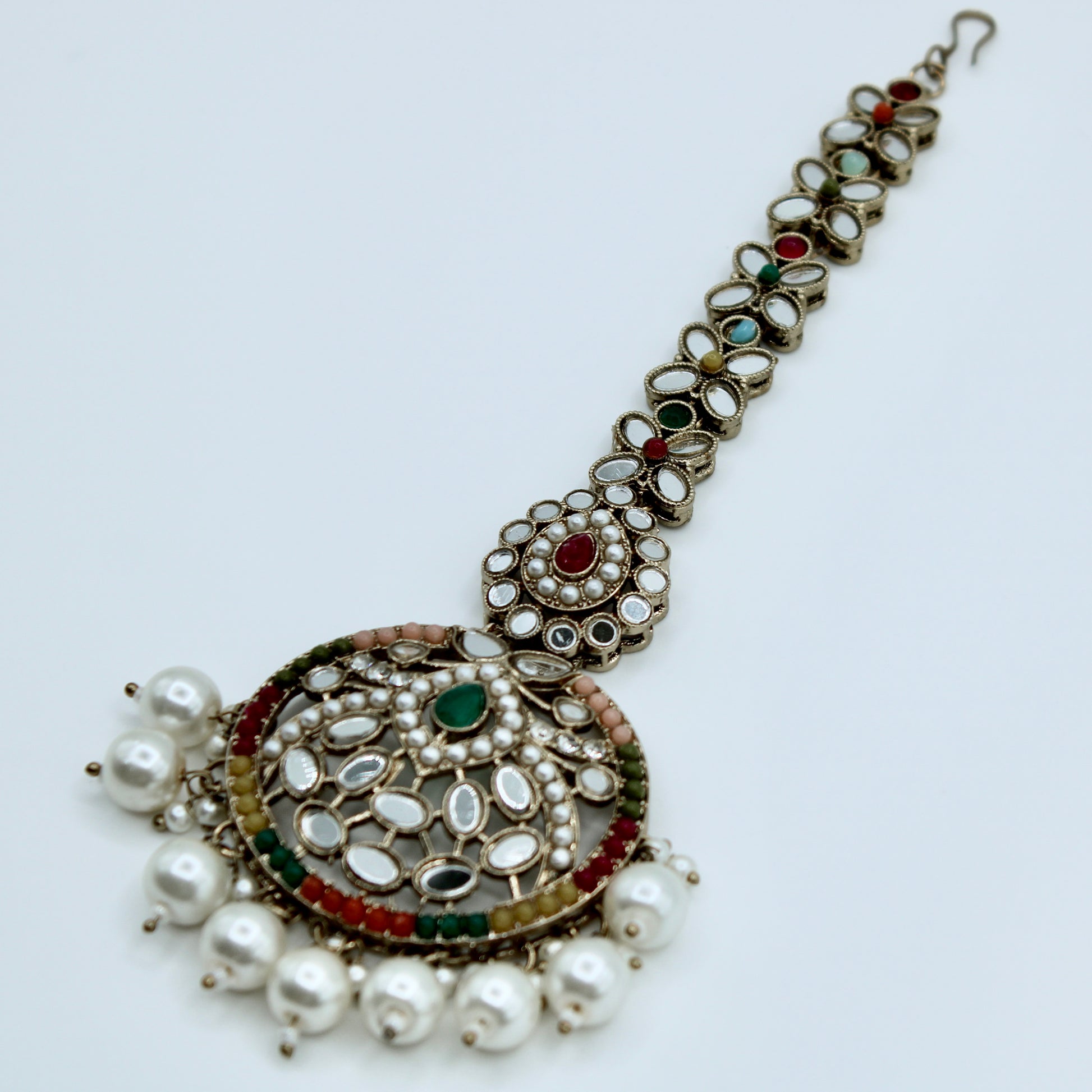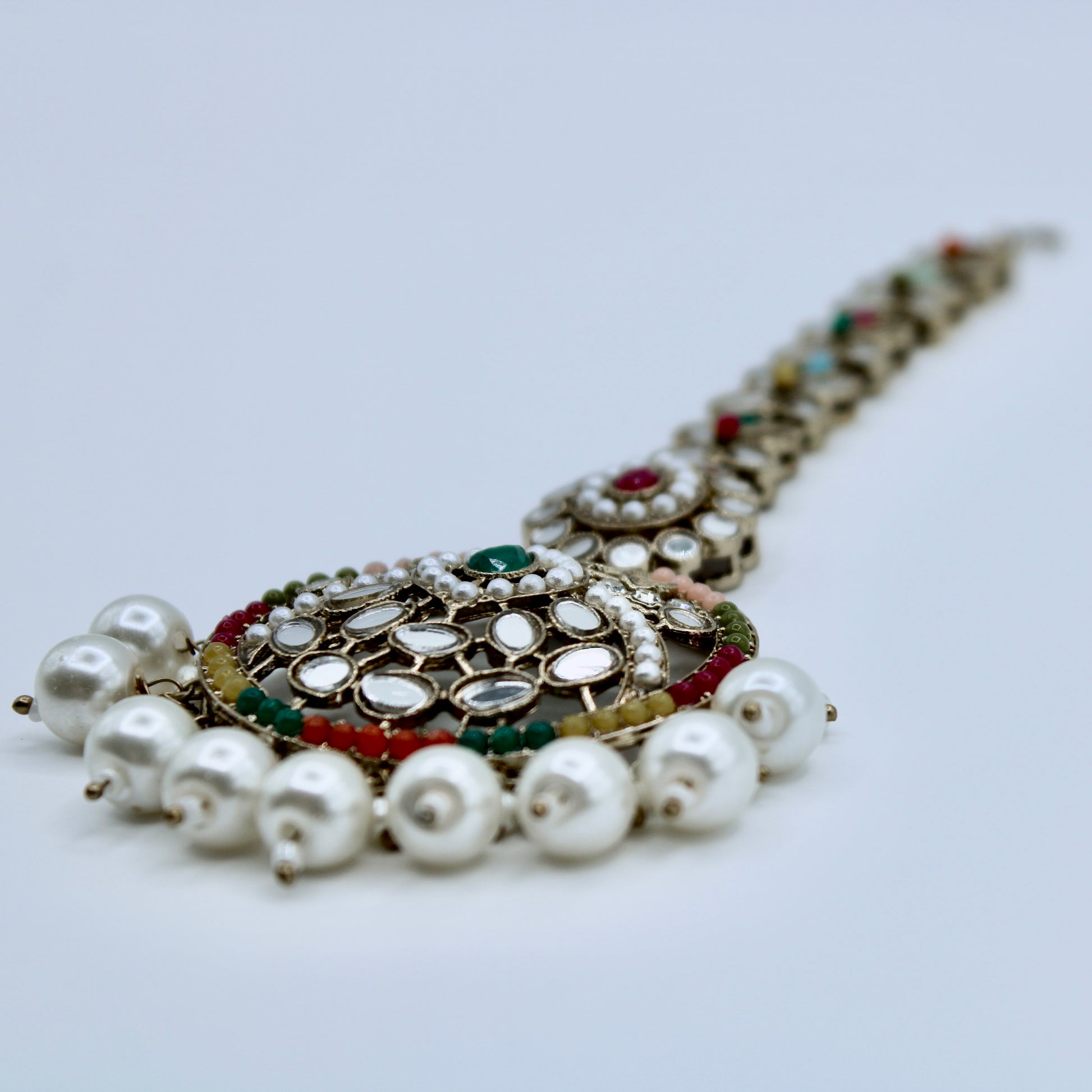 This traditional sheesha kundan teeka is complete with faux pearl and colourful beads detailing. This teeka can be paired with a variety of different looks and is suitable for all ages and occasions.