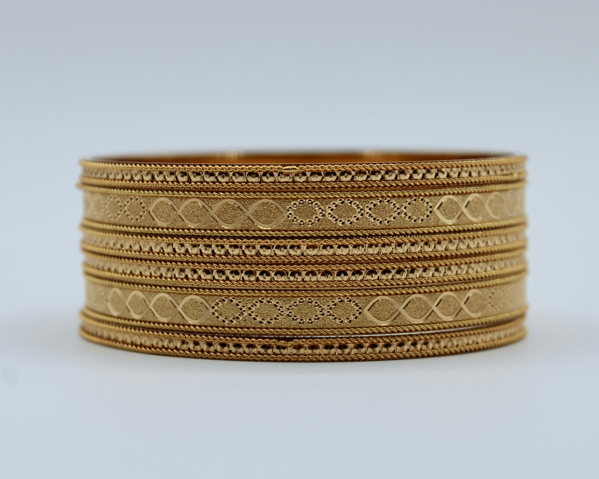 This traditional bangle and set is made to imitate gold. It can easily be paired with both Eastern and Western looks and is suitable for all ages. This design is sold in sets of six.