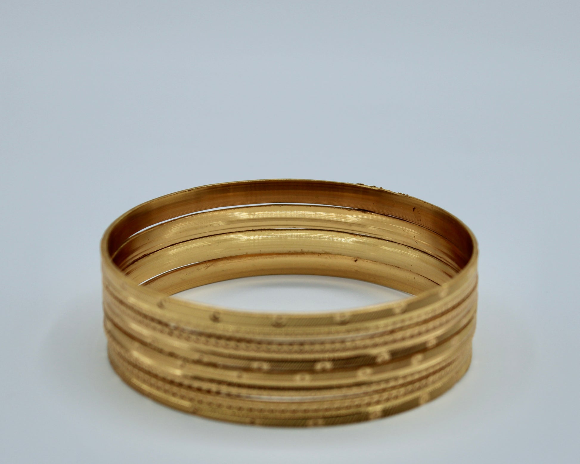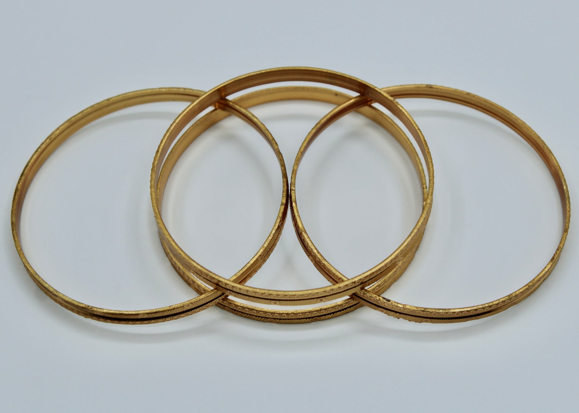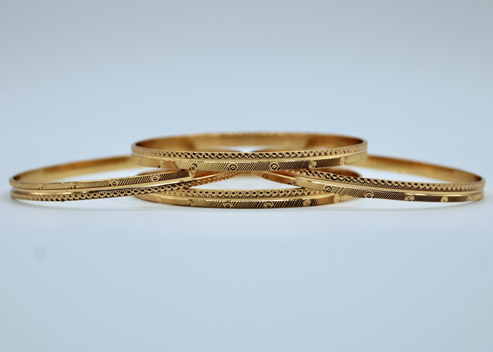 This traditional bangle set is made to imitate gold bangles. It can easily be paired with both Eastern and Western looks and is suitable for all ages. This design is sold in sets of four.