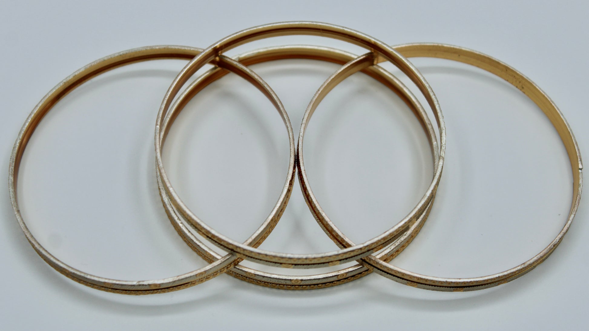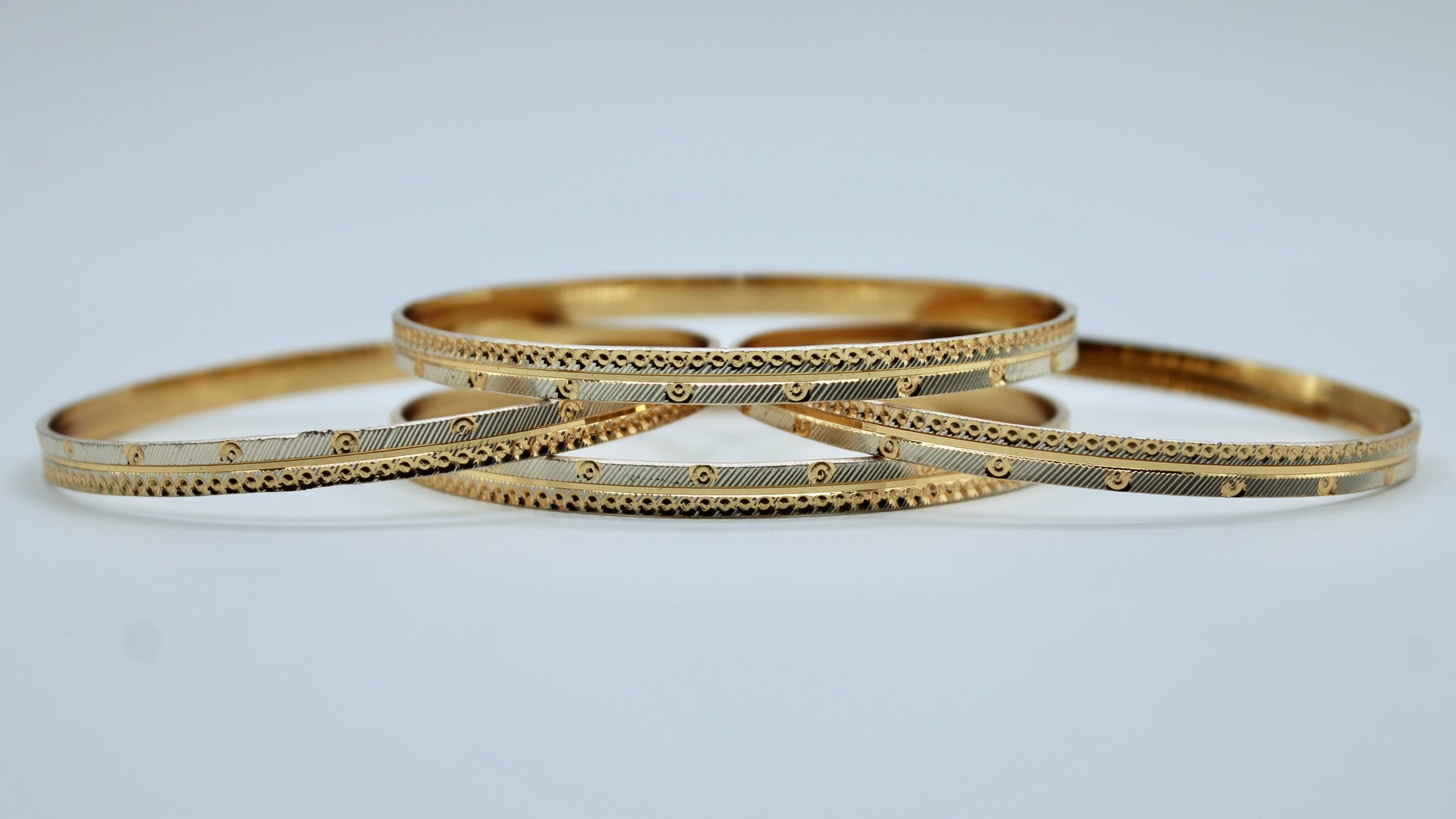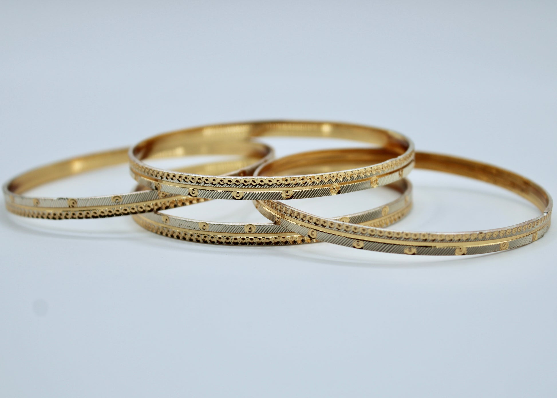 This traditional bangle set is made to imitate two-toned gold bangles. It can easily be paired with both Eastern and Western looks and is suitable for all ages. This design is sold in sets of four.