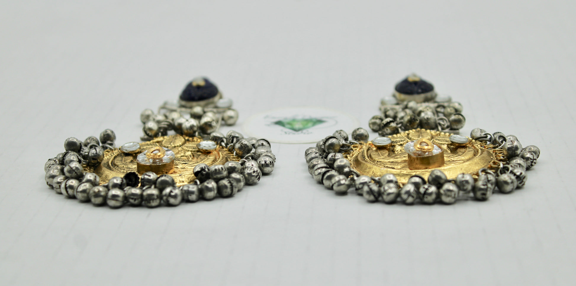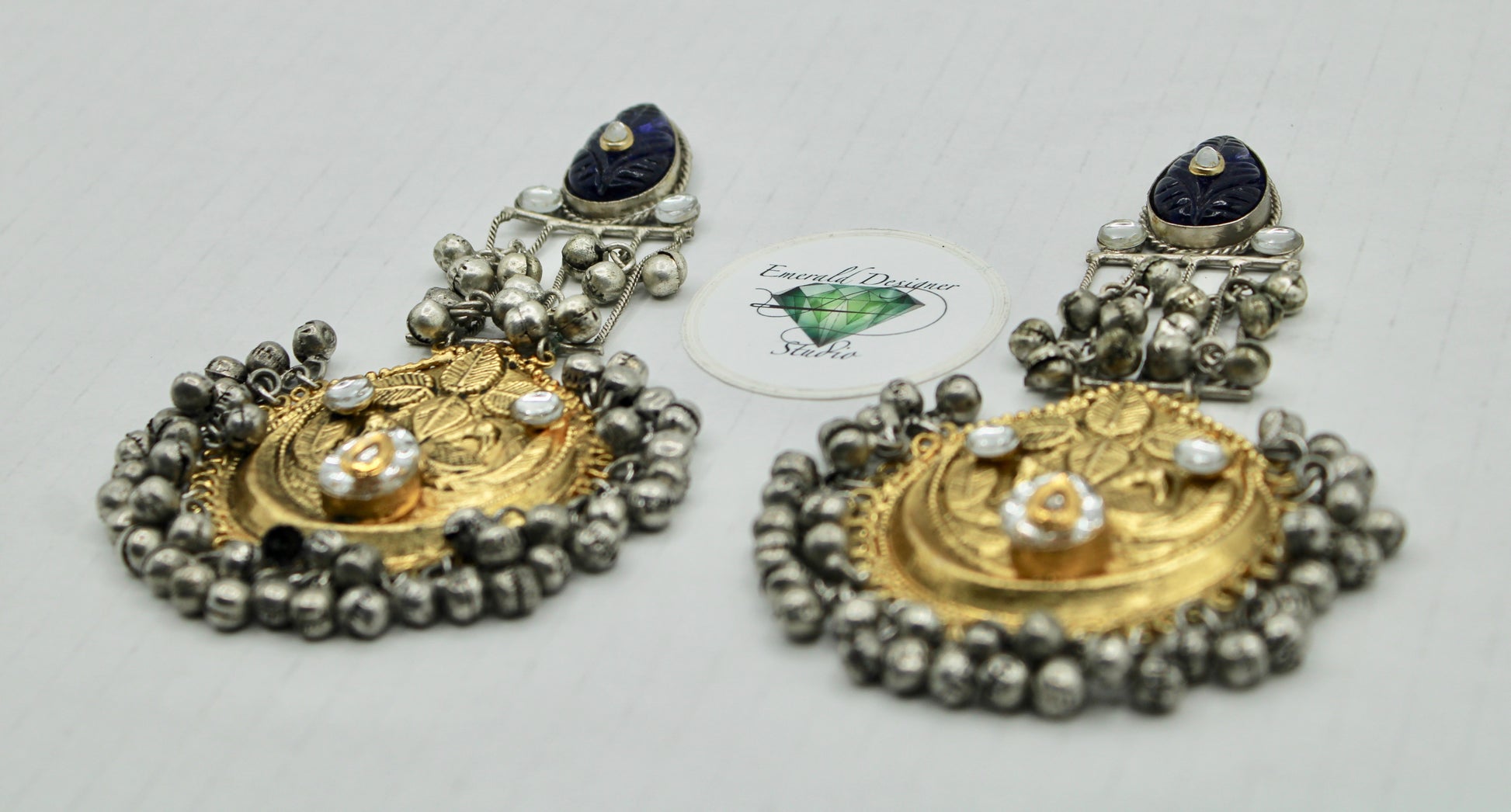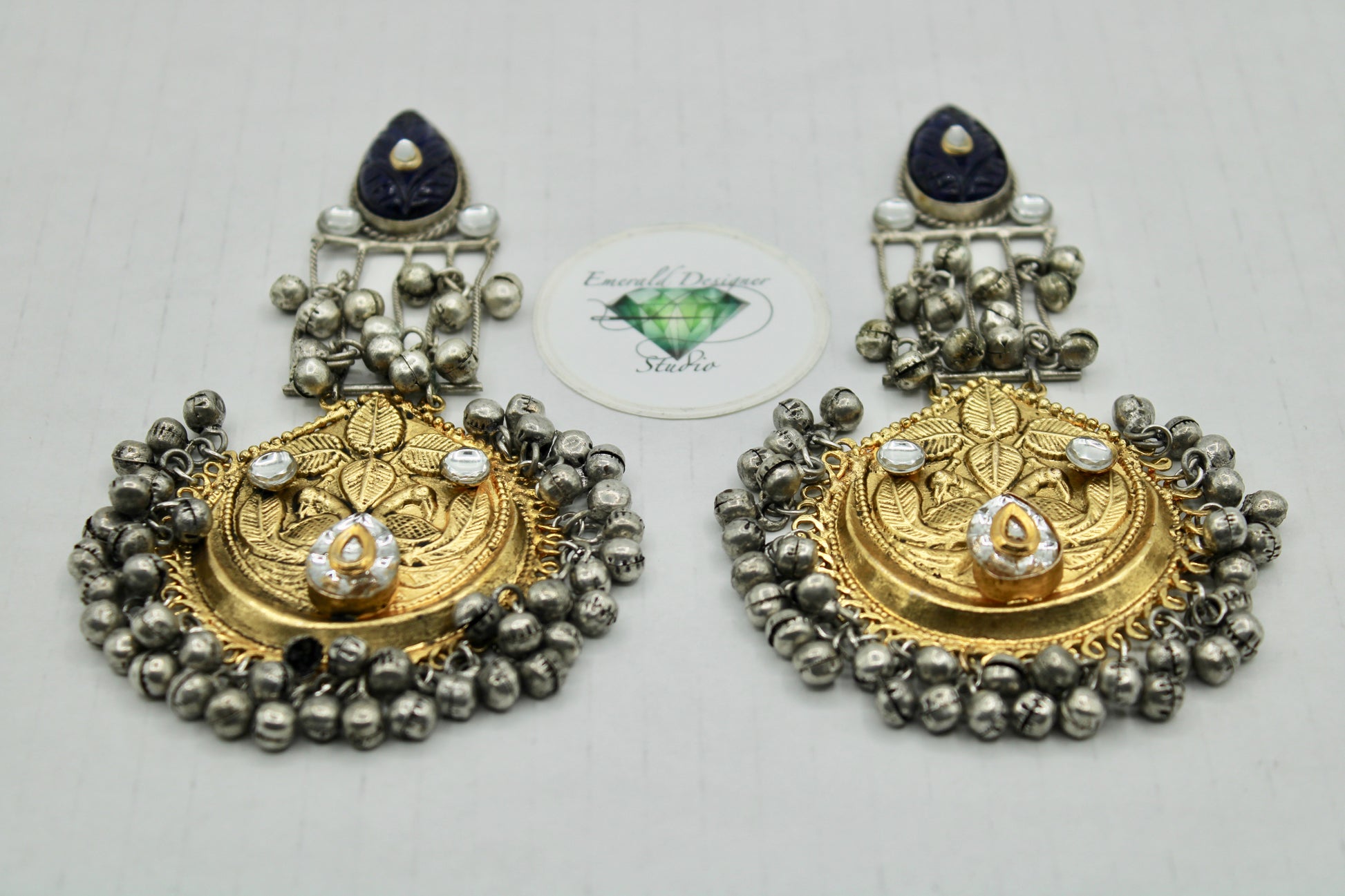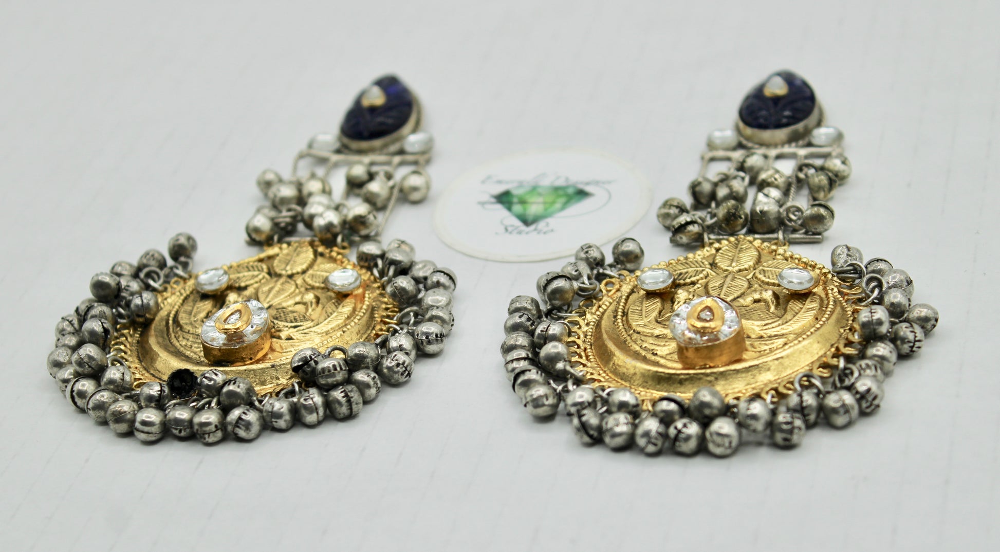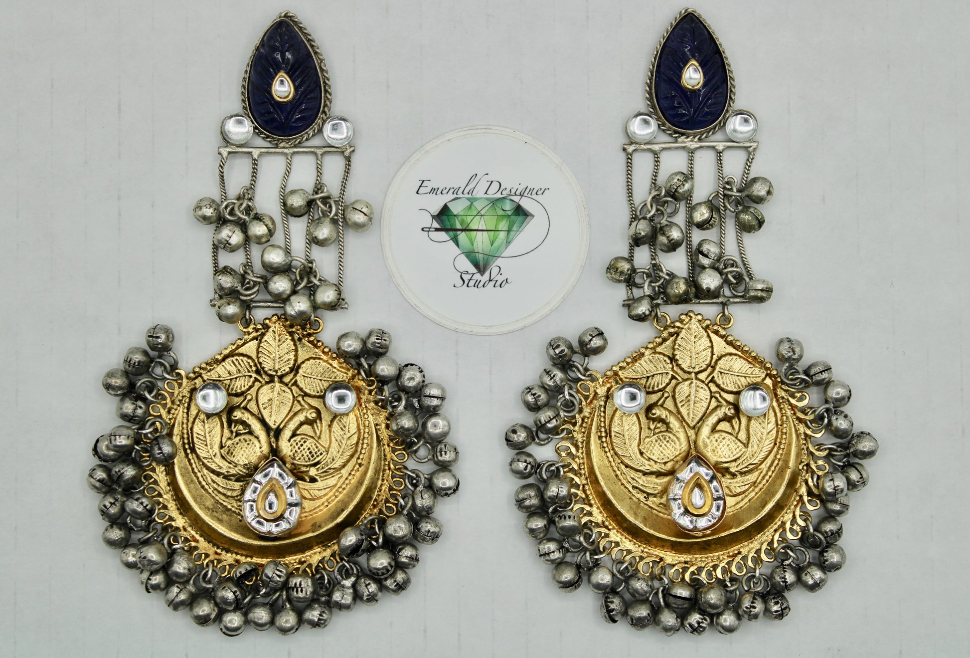 These unique oxidized earrings are complete with kundan and ghungroo detailing. They are two-toned, and can be paired with both Eastern and Western outfits.