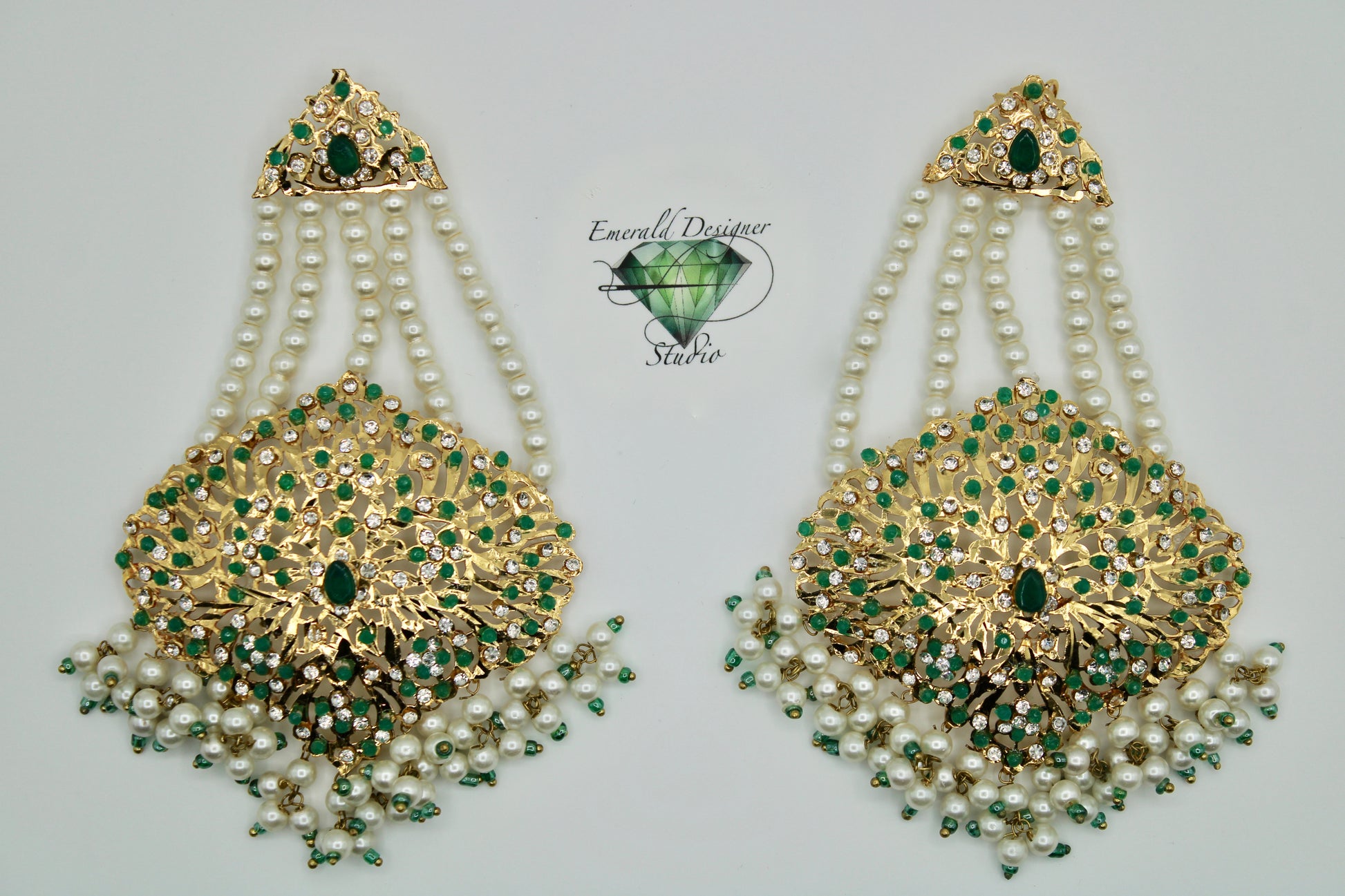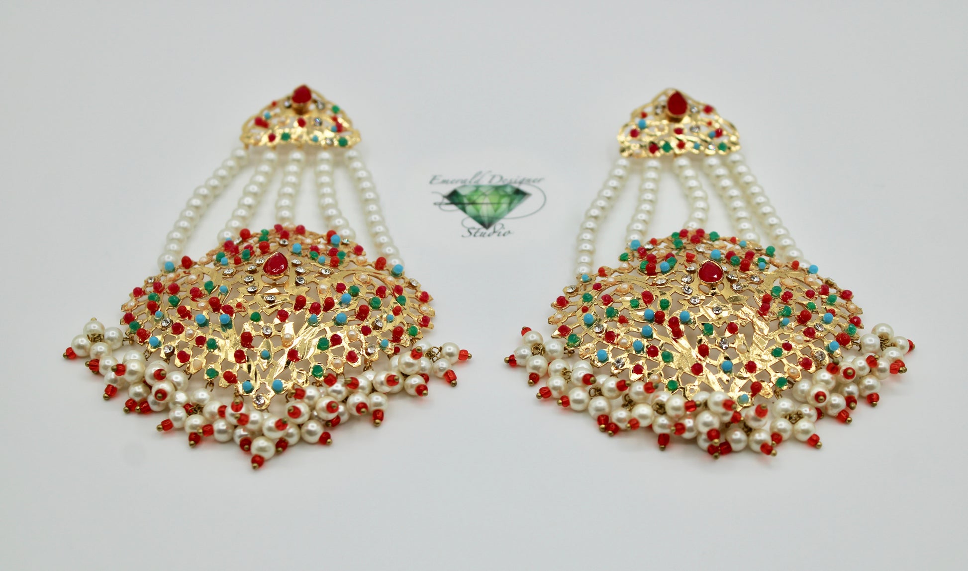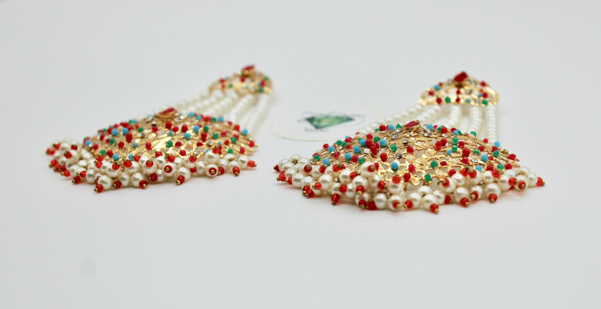 These stunning Hyderabadi jhumer earrings are complete with faux pearl and cubic zirconia detailing throughout. Available in two colours.