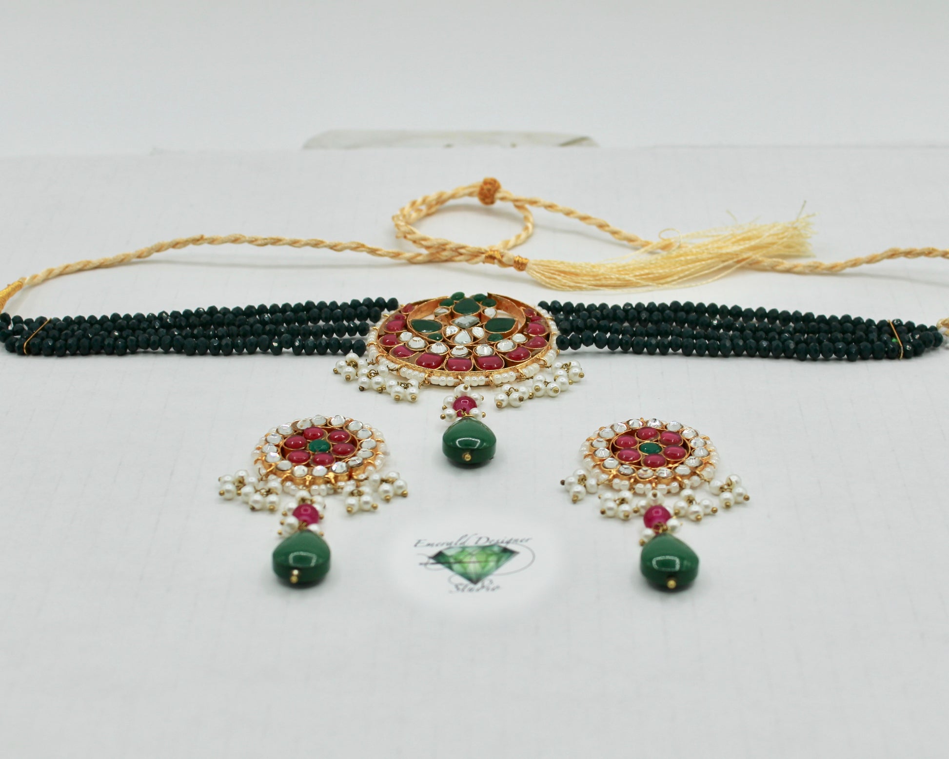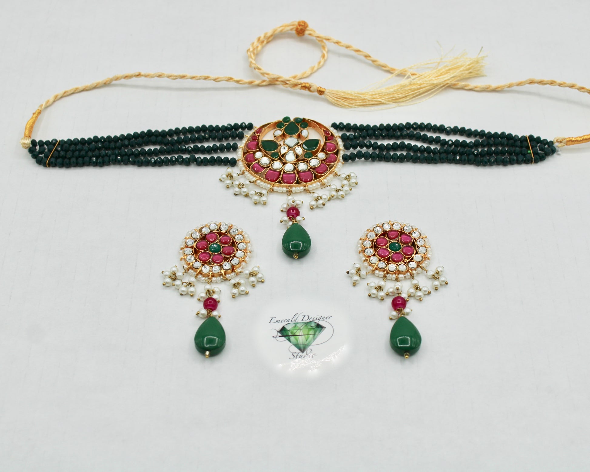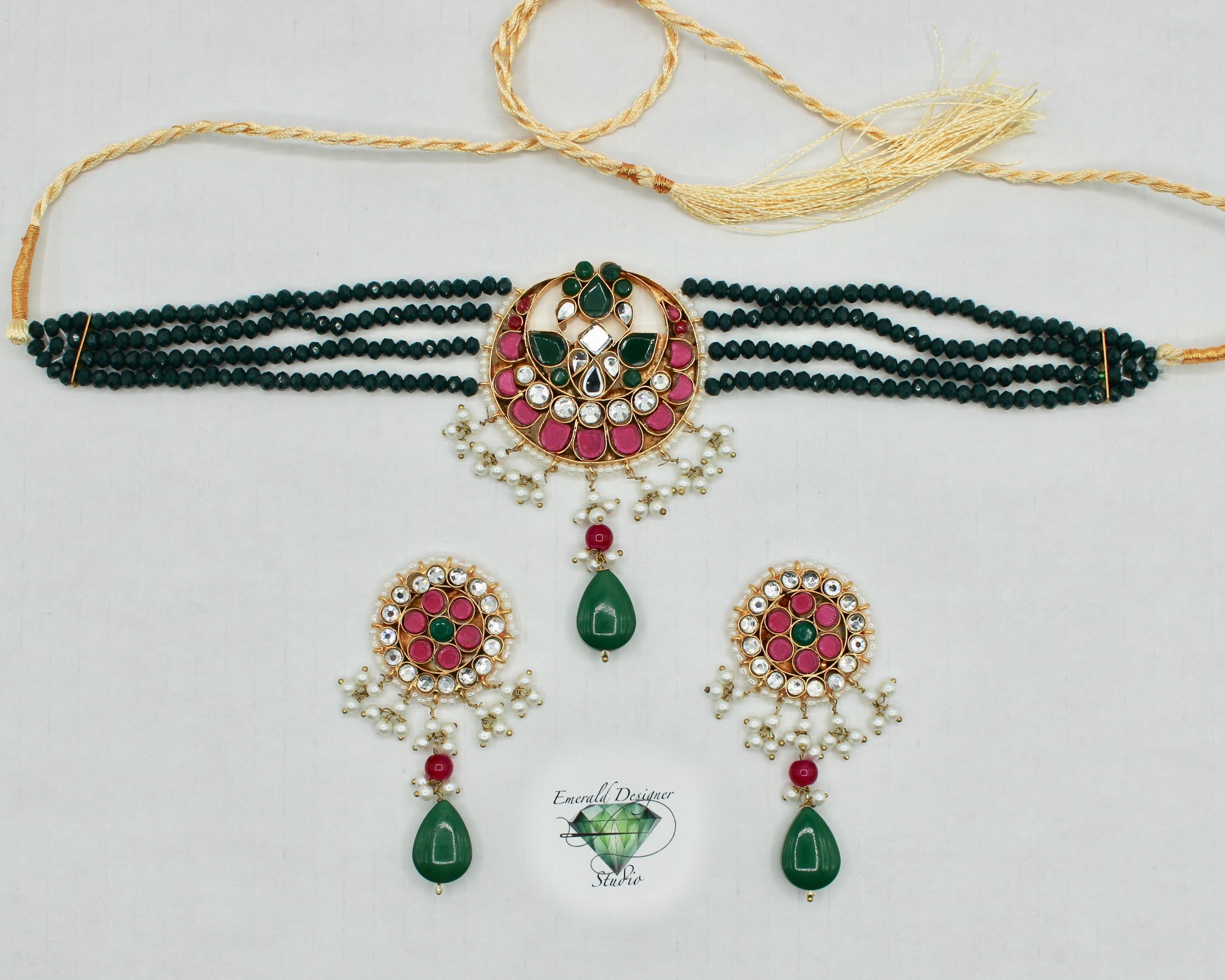 This unique choker necklace set is complete with hydro bead detailing throughout, and is finished with kundan gems and faux pearls. It is complete with matching small earrings.