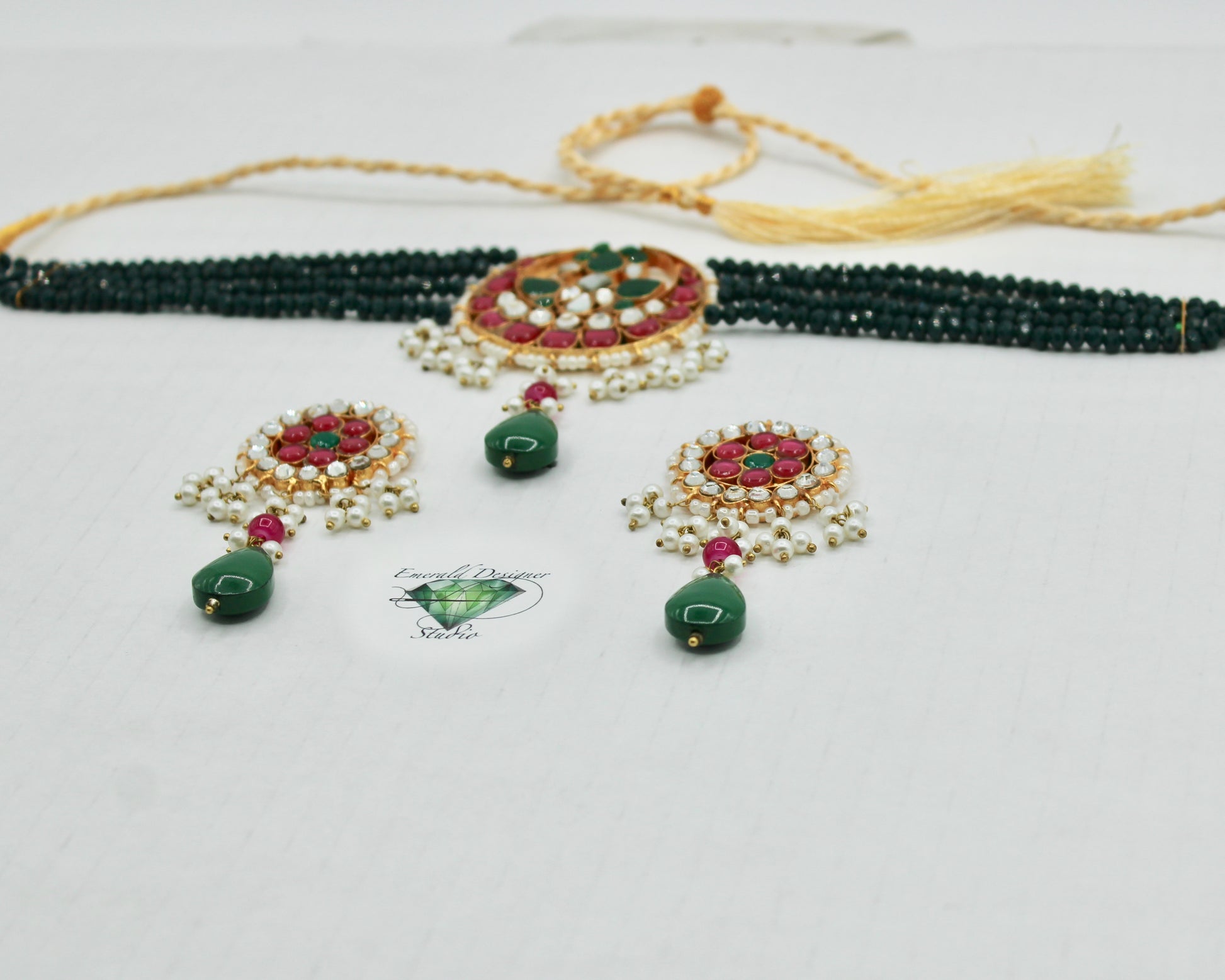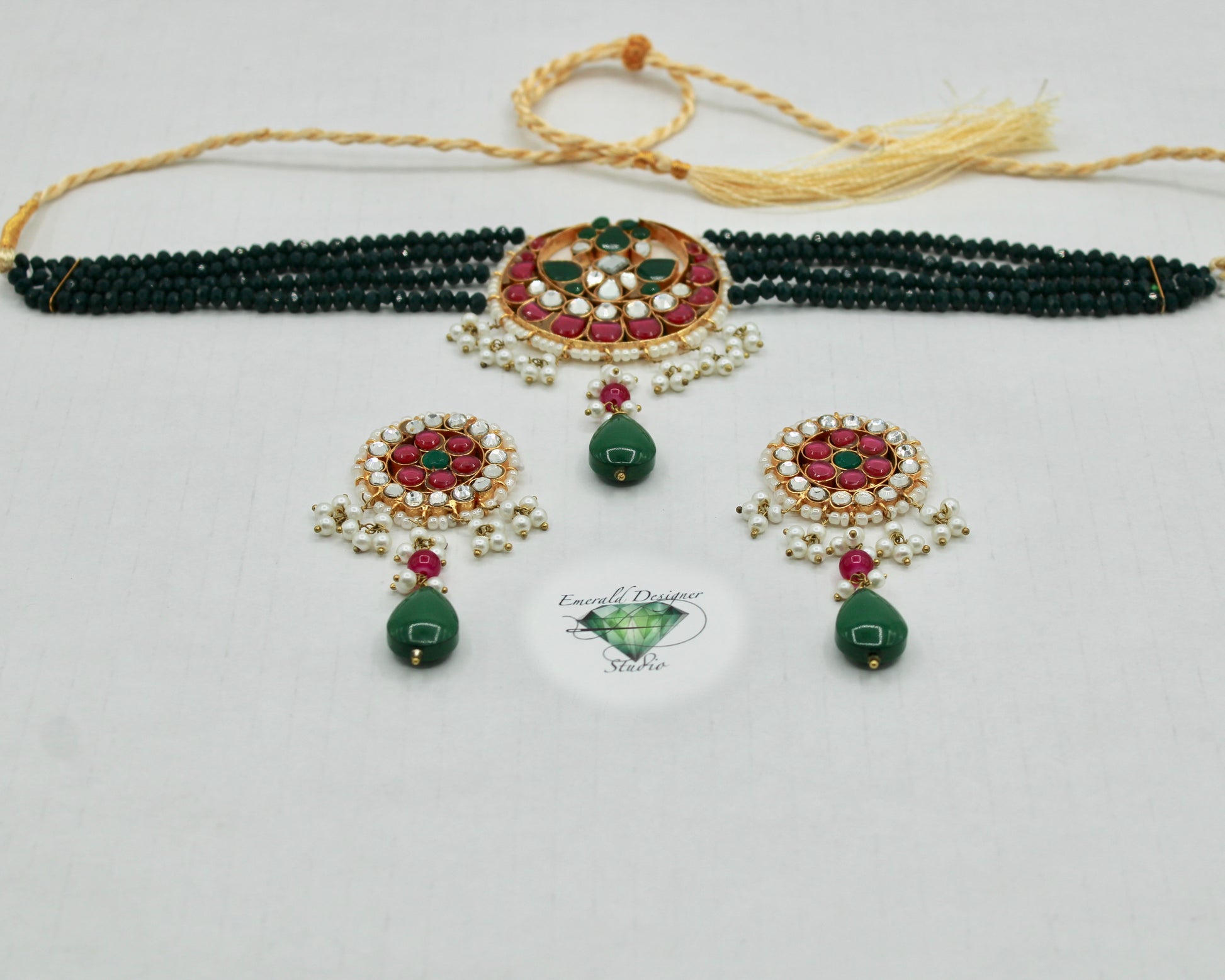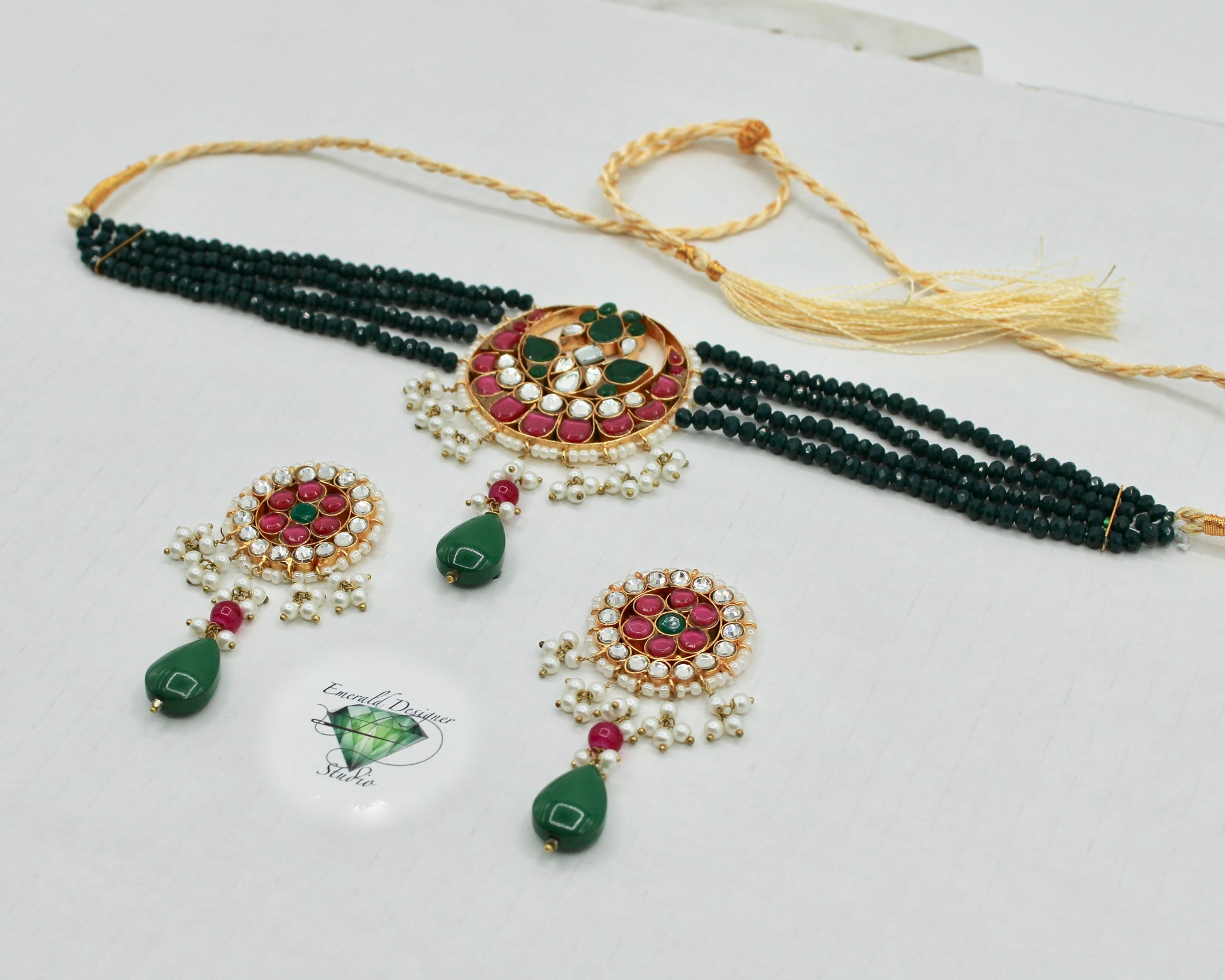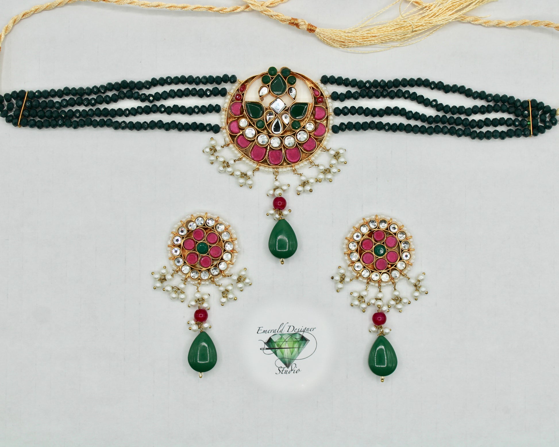 This unique choker necklace set is complete with hydro bead detailing throughout, and is finished with kundan gems and faux pearls. It is complete with matching small earrings.