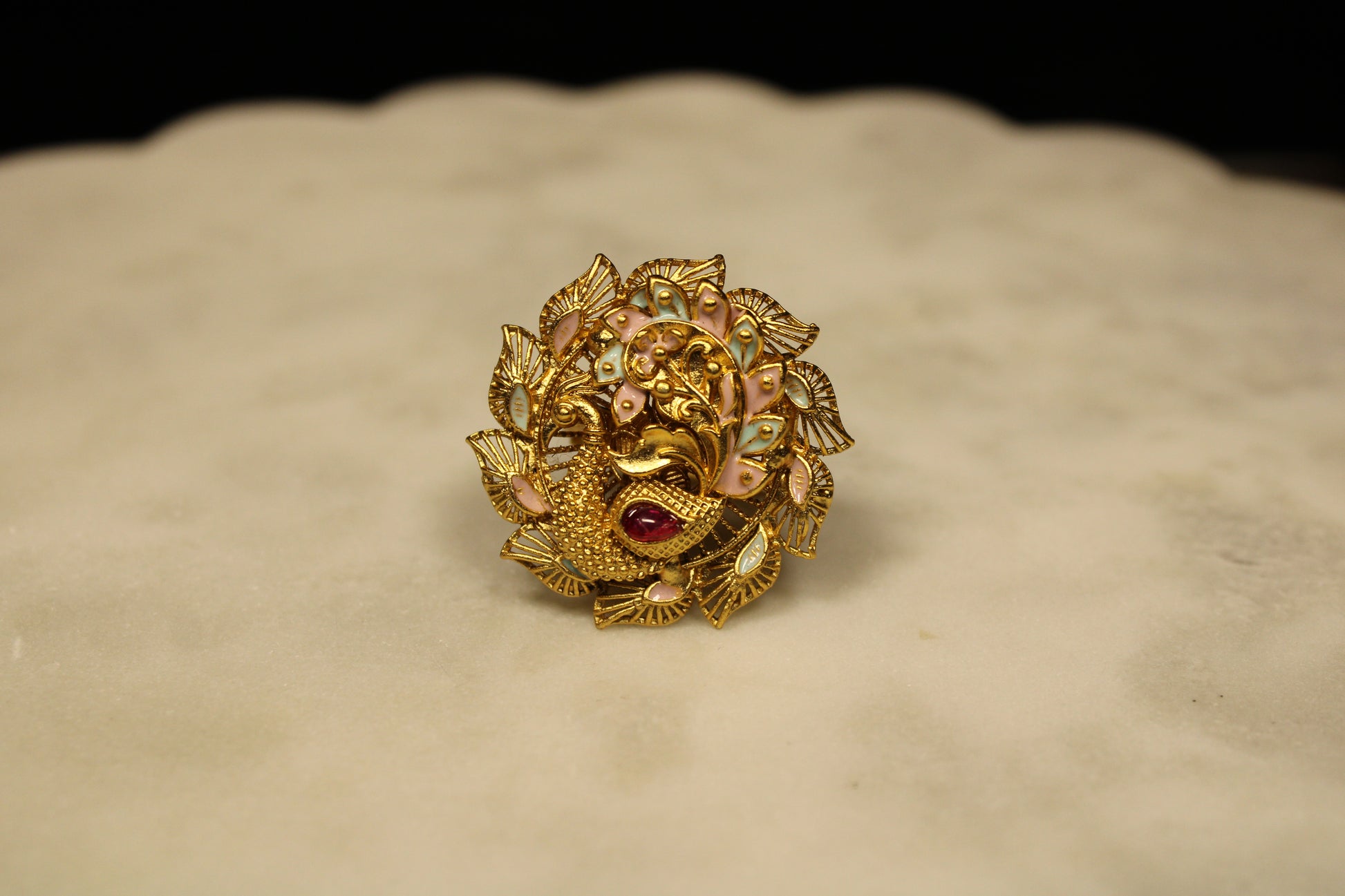 روایتی طور پر راجواڑی انداز میں تیار کیا گیا یہ مینا کاری انگوٹھی منفرد ہے اور آپ کی انگوٹھی کے مجموعہ کے لیے بہترین اضافہ ہو سکتی ہے۔