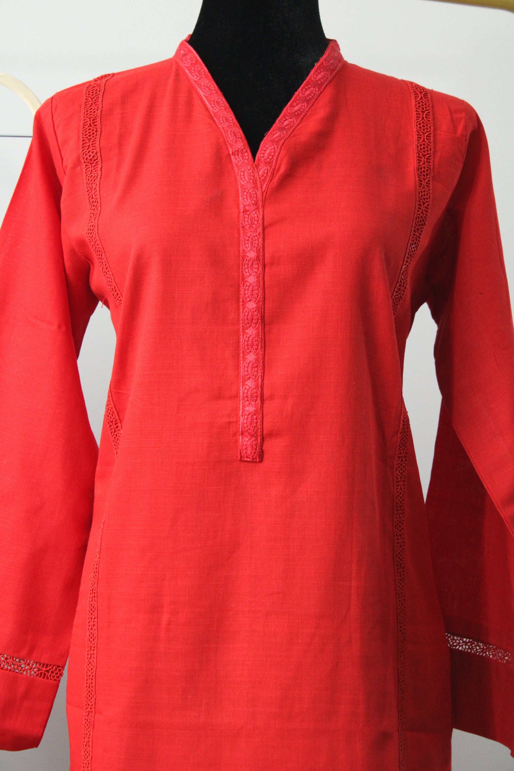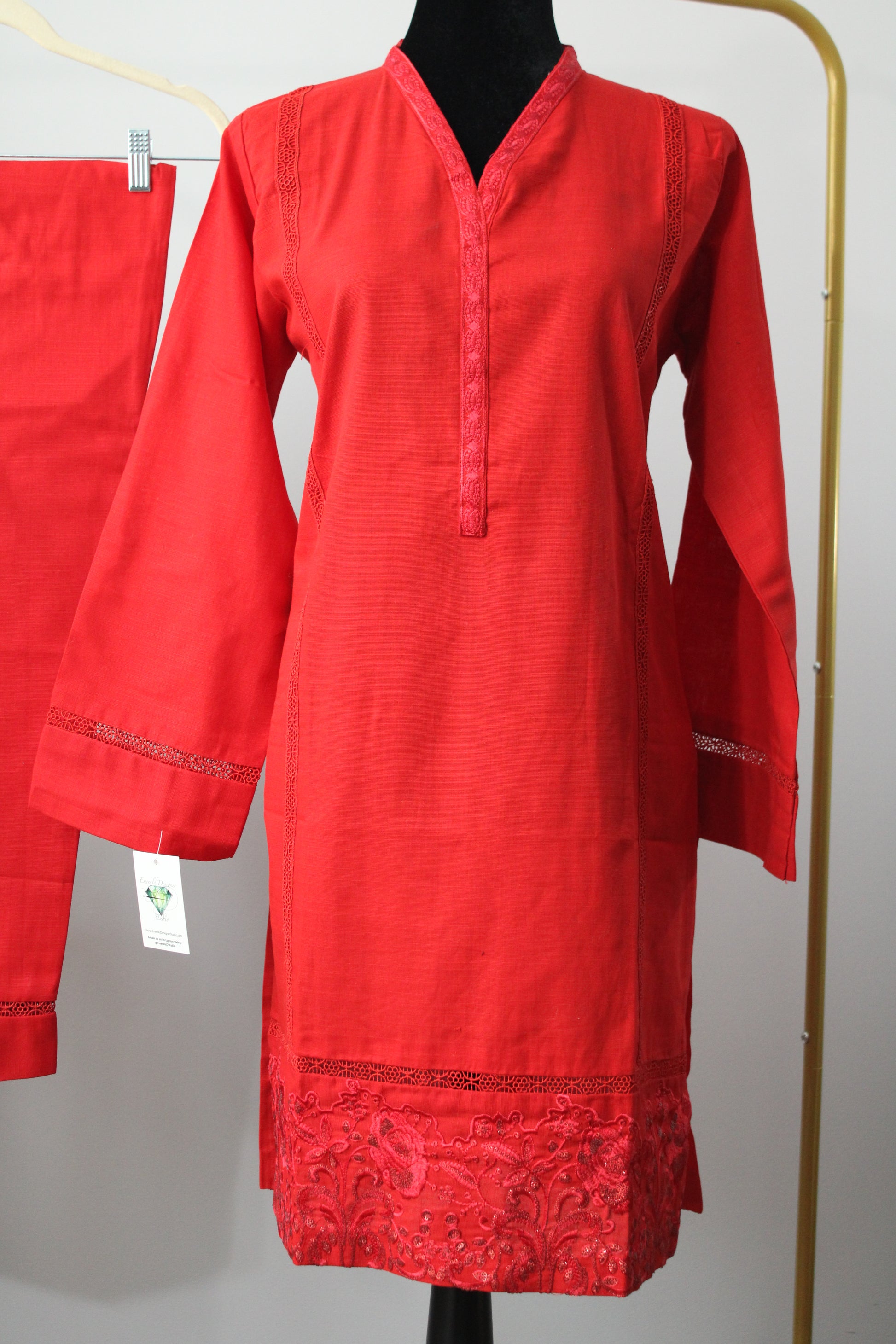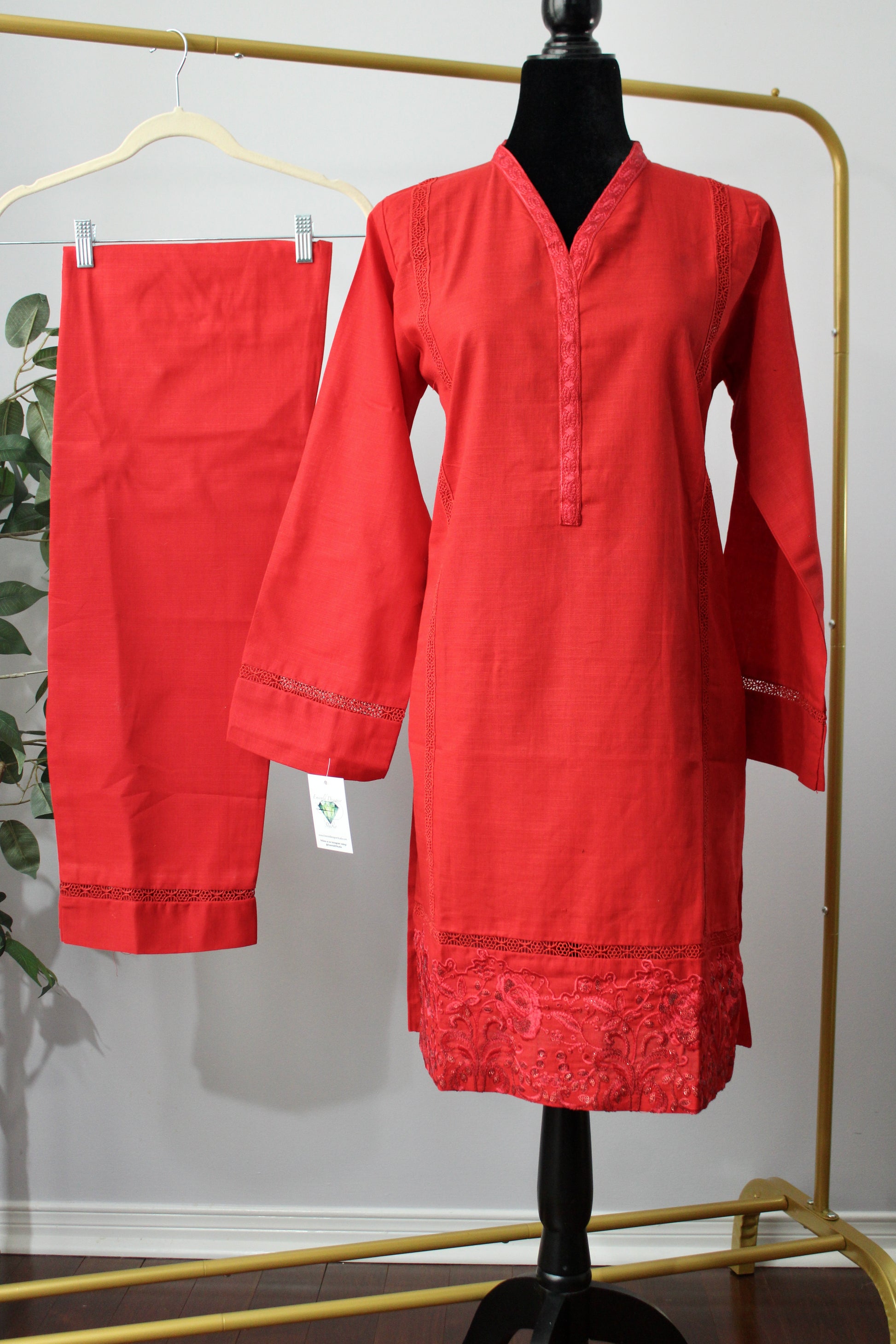 اس خوبصورت کُرتا سیٹ میں کھدر کُرتا اور ٹراؤزر شامل ہیں، جو کہ دیدہ زیب اور دھاگے کے کام کے ساتھ مکمل ہیں۔ 2 پیس سوٹ، سلایا ہوا اور پہننے کے لیے تیار ہے۔