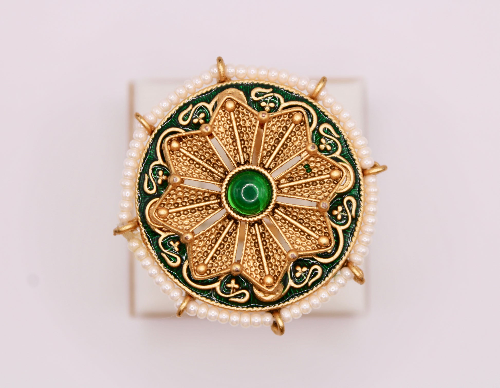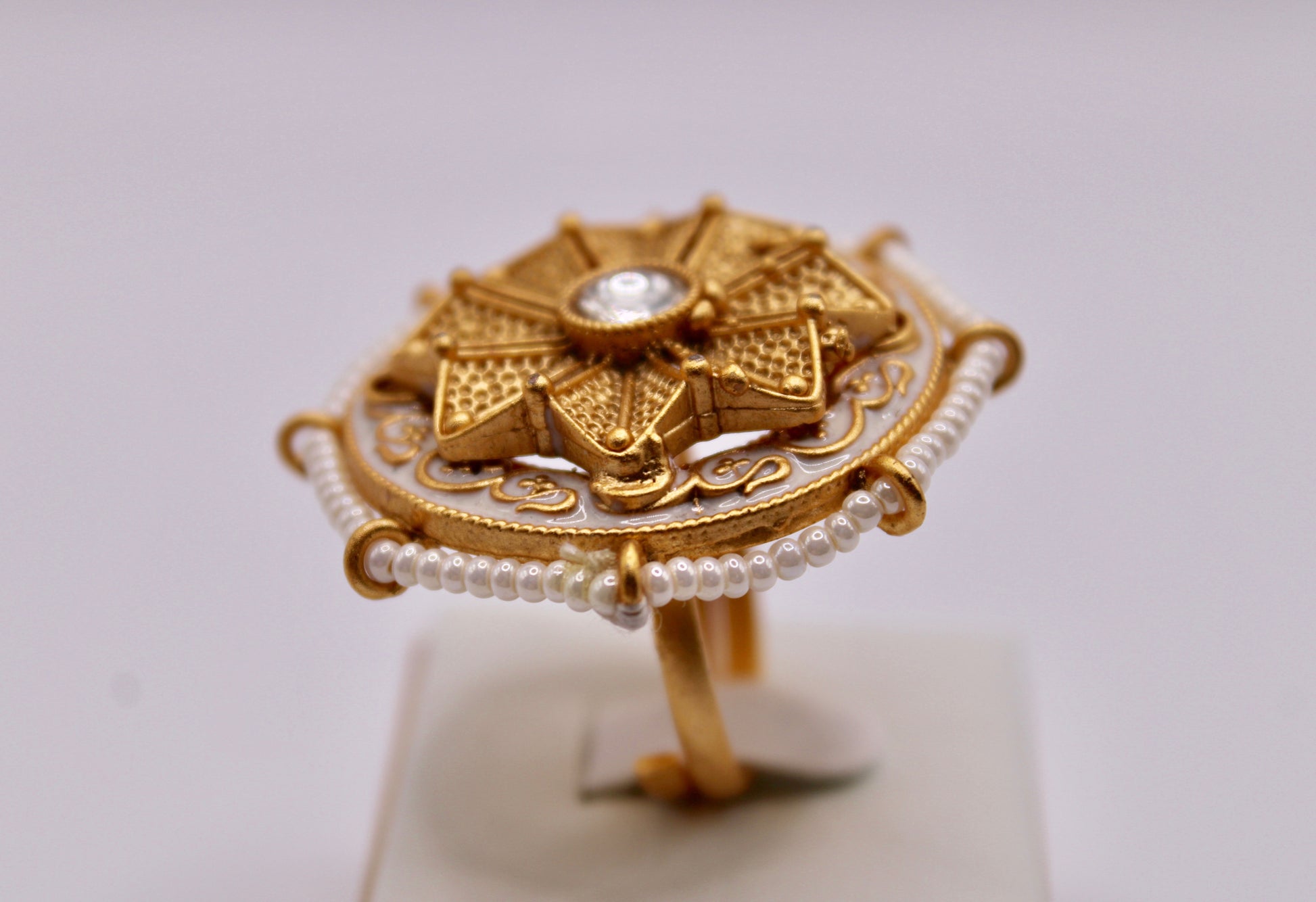 This traditional Rajwadi ring features a beautiful meena and kundan design. This ring is adjustable and sure to elevate any outfit.