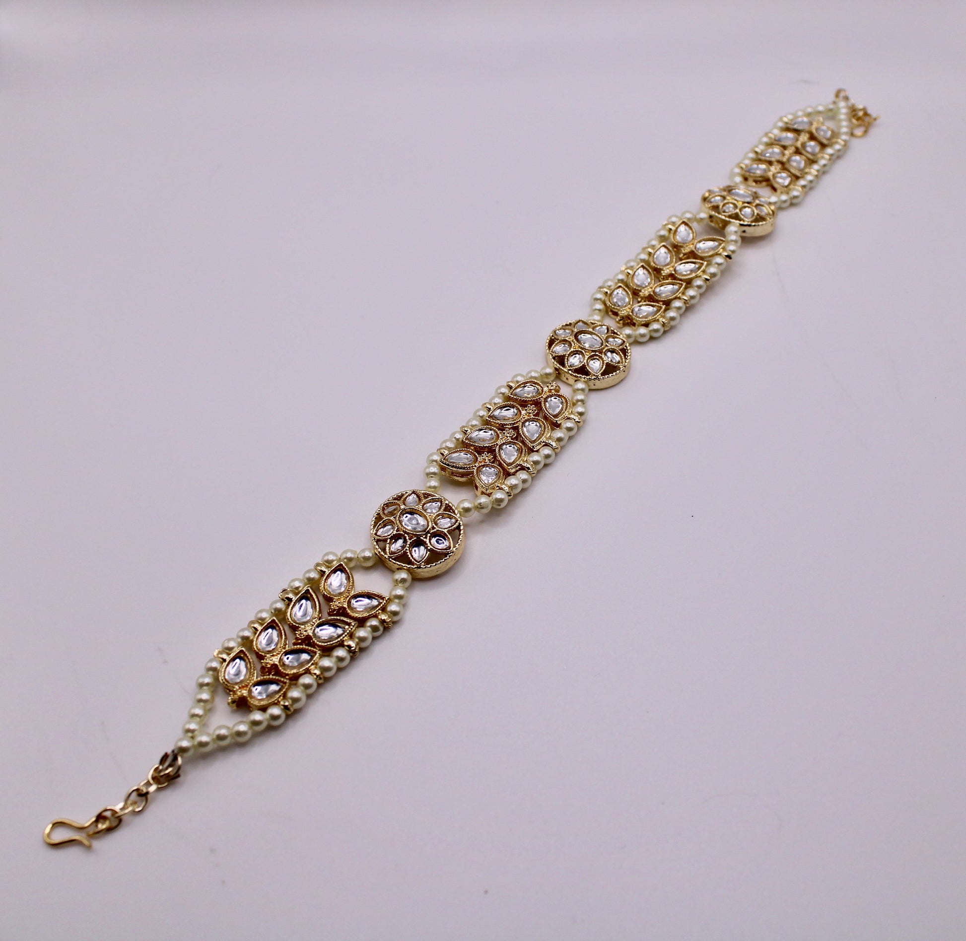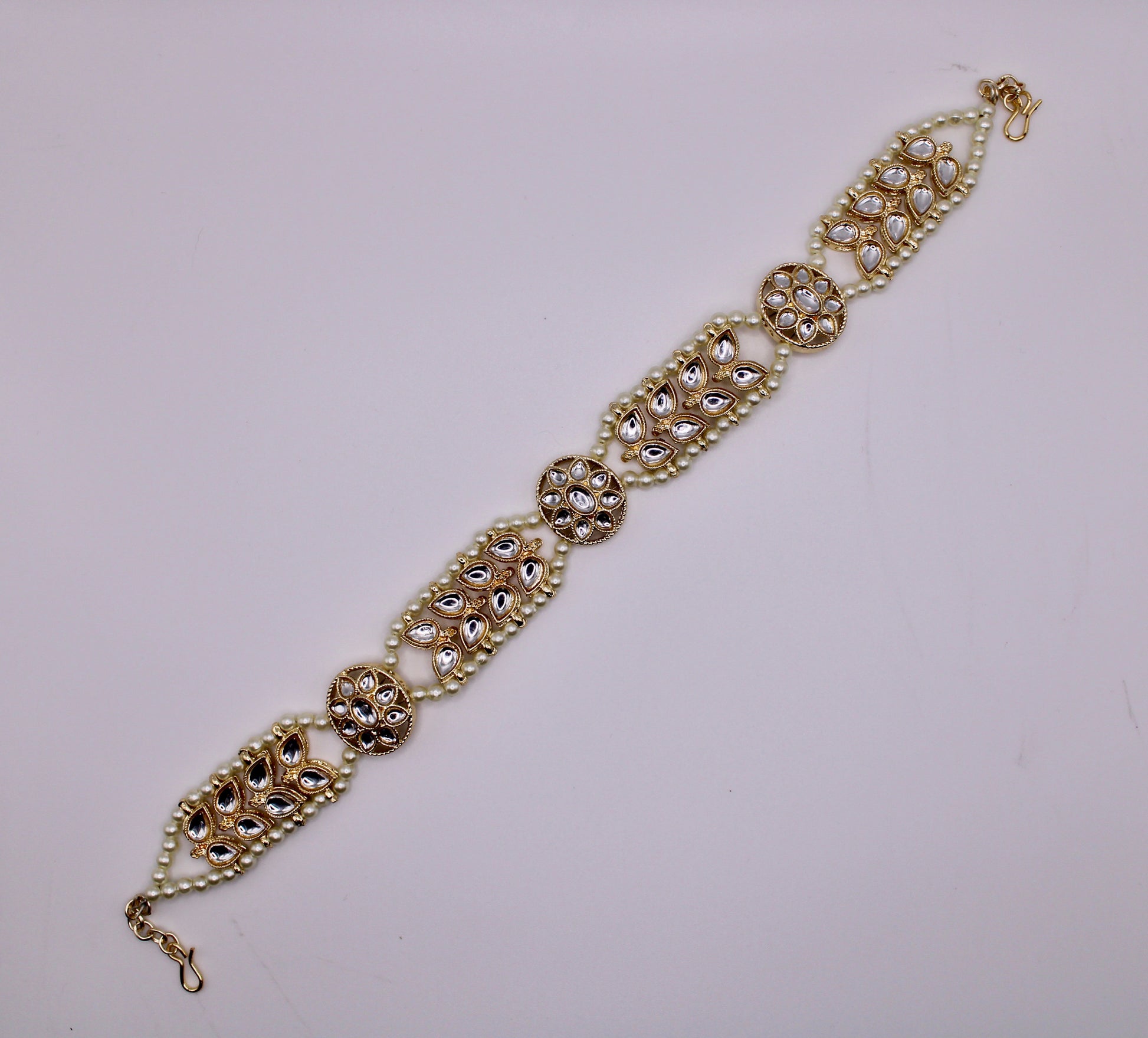 This dainty mathha pati is the perfect accessory to elevate any look, and is perfect for all ages and occasions. It is complete with faux pearl and kundan detailing.