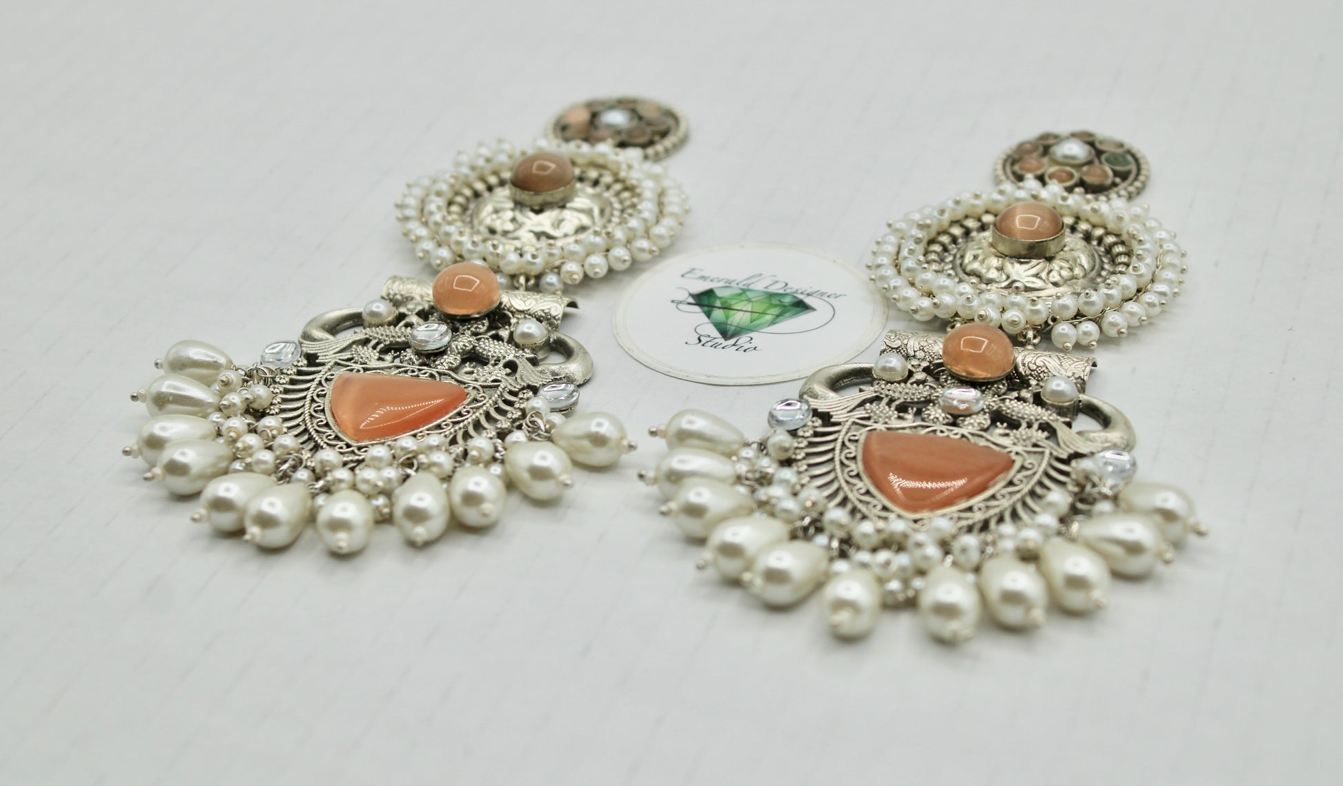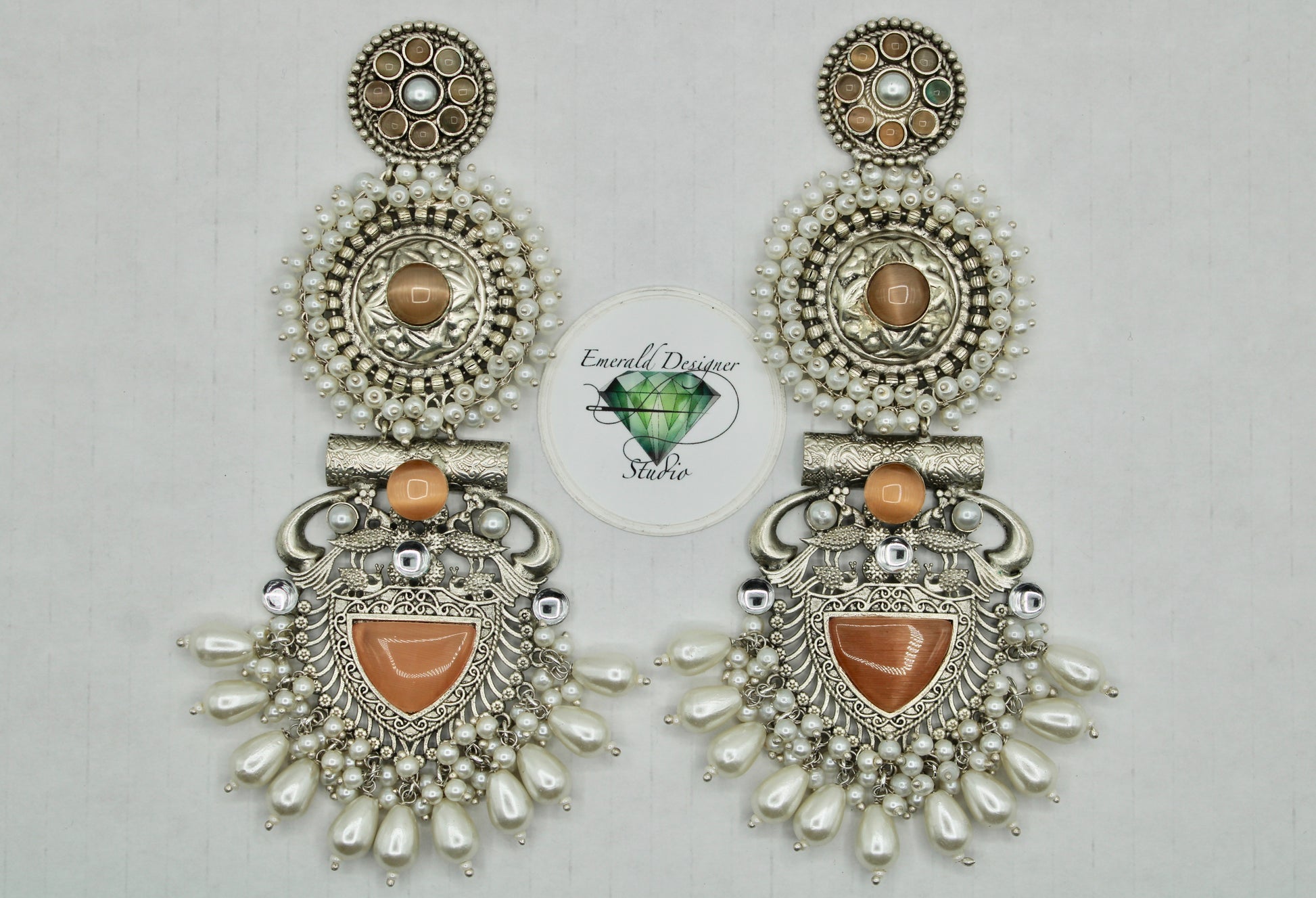 These stunning oxidized earrings are complete with monalisa, faux pearl, and kundan detailing throughout. They are the perfect mix between contemporary and vintage, and will easily elevate any look.