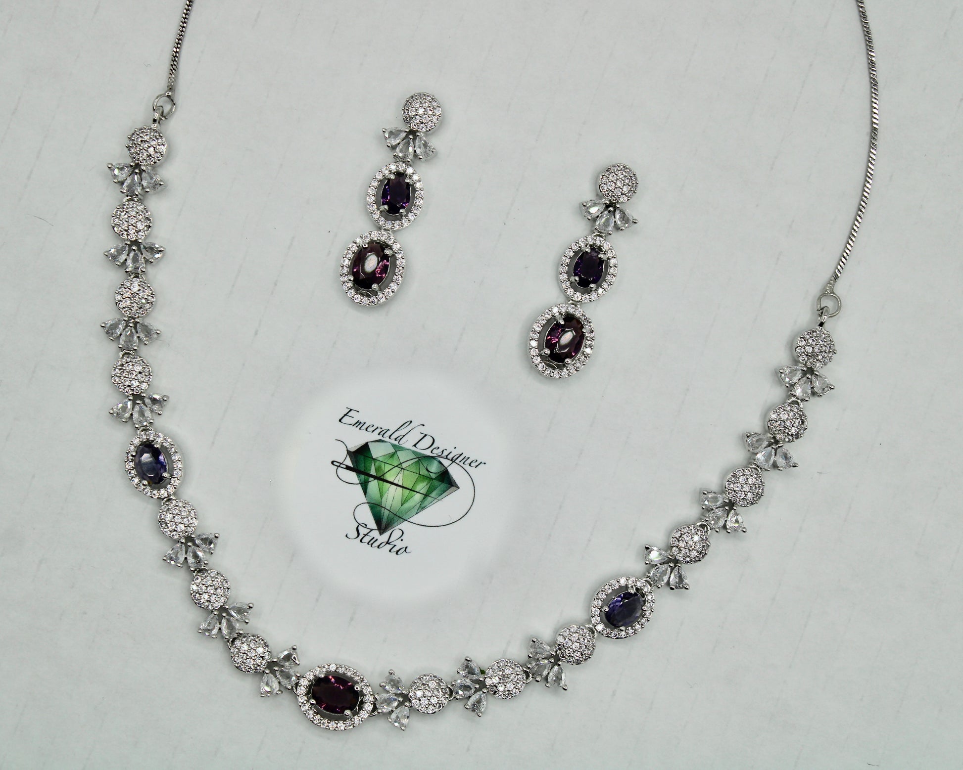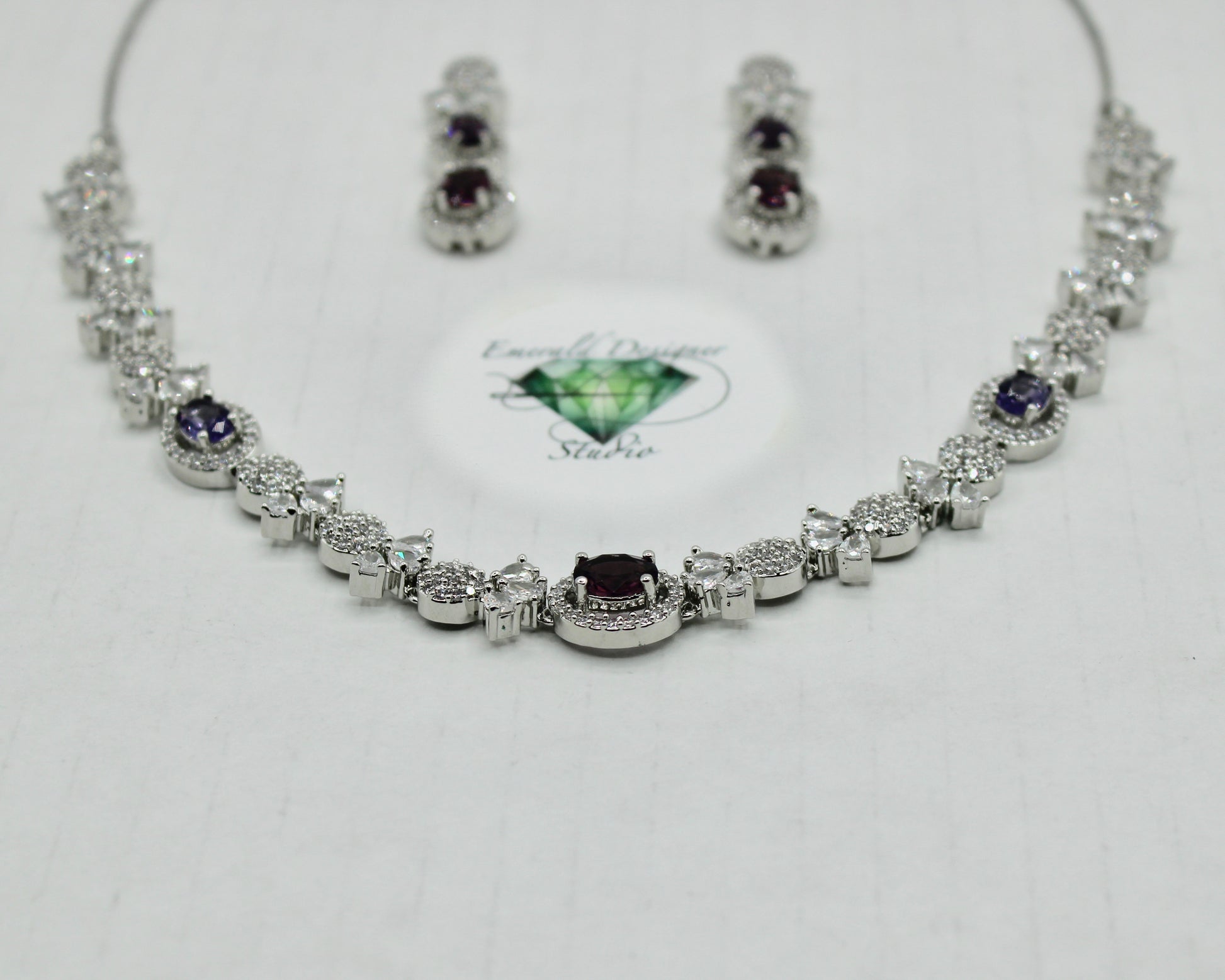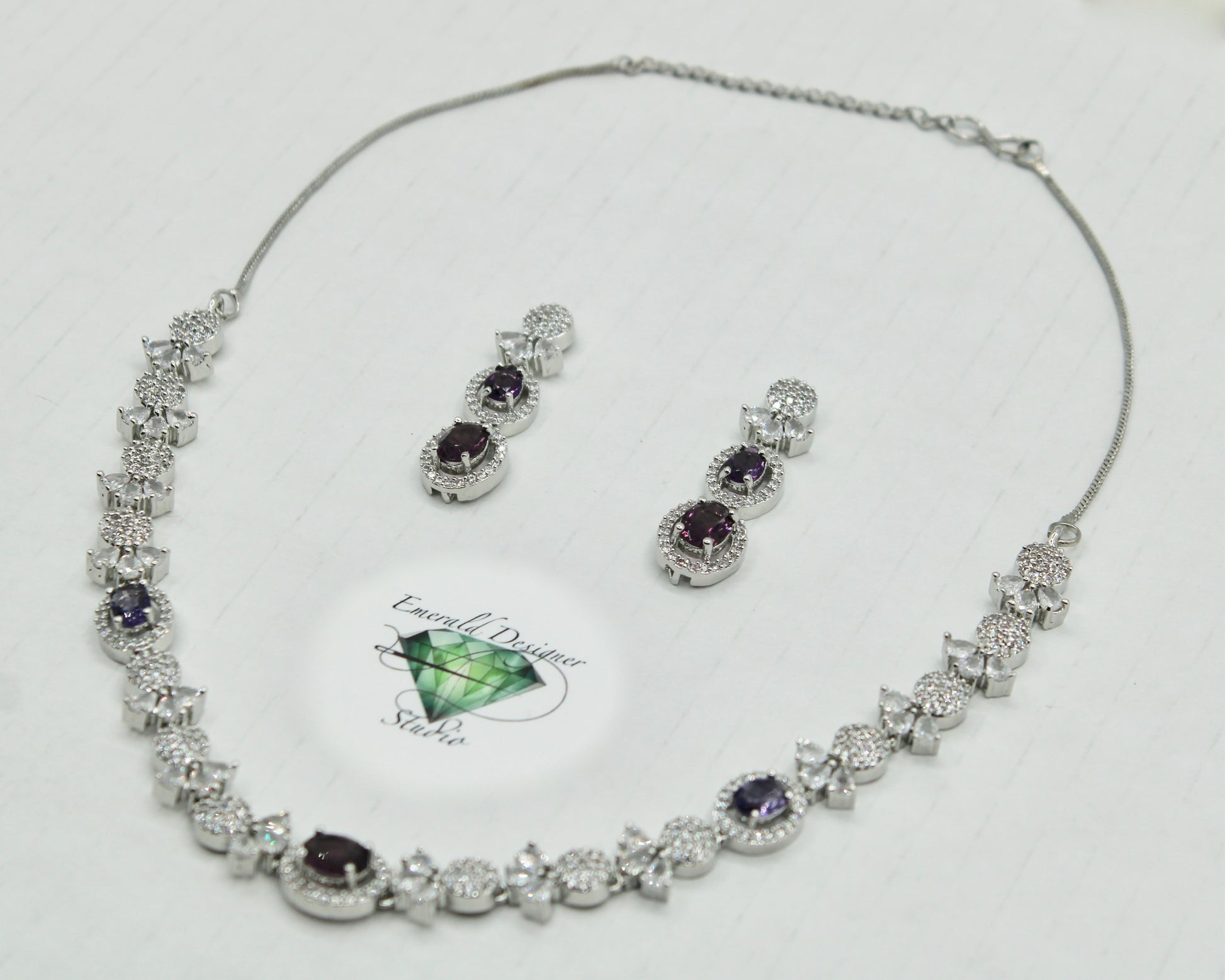 یہ دلکش ہار سیٹ مختلف قسم کے کیوبک زرکونیا کٹس کے ساتھ مکمل ہے، اور اس میں مماثل بالیاں بھی شامل ہیں۔ دو رنگوں میں دستیاب ہے۔