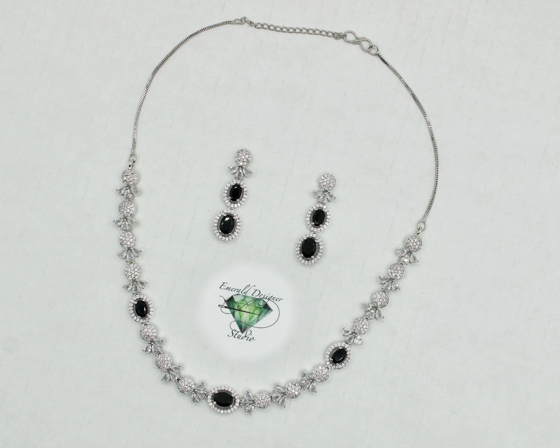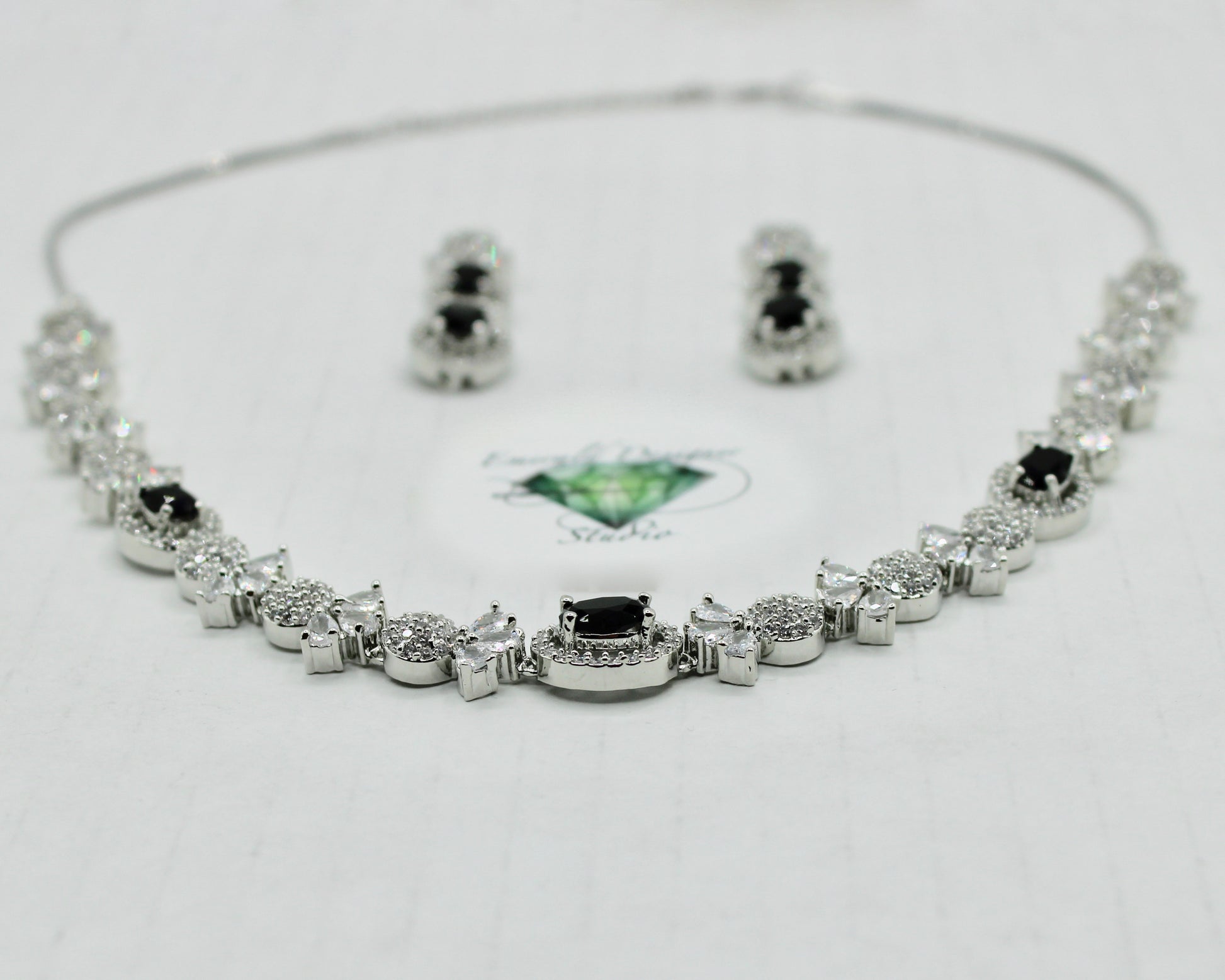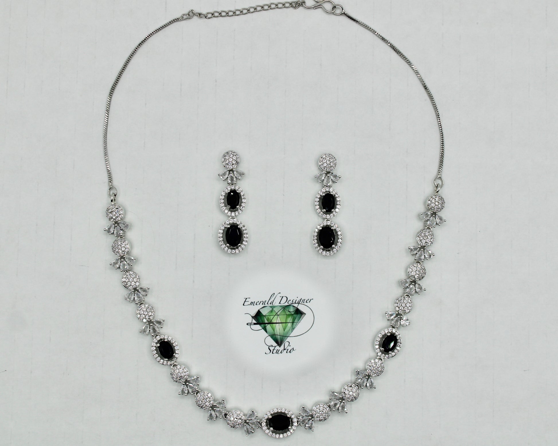 یہ دلکش ہار سیٹ مختلف قسم کے کیوبک زرکونیا کٹس کے ساتھ مکمل ہے، اور اس میں مماثل بالیاں بھی شامل ہیں۔ دو رنگوں میں دستیاب ہے۔