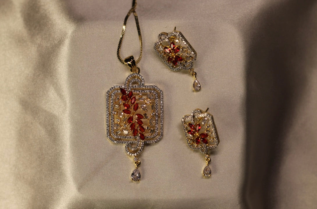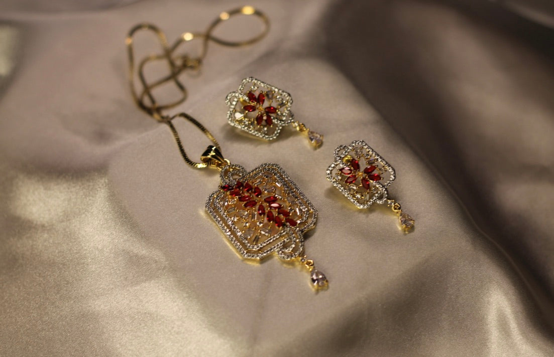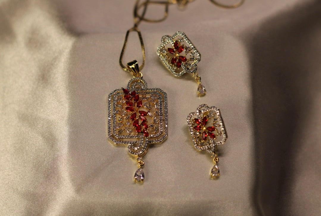 یہ شاندار روبی اور کیوبک زرکونیا لٹکن سیٹ ایک آنکھ پکڑنے والا ہے۔ یہ سیٹ بہت سوچ سمجھ کر تیار کیا گیا ہے جس میں مماثل سٹڈز، چین بھی شامل ہے۔ مصنوعات کی زندگی بھر میں اضافہ کرنے کے لیے پیتل سے بنا ہے۔