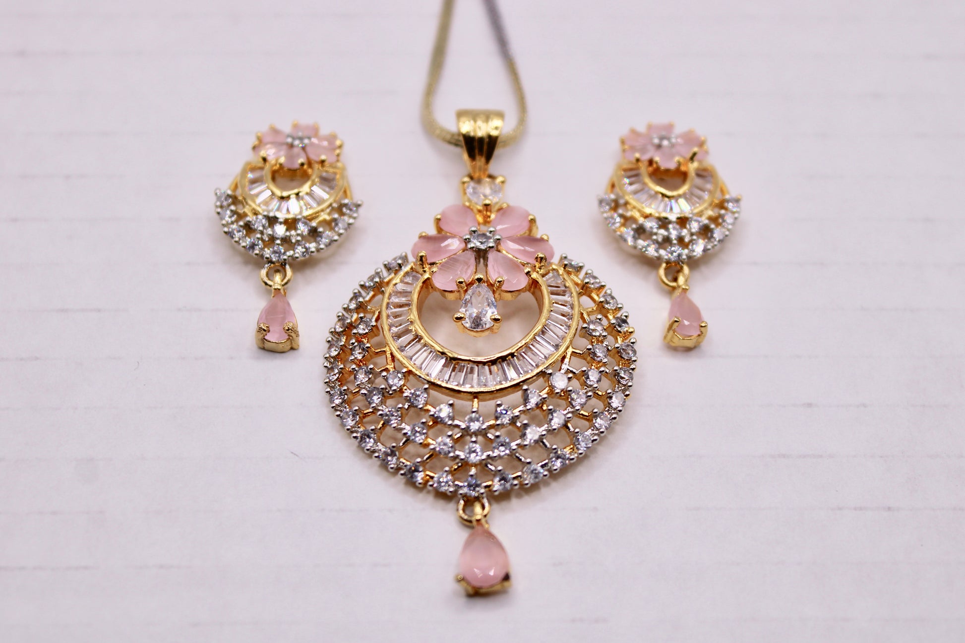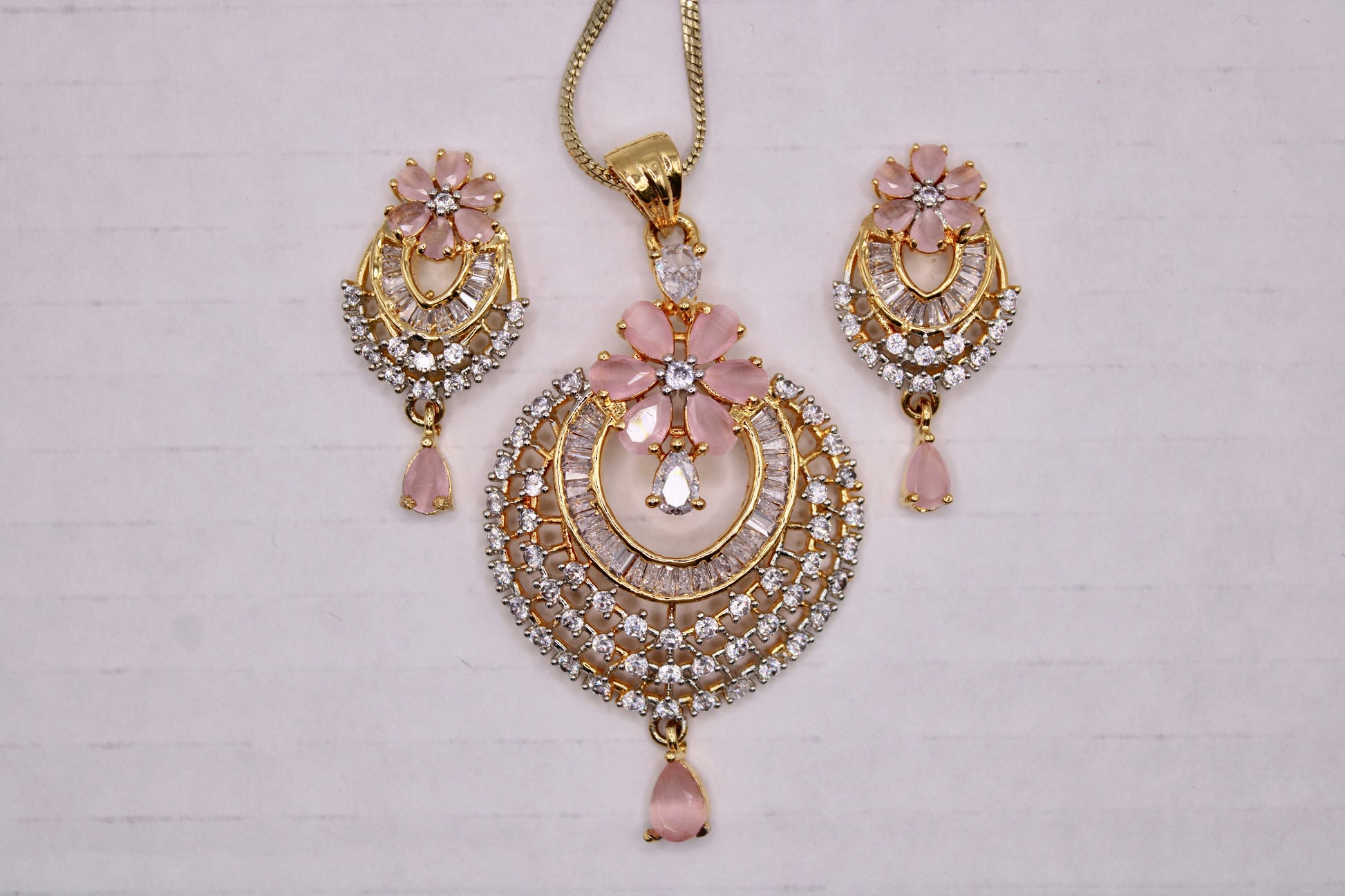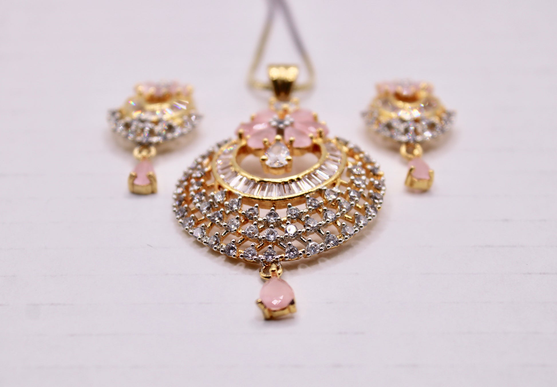یہ نفیس لٹکن سیٹ پیسٹل گلابی کیوبک زرکونیا کے ساتھ مکمل ہے اور آپ کے پورے سال کے لیے بہترین ہے۔ یہ سیٹ مماثل جڑوں اور ایک زنجیر کے ساتھ آتا ہے۔ مصنوعات کی زندگی بھر میں اضافہ کرنے کے لیے پیتل سے بنا ہے۔