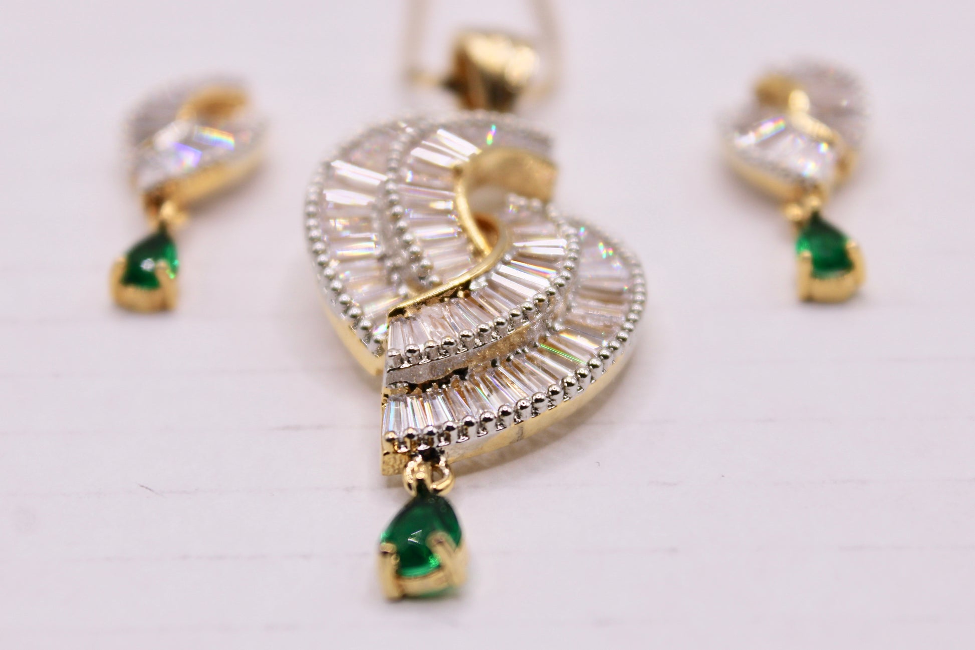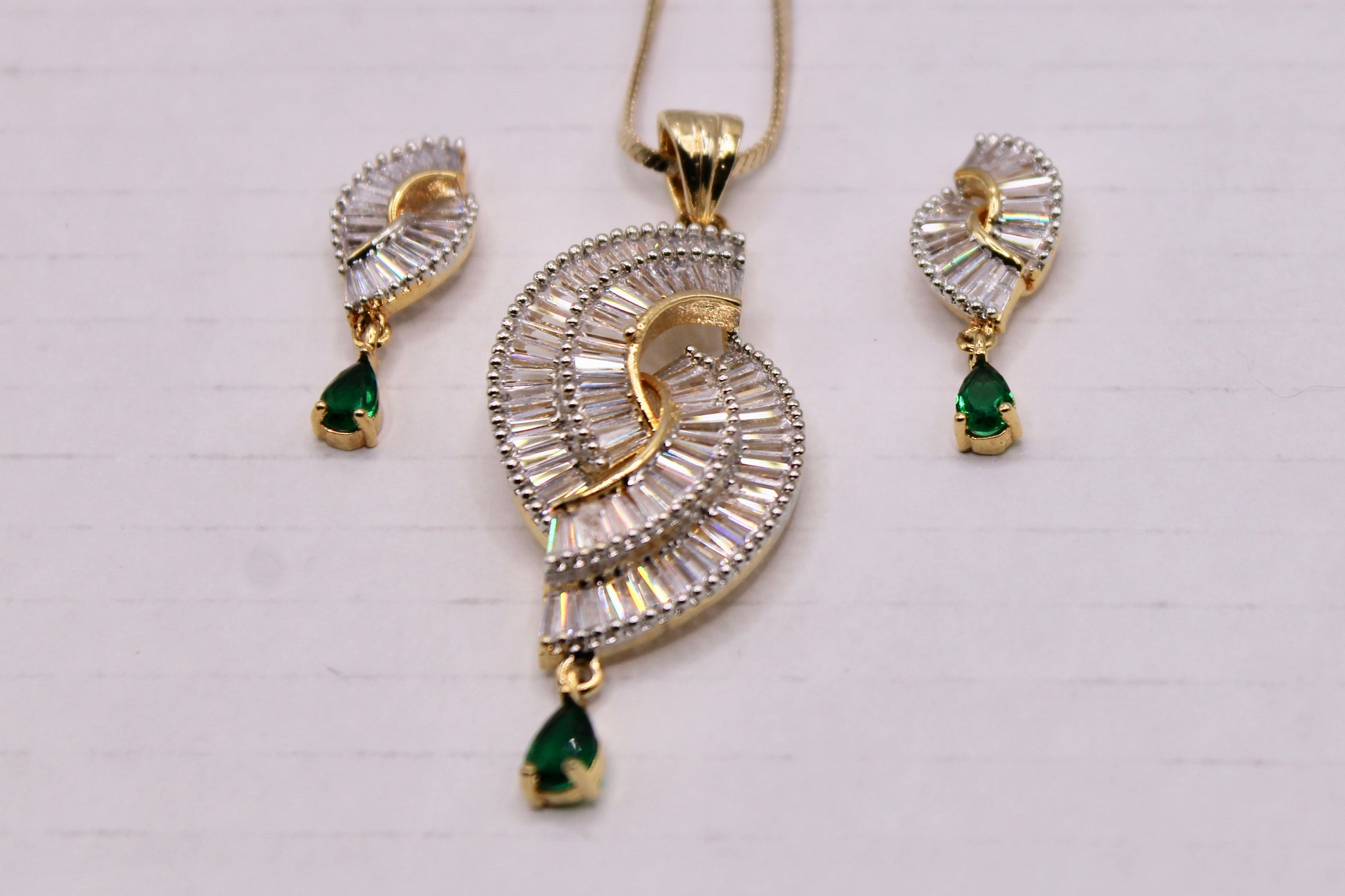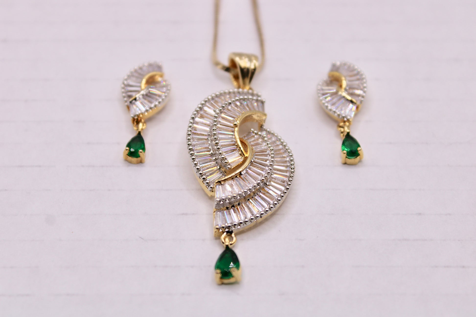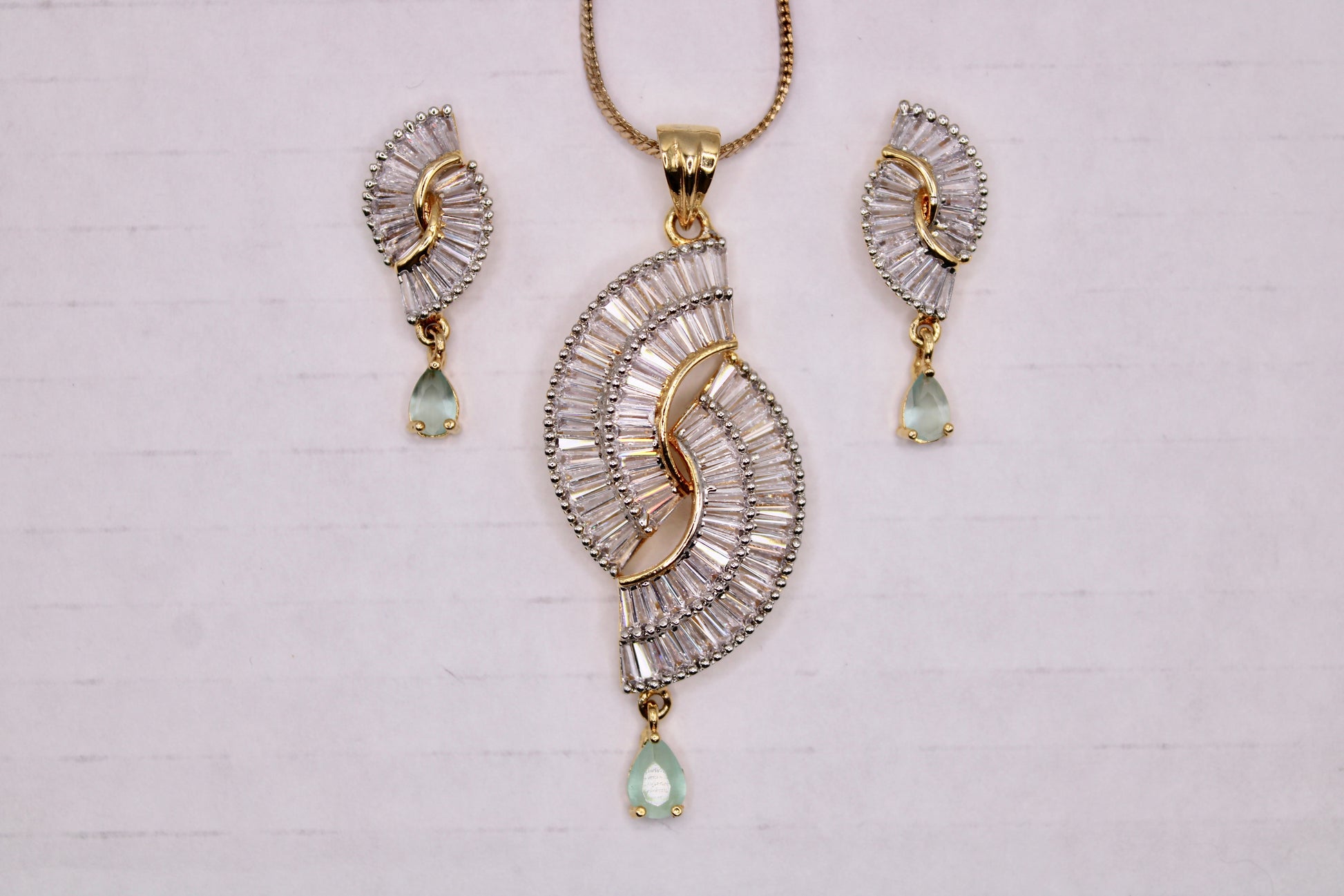 یہ نازک سیٹ پنسل کٹ کیوبک زرکونیا کے ساتھ مکمل ہے۔ یہ خوبصورت سیٹ مماثل جڑوں اور ایک زنجیر کے ساتھ مکمل ہے۔ سبز اور پودینہ سبز میں دستیاب ہے۔ مصنوعات کی زندگی بھر میں اضافہ کرنے کے لیے پیتل سے بنا ہے۔