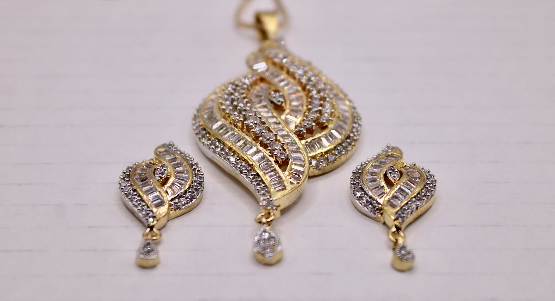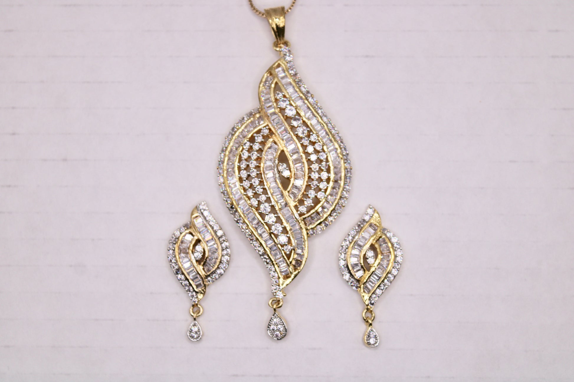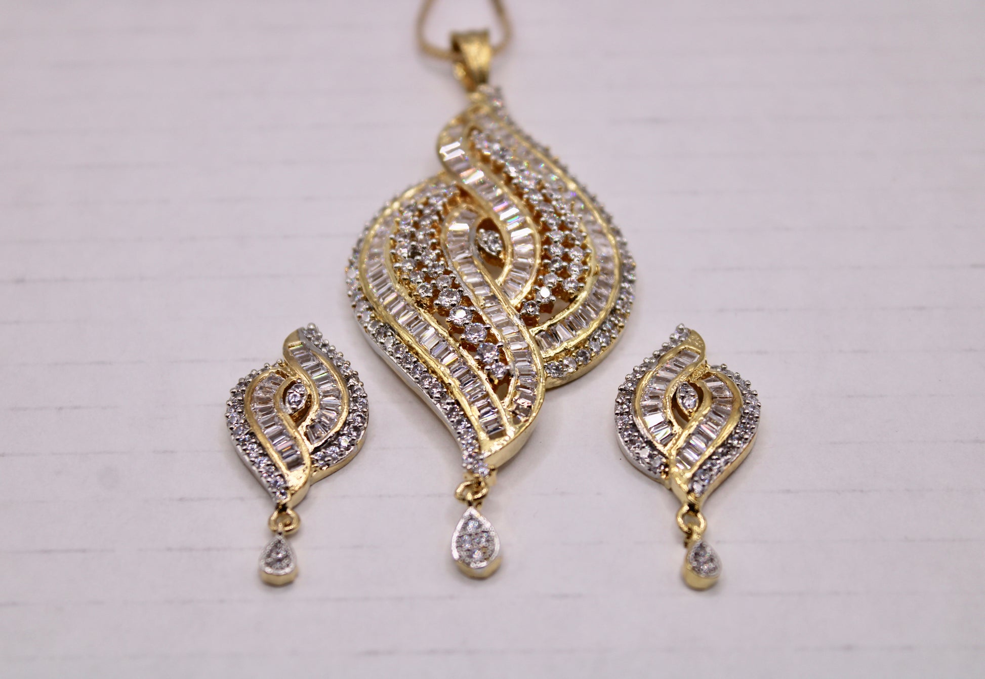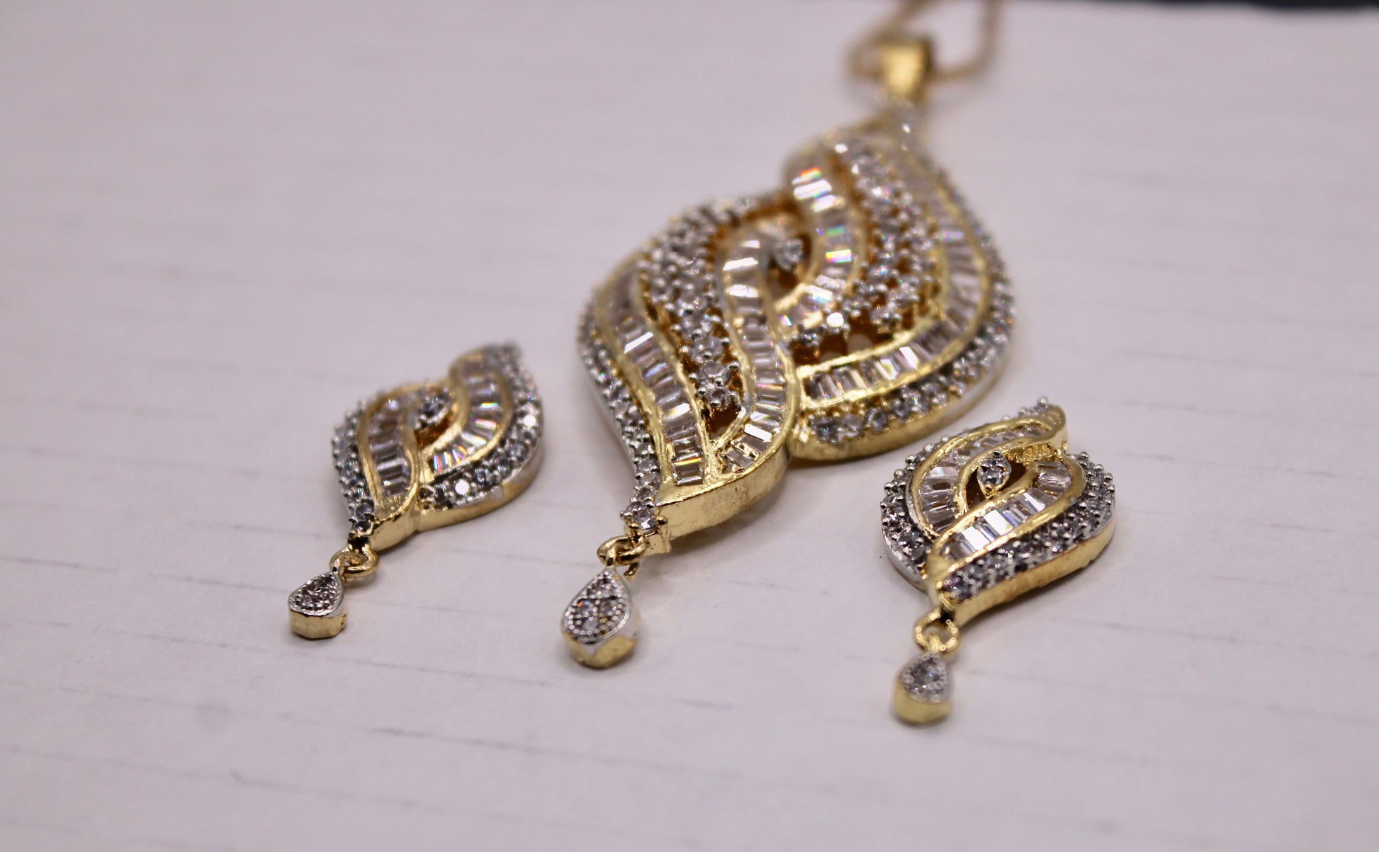 یہ حیرت انگیز طور پر خوبصورت لٹکن سیٹ کیوبک زرکونیا کی تفصیلات کے ساتھ مکمل ہے۔ یہ سیٹ روزانہ کی شکل کے لیے بہترین ہے، اس میں مماثل جڑیں اور چین شامل ہیں۔ مصنوعات کی زندگی بھر میں اضافہ کرنے کے لیے پیتل سے بنا ہے۔