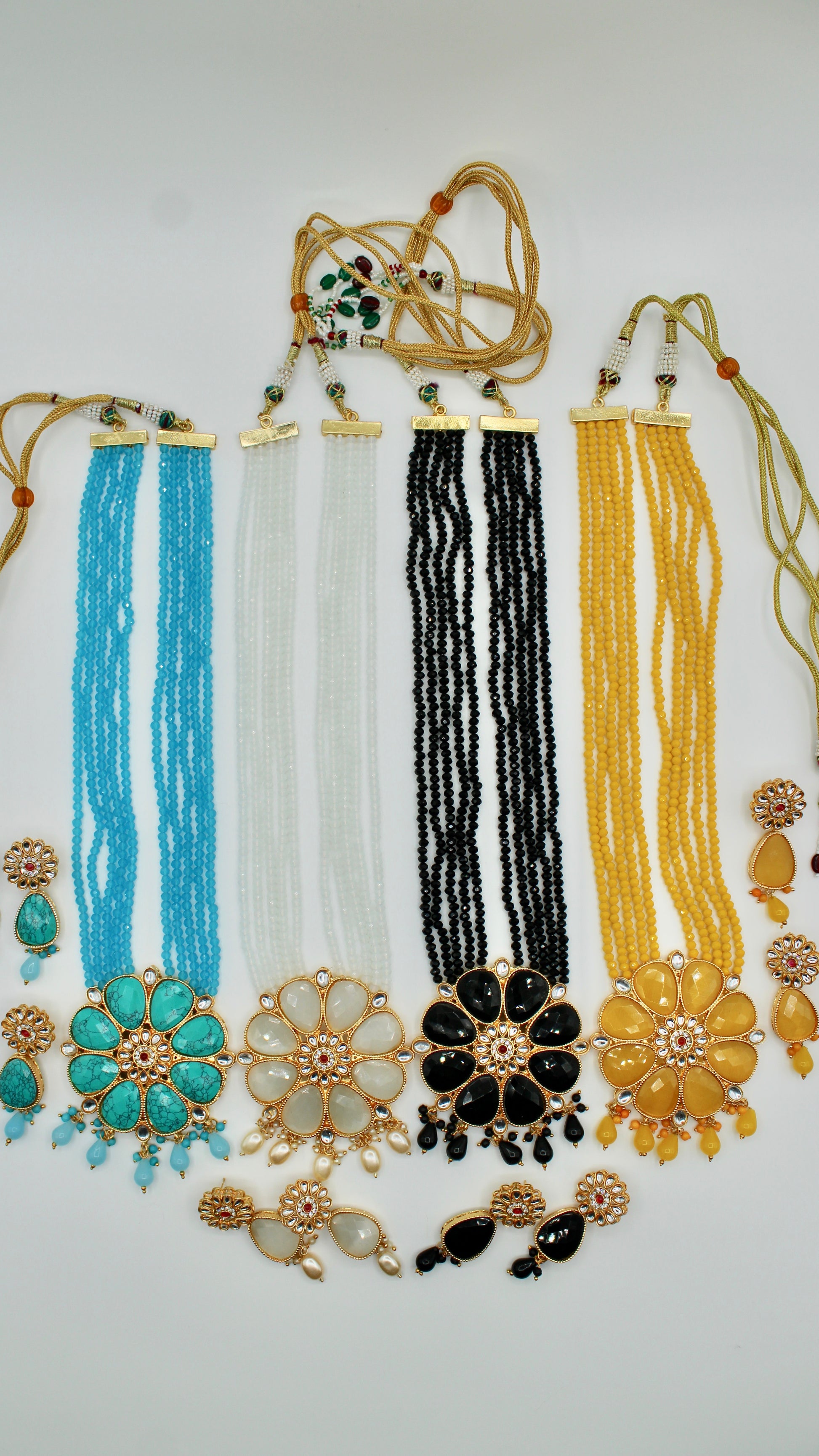 یہ عصری مالا شیشے کے کٹے ہوئے پتھروں اور کرسٹل موتیوں کی تہوں سے بنائے گئے ہیں۔ ہر سیٹ میں مماثل بالیاں شامل ہیں۔ مصنوعات کی زندگی بھر میں اضافہ کرنے کے لیے پیتل سے بنا ہے۔