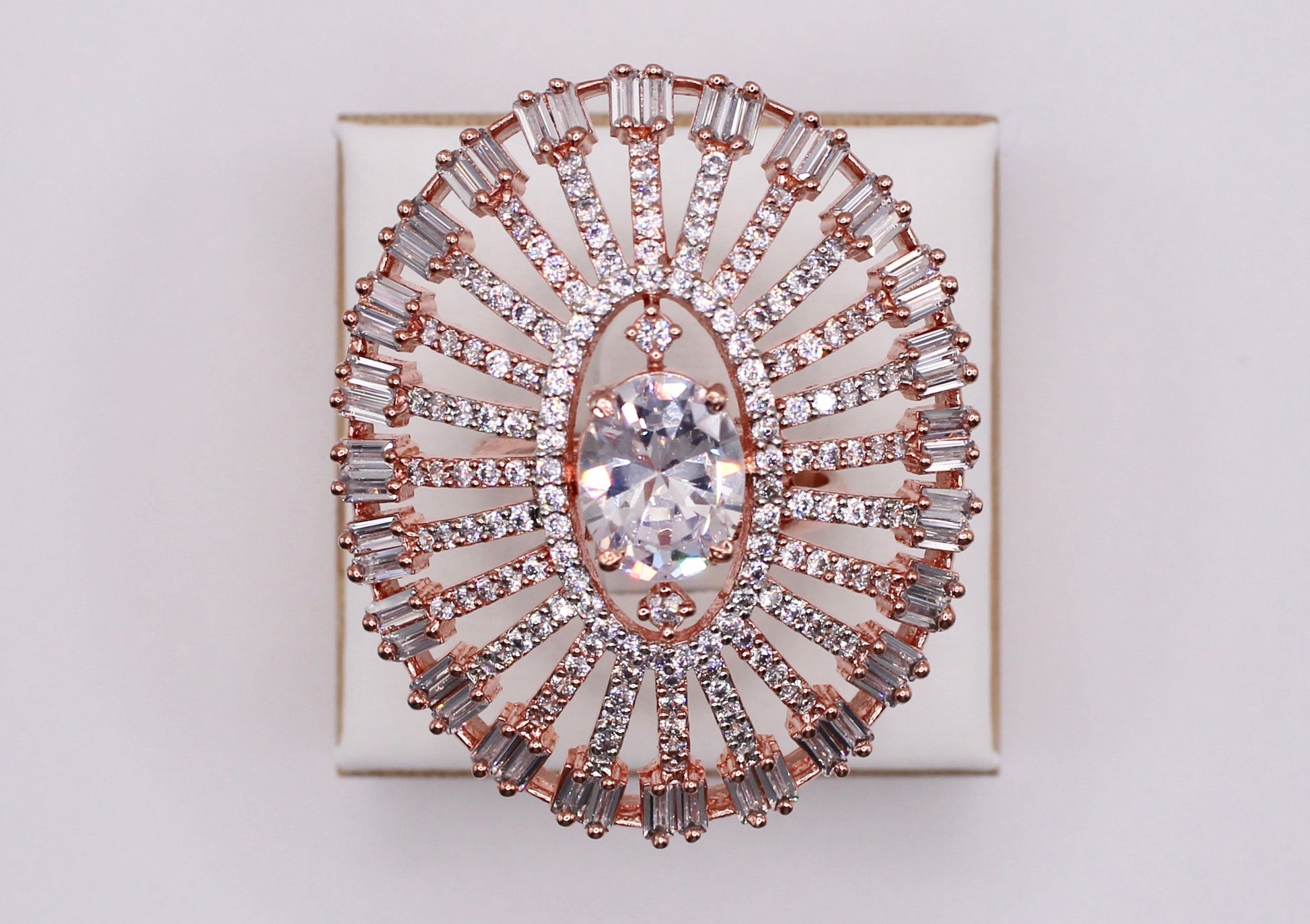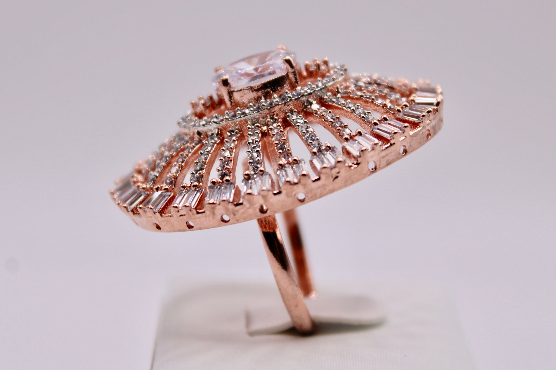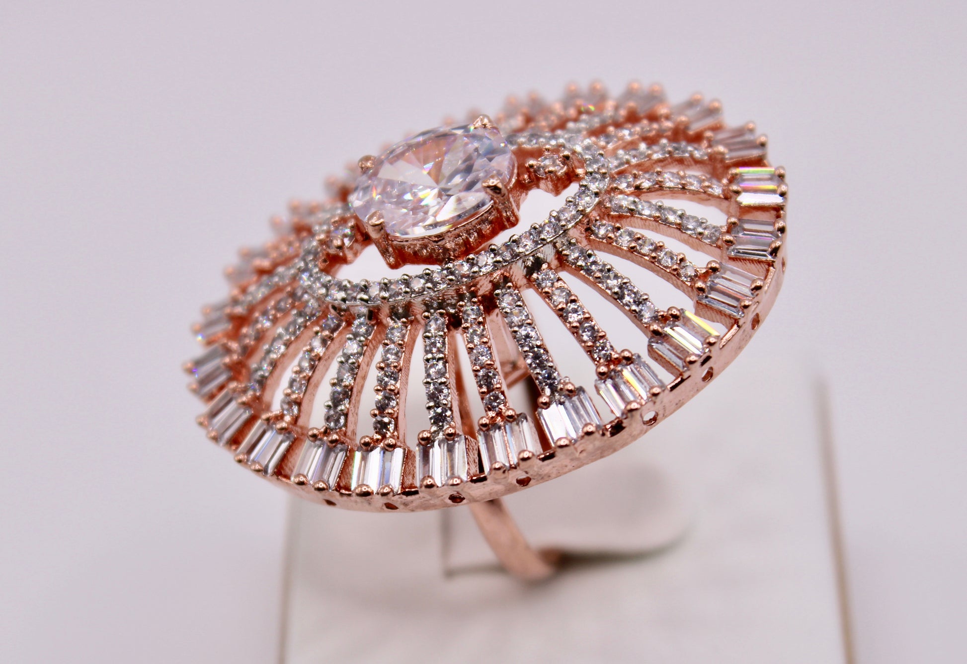 یہ گلیمرس کاک ٹیل کی انگوٹھی کیوبک زرکونیا کی قطاروں سے بنائی گئی ہے۔