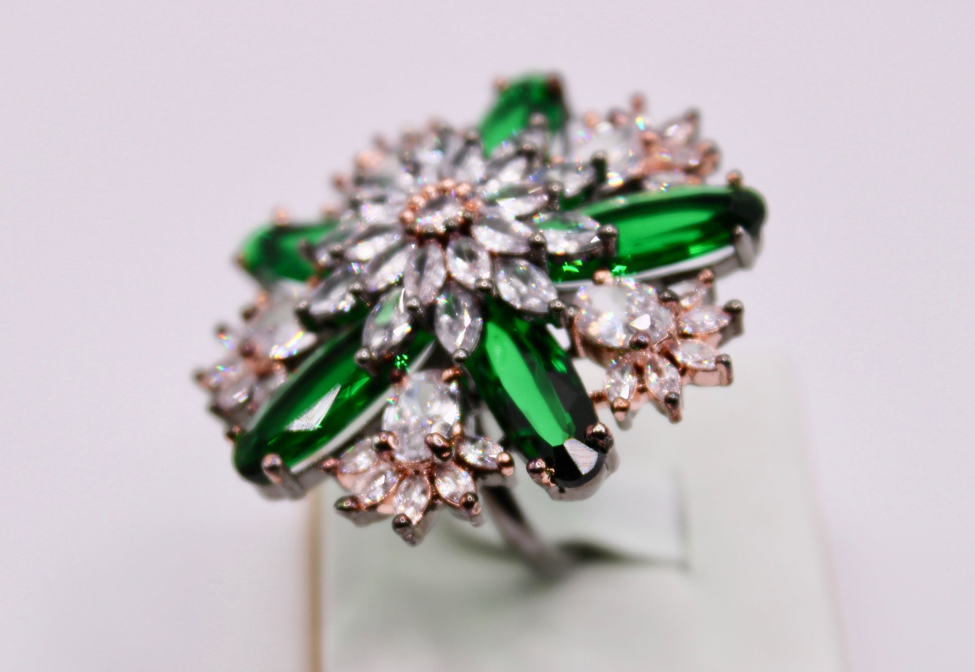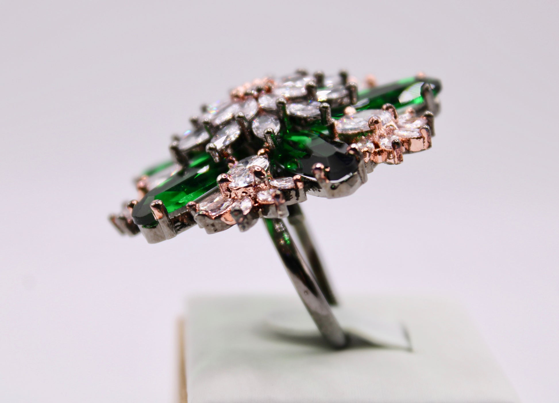 یہ شاندار کاک ٹیل کی انگوٹی کیوبک زرکونیا کے ساتھ مکمل ہے جس میں مختلف قسم کے کٹس ہیں، اور پروڈکٹ کی زندگی کو بڑھانے کے لیے اسے پیتل سے بنایا گیا ہے۔