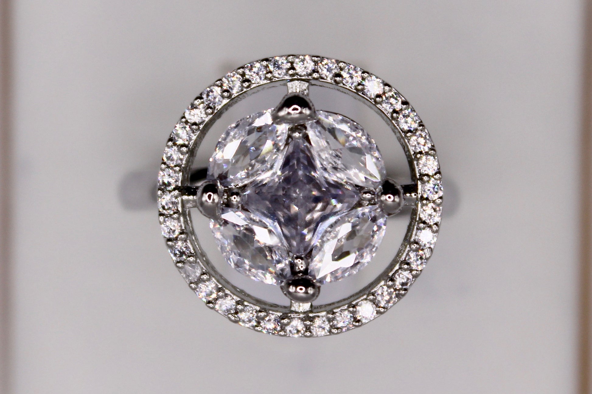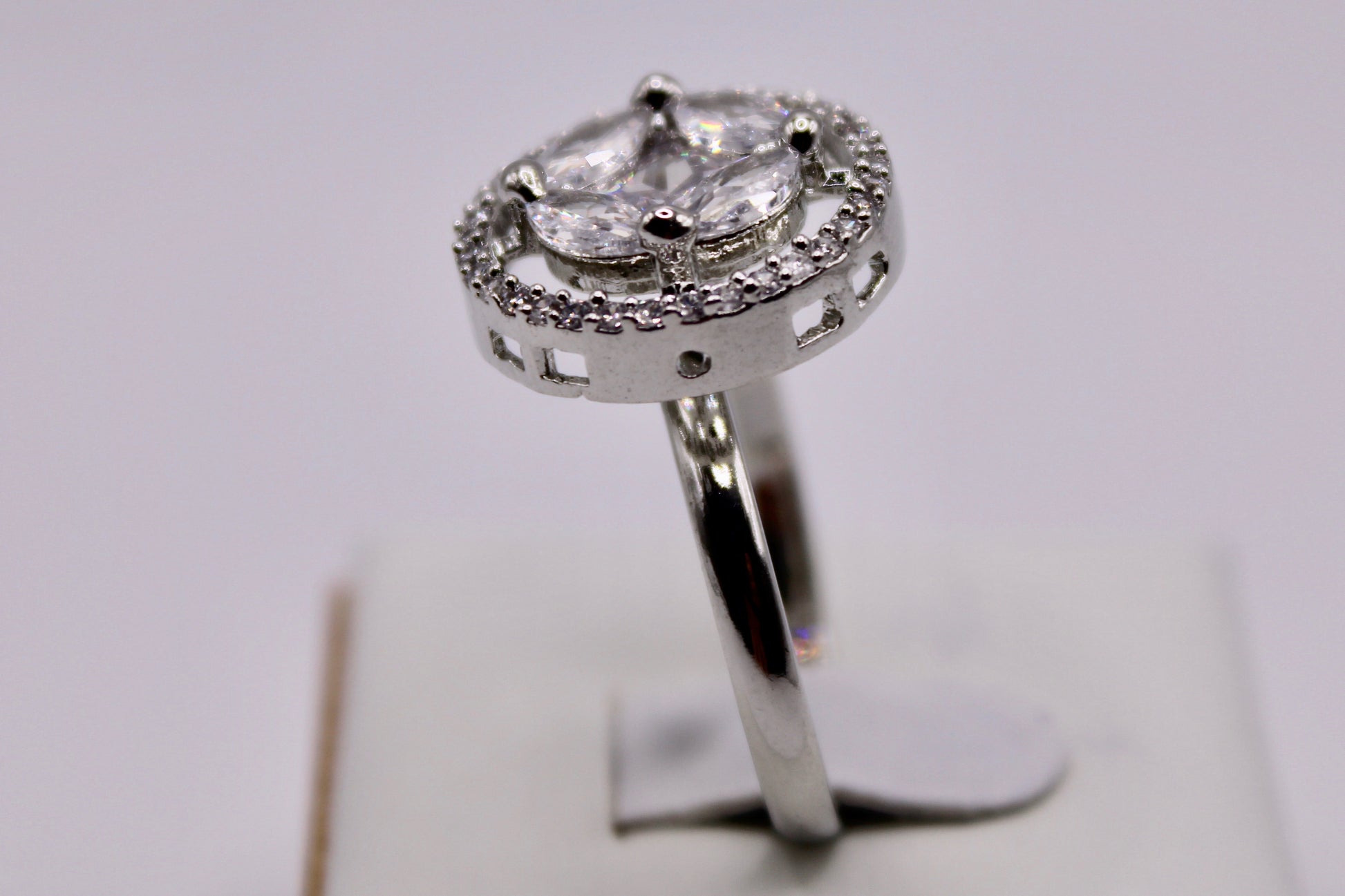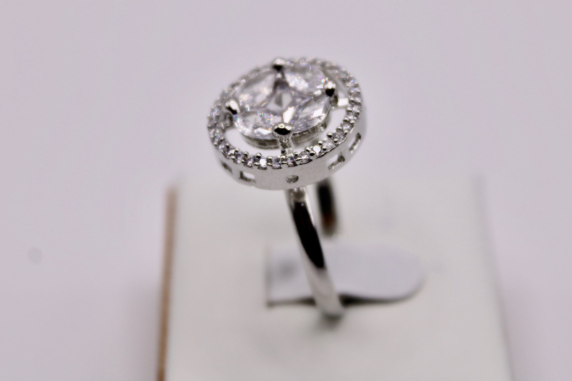 یہ انگوٹھی کیوبک زرکونیا کے ساتھ مکمل ہے اور ہالو ڈیزائن میں خوبصورتی سے گھری ہوئی ہے۔ مصنوعات کی زندگی بھر میں اضافہ کرنے کے لیے پیتل سے بنا ہے۔
