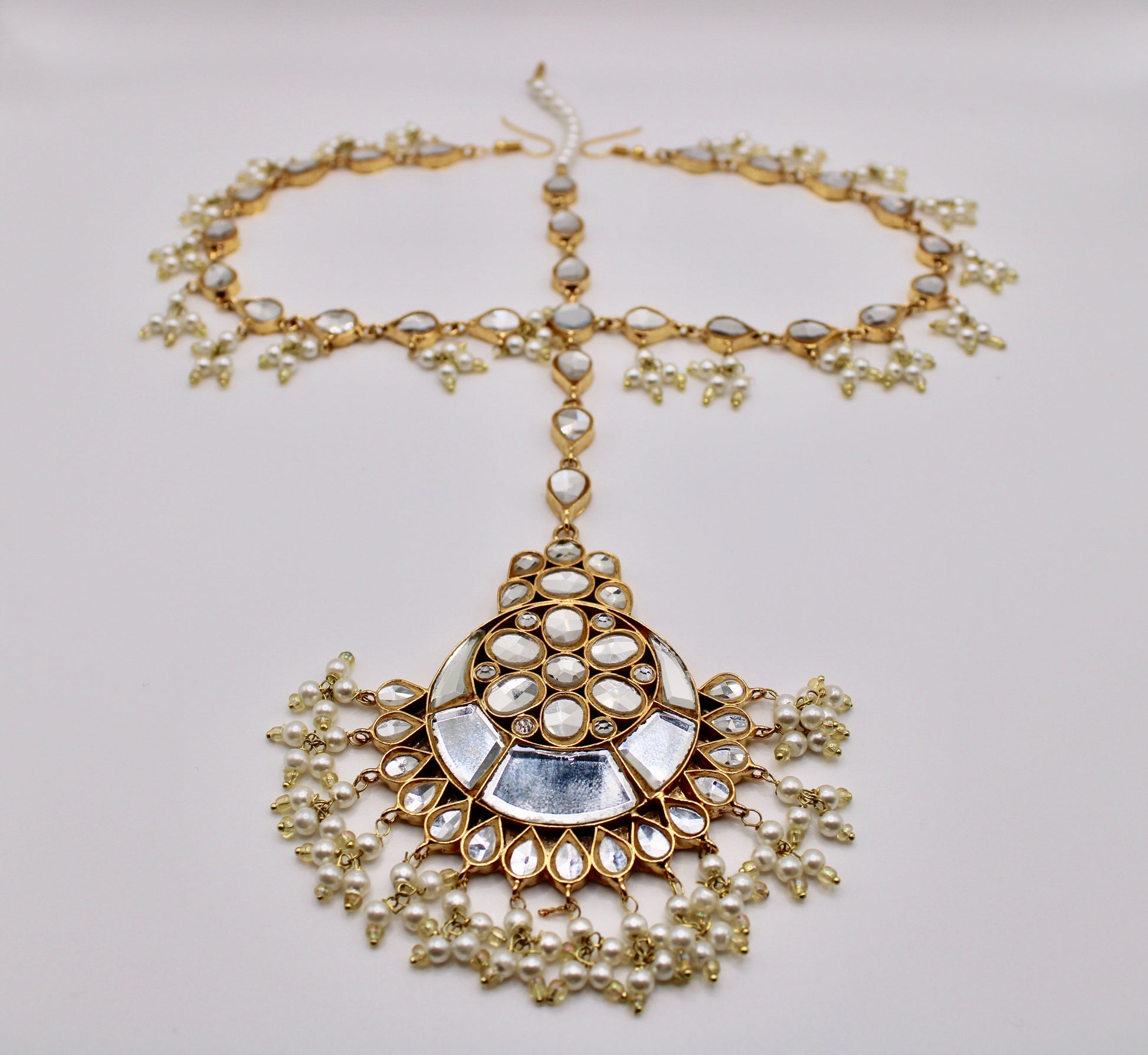 This delicate sheesha kundan mathha pati is complete with faux pearl detailing. It is the perfect addition to any bridal or party-wear look.