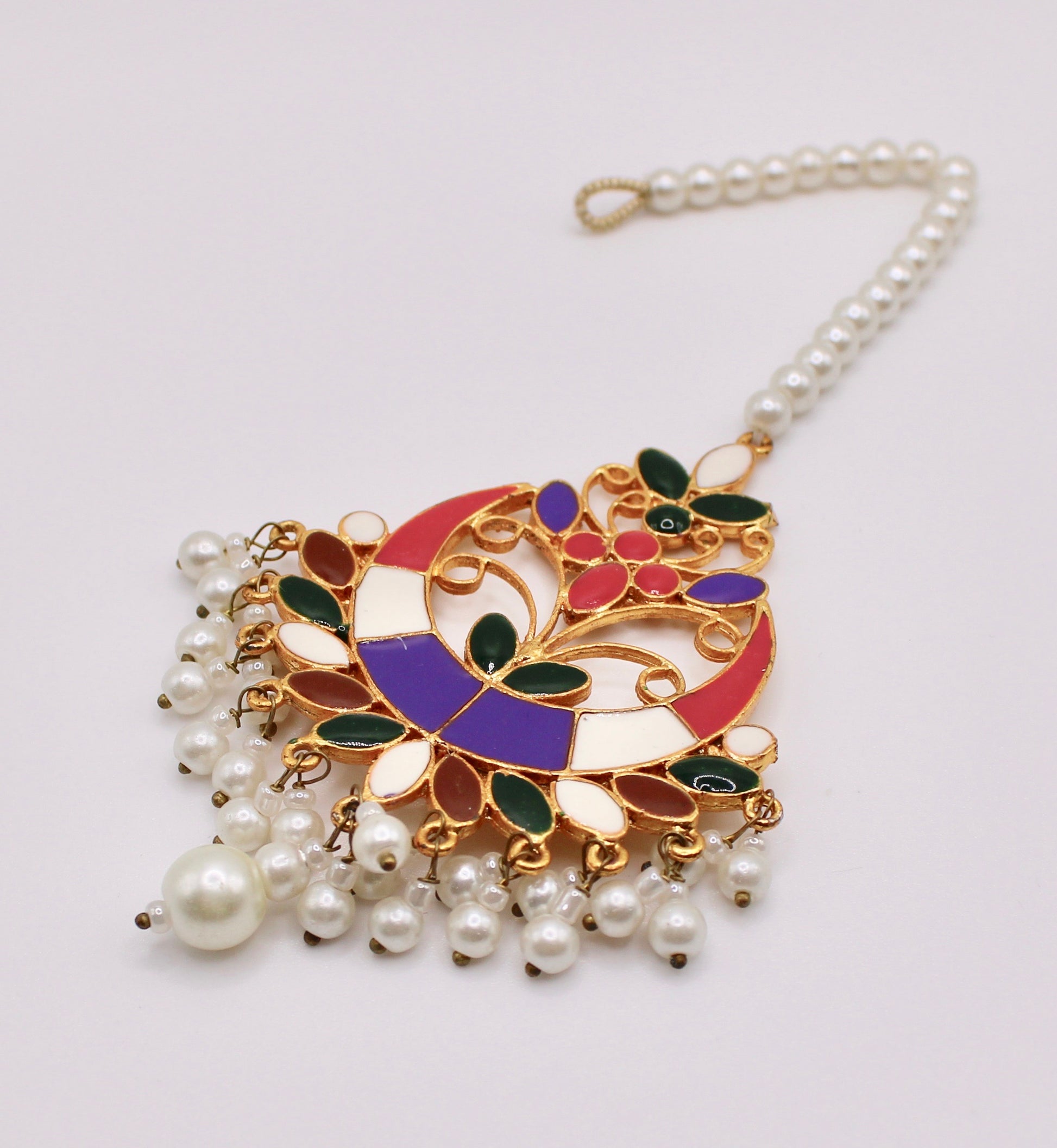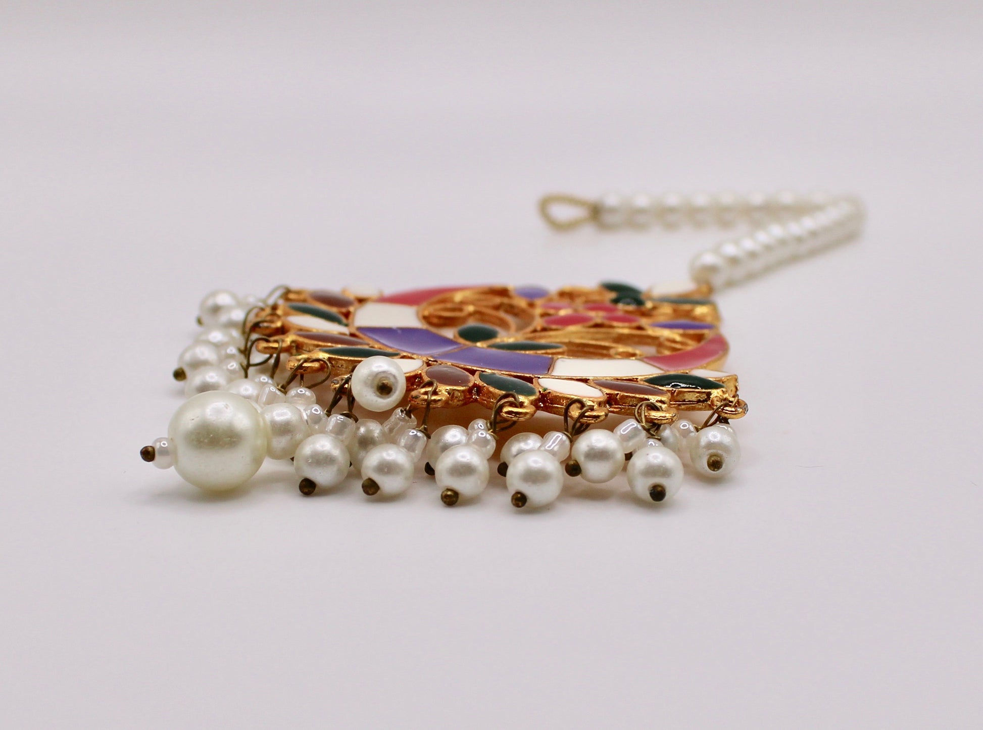 This stunning meena teeka is complete with faux pearl detailing throughout. It is truly a unique find.