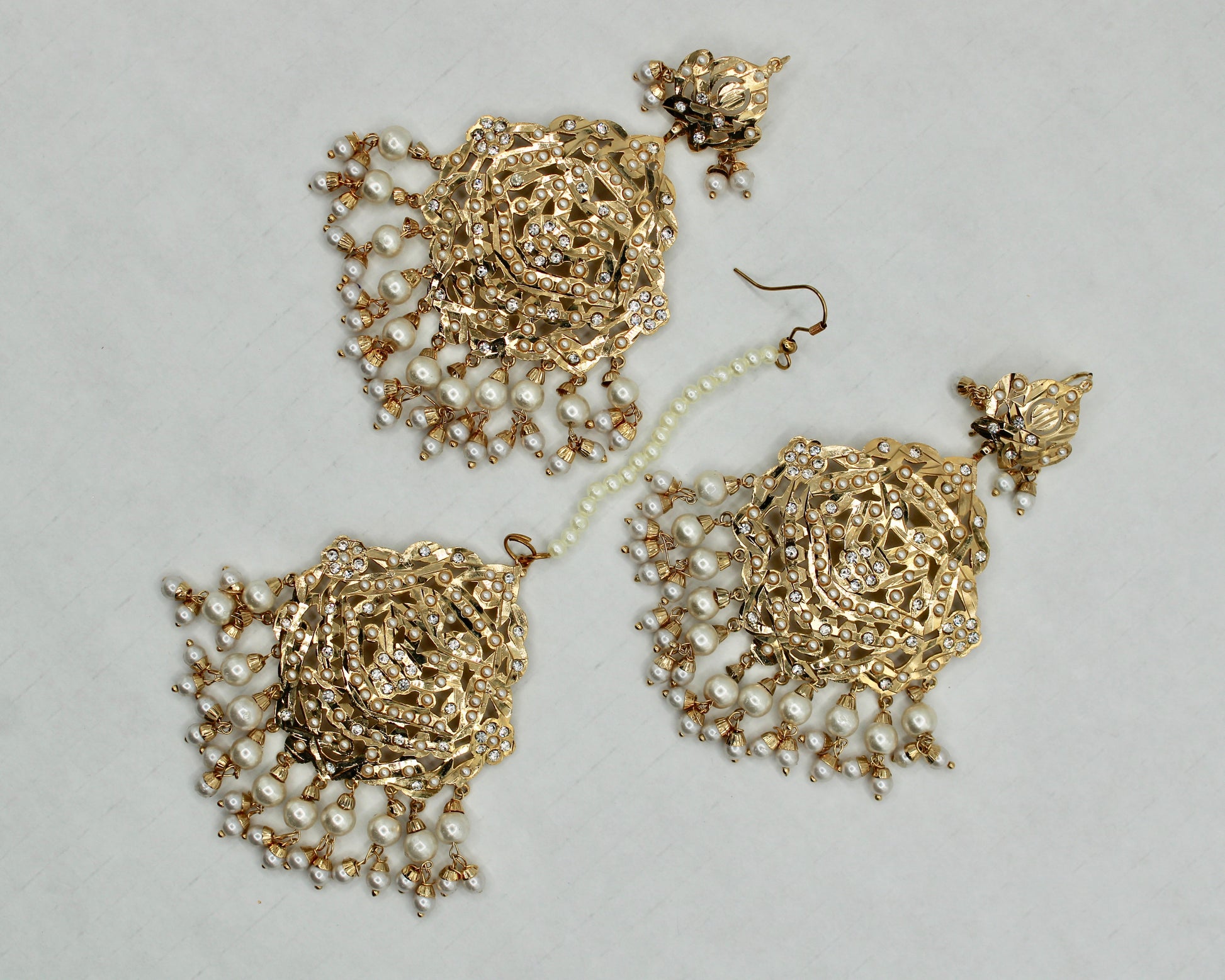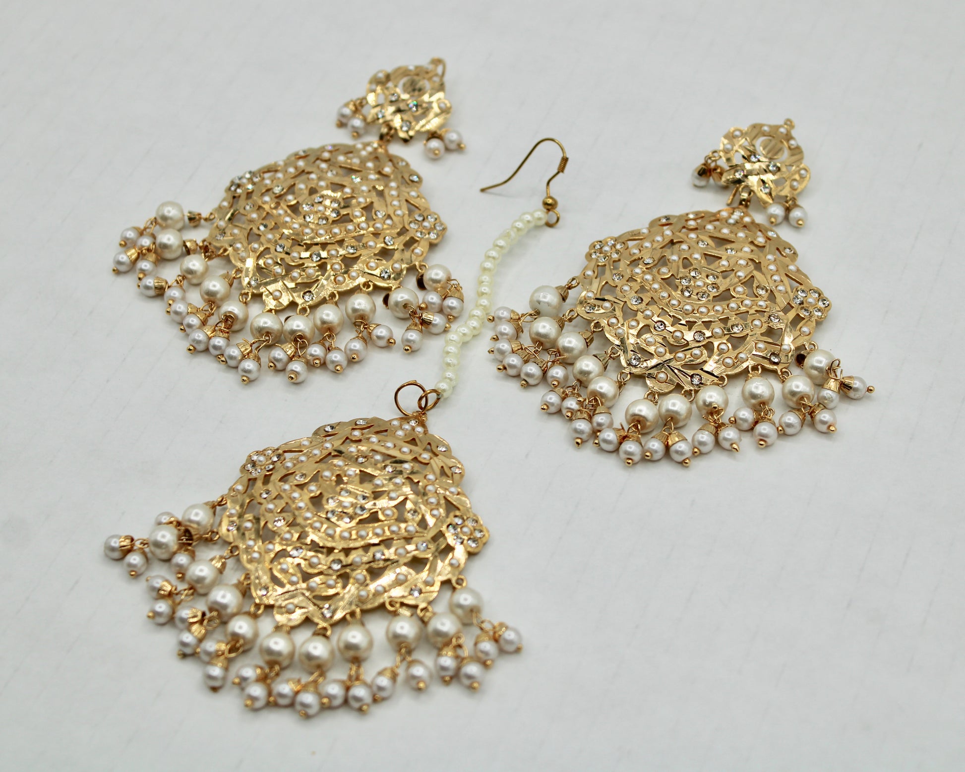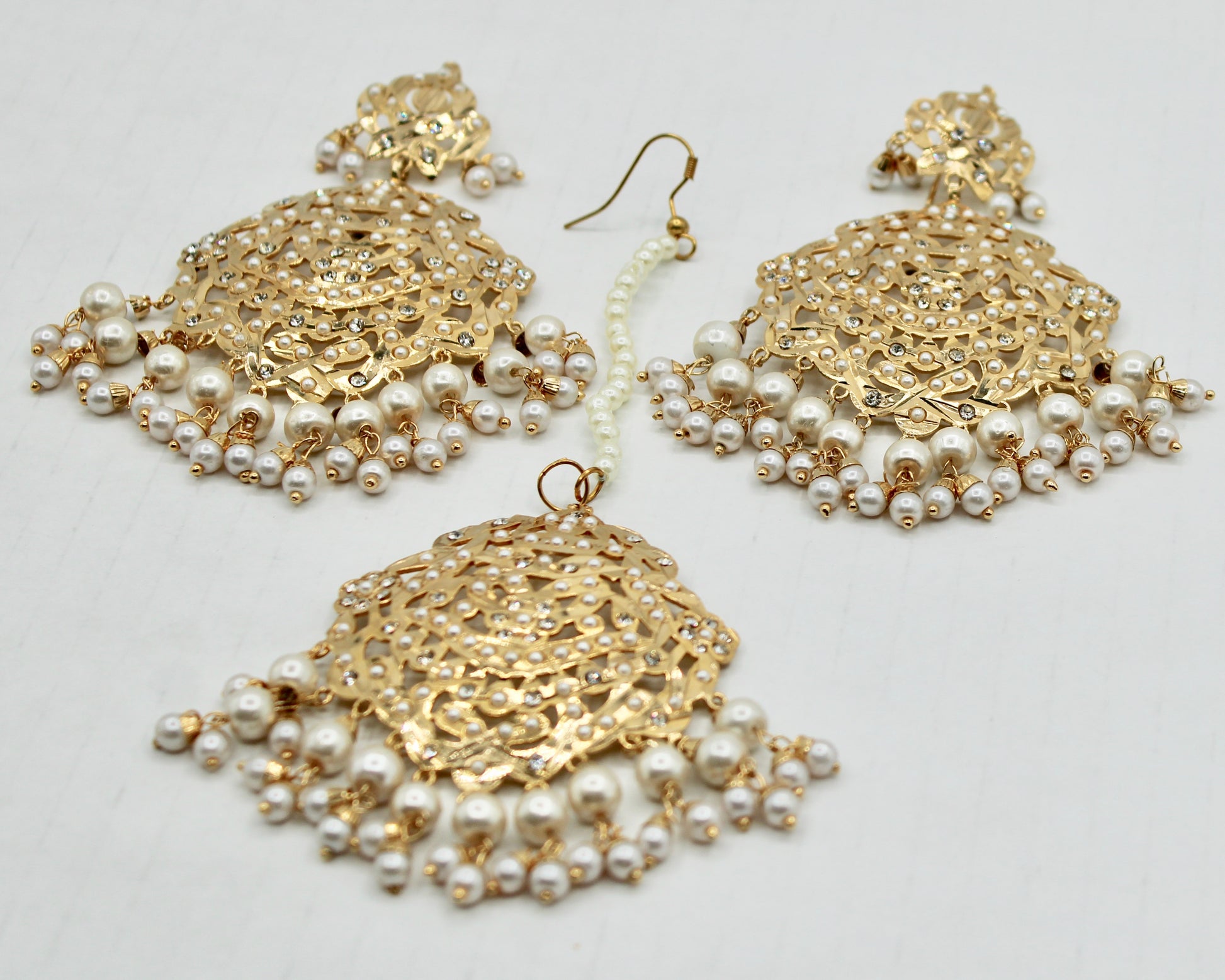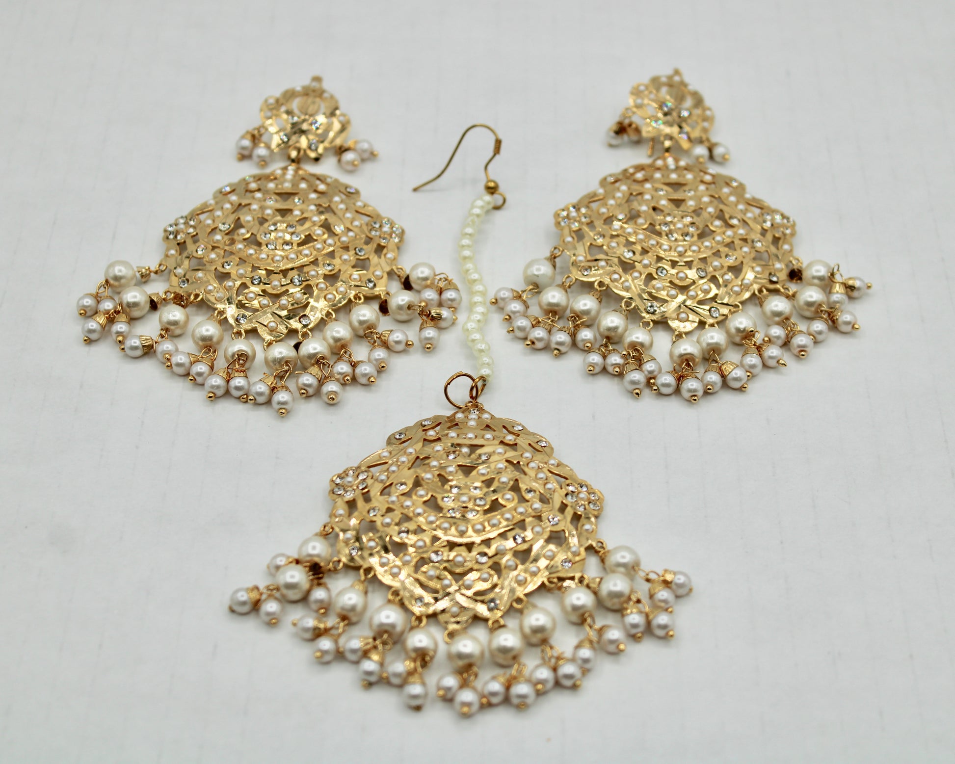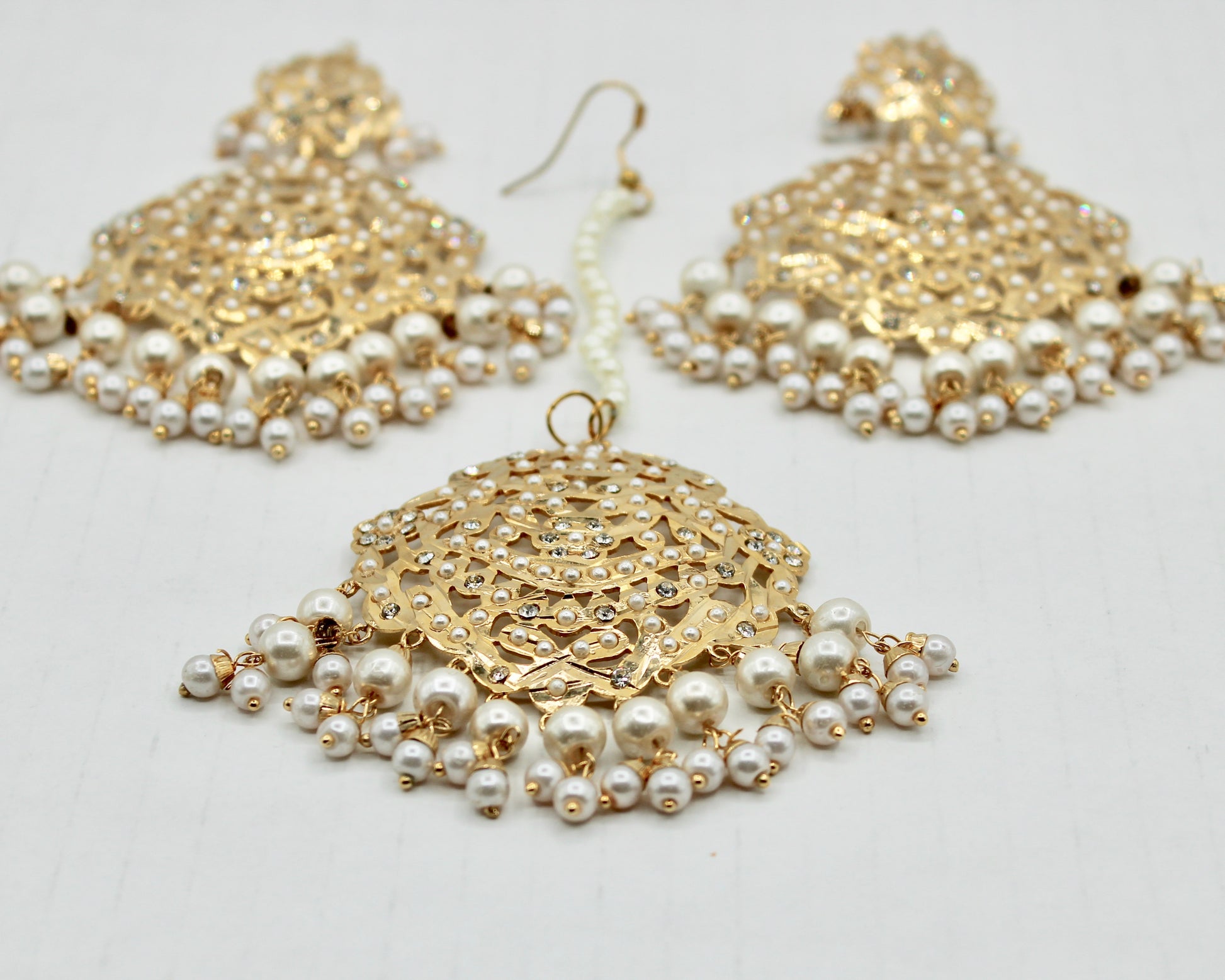 یہ روایتی حیدرآبادی ٹیکا سیٹ غلط موتیوں کی تفصیل کے ساتھ مکمل ہے، اور اس میں مماثل بالیوں کے ساتھ ایک ٹیکا بھی شامل ہے۔ یہ سیٹ کسی بھی لباس کو اوپر یا نیچے کرنے کے لیے بہترین اضافہ ہے!