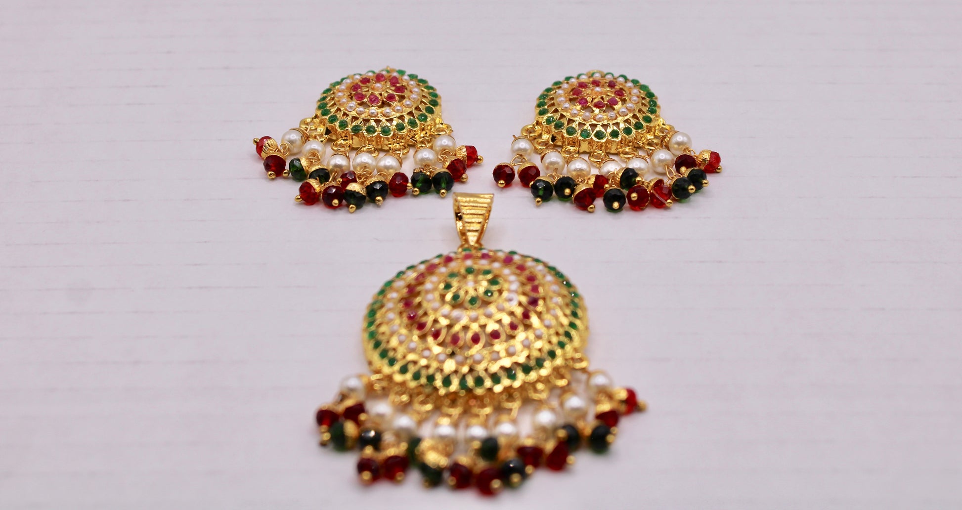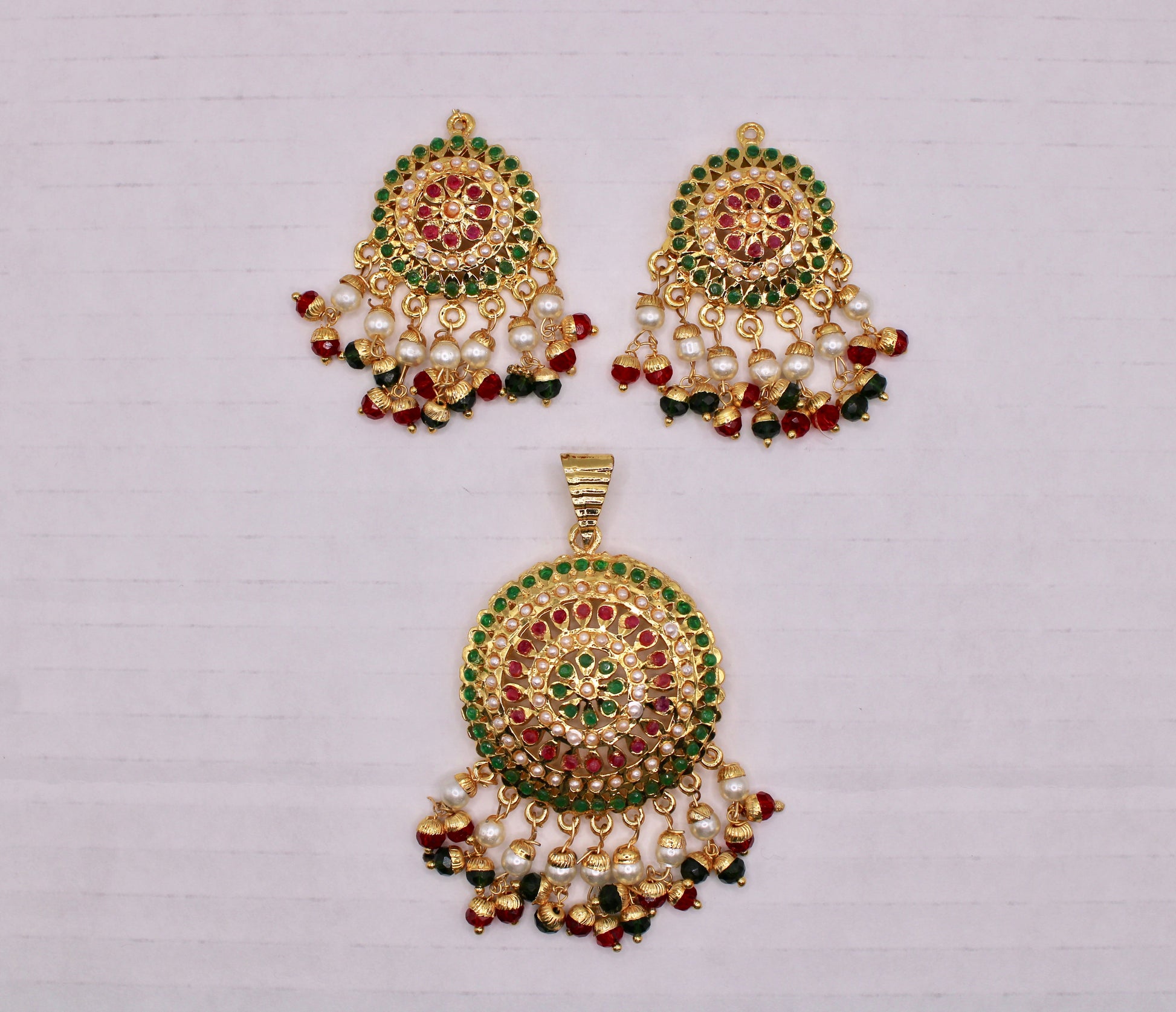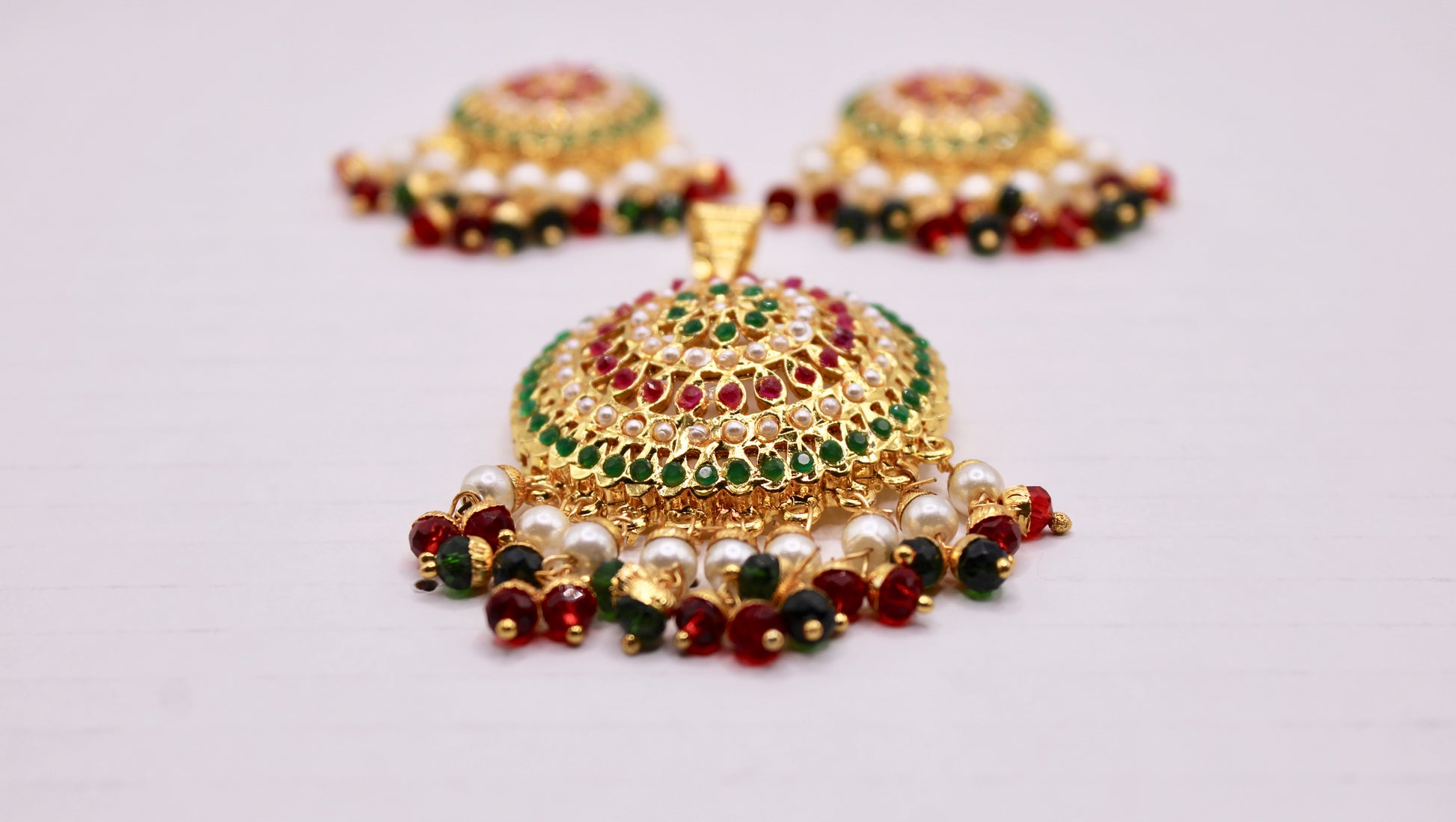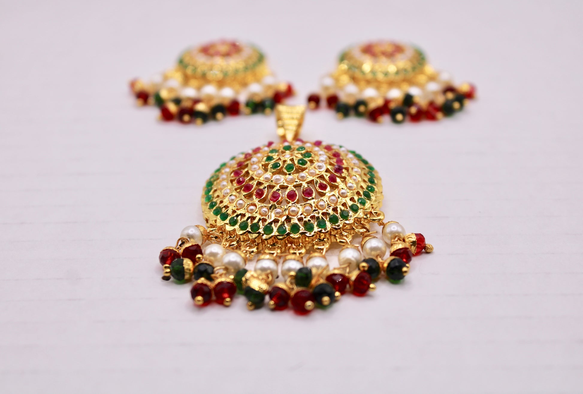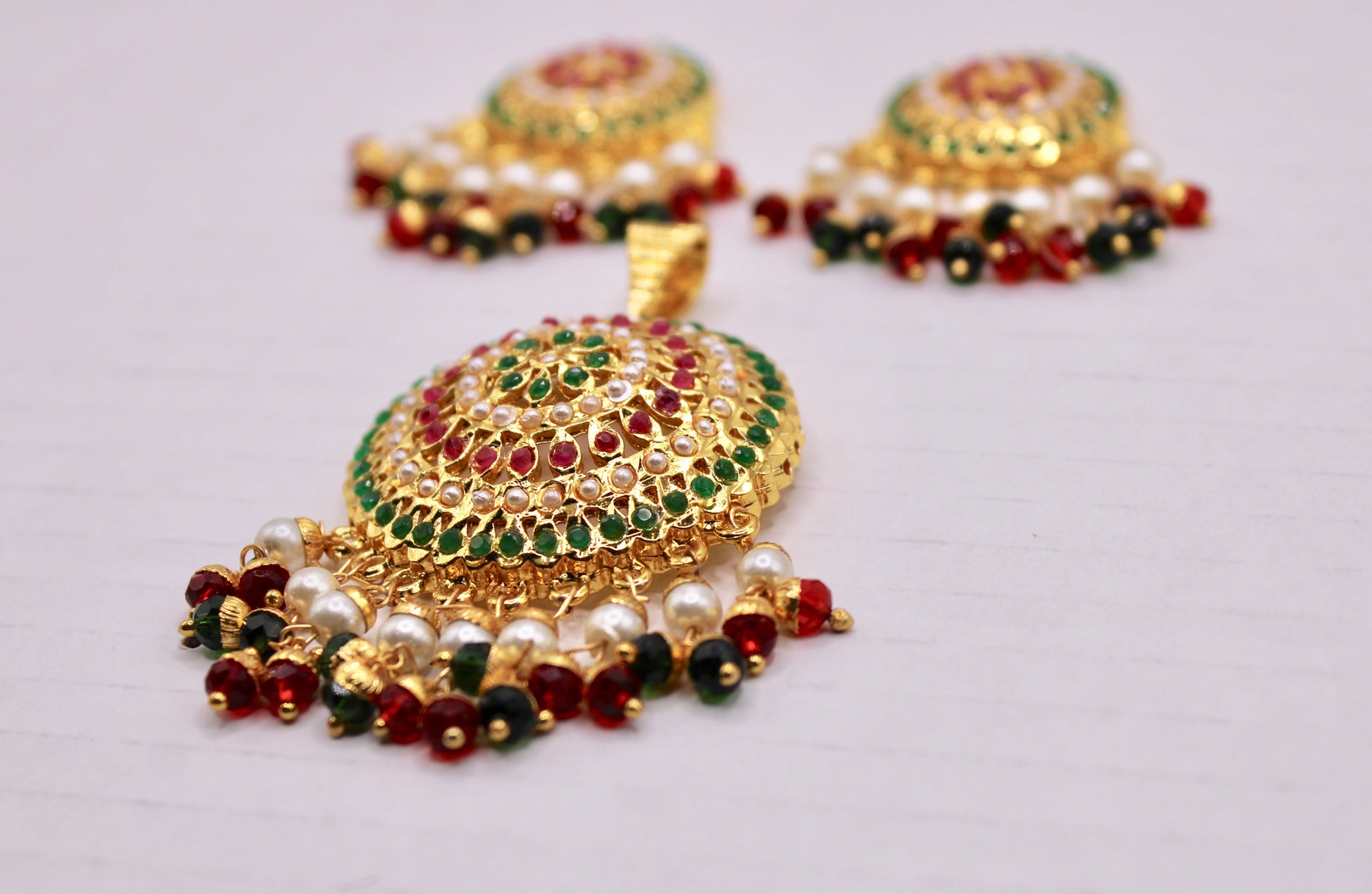 یہ شاندار ٹیکا سیٹ روایتی پنجابی انداز میں بنایا گیا ہے، اور غلط موتی اور مالا کی تفصیل کے ساتھ مکمل ہے۔ یہ کثیر رنگ ہے اور کسی بھی شکل کو بلند کرے گا۔
